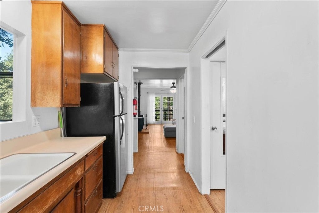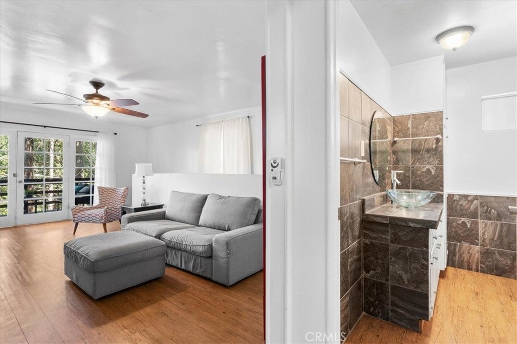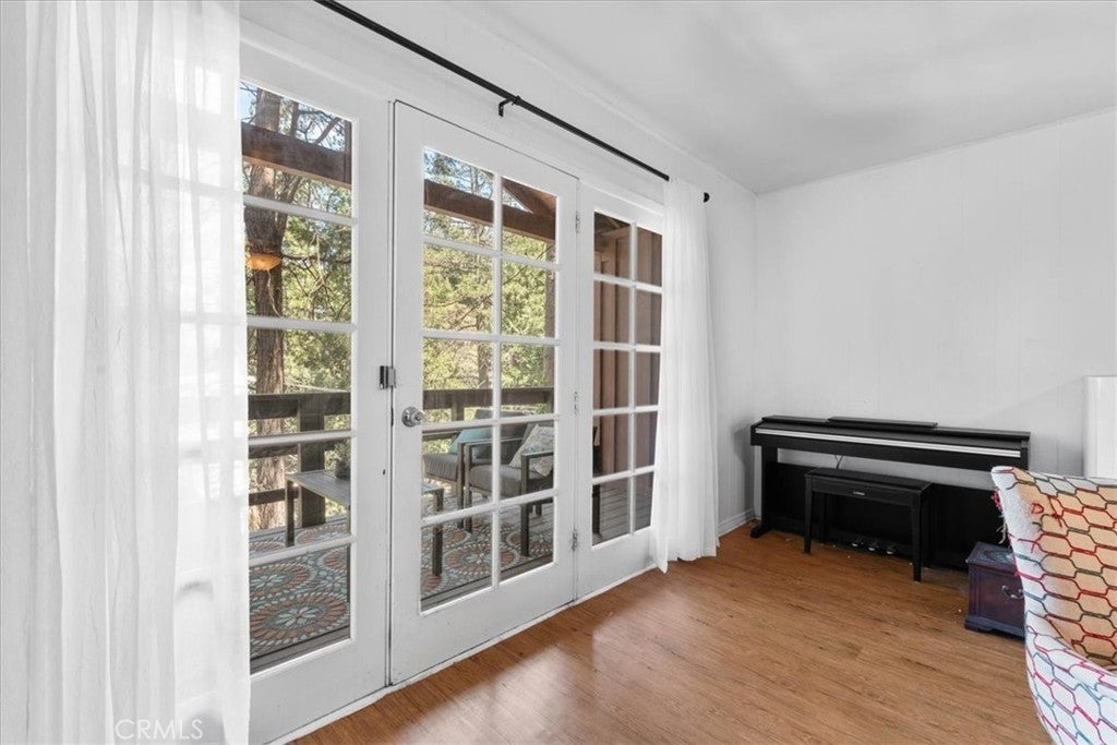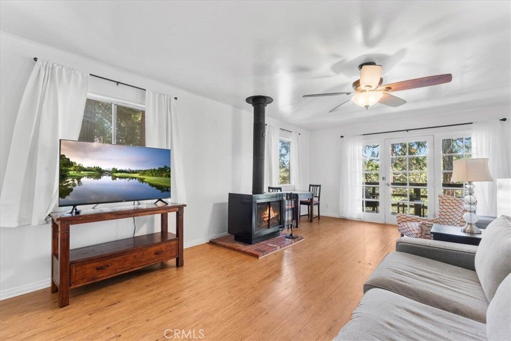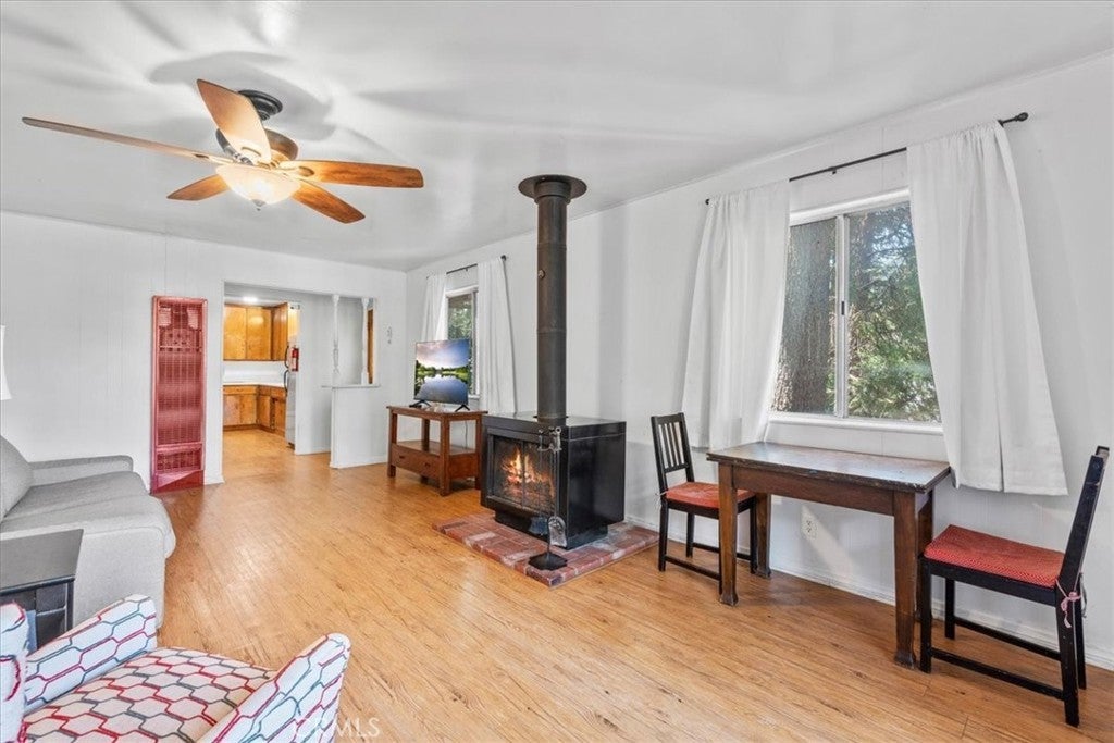 WELCOME TO THE BIRD HOUSE — Charming Crestline Mountain Retreat. Discover comfort, character, and stunning natural surroundings in this inviting multi-level home tucked away in the Crestline mountains. Designed to capture the beauty of its setting, this property offers a peaceful escape while remaining close to town conveniences and year-round recreation. The entry level features a private bedroom with convenient access to the basement, offering flexibility for guests, a home office, storage, or potential expansion. Upstairs, the bright and open main living area includes a second bedroom, a beautifully remodeled bathroom, and a well-appointed kitchen equipped with newer stainless steel appliances. The living room is centered around a classic wood-burning stove, creating a warm and cozy atmosphere during cool mountain evenings. Step outside onto the balcony and enjoy sweeping views of the surrounding forest and mountains—a perfect spot for morning coffee, sunset watching, or quiet relaxation. The home sits on a spacious, secluded lot surrounded by mature trees, providing privacy and a true mountain-living experience. Private walking trails wind through the property, ideal for peaceful nature strolls, exploring, or simply breathing in the fresh mountain air. A large deck offers additional outdoor space for entertaining or unwinding while taking in the natural beauty of the area. Additional features include ceiling fans throughout the home for year-round comfort and a layout that maximizes both indoor and outdoor living options. Located just minutes from Lake Gregory and downtown Crestline, the property offers easy access to local dining, shops, and a wide variety of seasonal activities. Enjoy hiking, fishing, swimming, and paddle boarding during the warmer months, and take advantage of nearby skiing and snowboarding in winter. Crestline’s vibrant community events—such as Jubilee Days, the annual 4th of July parade, and weekly farmers markets—add to the appeal of this charming mountain town. As an added bonus, this home offers front-row views of the spectacular Fourth of July fireworks over Lake Gregory, providing a unique and memorable experience right from the property. Whether you’re searching for a full-time residence, a relaxing vacation retreat, or an attractive investment opportunity, The Bird House is a special find that beautifully blends comfort, nature, and mountain charm.