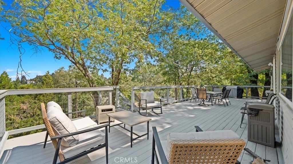 Charming Mountain Cabin Retreat!! Welcome to this beautifully, 3 bedroom, 2 bathroom mountain cabin, featuring a brand new, oversized Trex wrap-around deck, perfect for entertaining and soaking in the stunning panoramic views. This cozy retreat offers high ceilings and comes mostly furnished, making it move-in ready for your weekend getaways or full-time living. Enjoy year-round comfort with the newly installed HVAC system, controllable via smart technology. The home also features brand new Apex piping throughout, designed to withstand freezing temperatures in the winter. Additional upgrades include a new kitchen sink, garbage disposal, modern faucet. Ceiling fans in all rooms, and a remodeled half bathroom. Security screens on both the front and back doors offer added natural light, while the property also includes additional storage. With no home directly below, you’ll enjoy an unobstructed view of the mountains and Lake Gregory just down the hill. Don’t miss the opportunity to own this peaceful mountain escape with thoughtful the unbeatable views!! ~ Must See ~