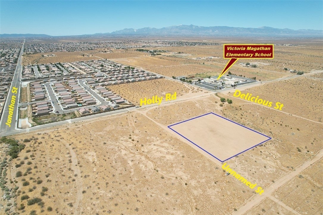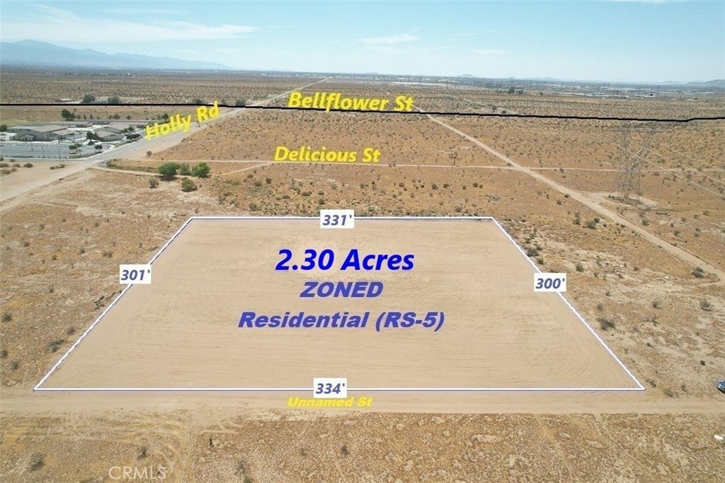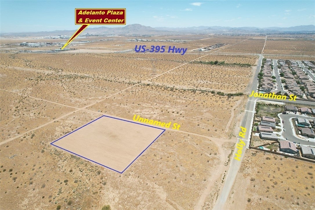 Great location and Investment Opportunity! Nice clean and flat 2.30 Acres of land, per City of Adelanto, CA, the property is zoned Single Family Residential (R-S5), According to the zone district is a single-family zone which permits detached residences at a density of up to five (5) units per gross acre, Electricity, Water and Sewer are on Holly Rd, approx 300 Ft south of the property, the lot has a street easement (Unnamed St) for access. Approximately 3500 ft, or 0.66 Mile West of Hwy 395., Dotted lines on the pictures are just estimated, and not the exact property lines, buyer to do their due diligence regarding property line, and utilities for more accurate distances and costs, GOOGLE MAP CORDINATES ARE: 34.544417, -117.411028, make your offer today.