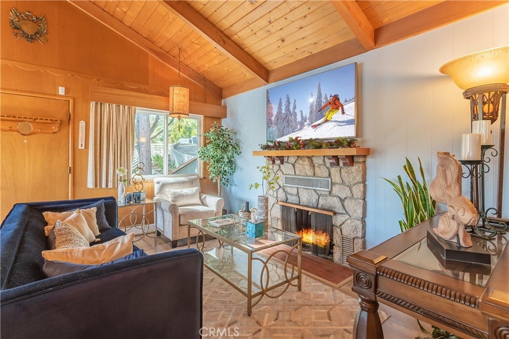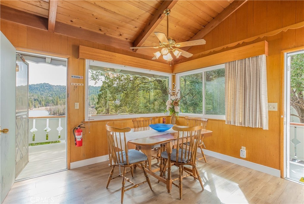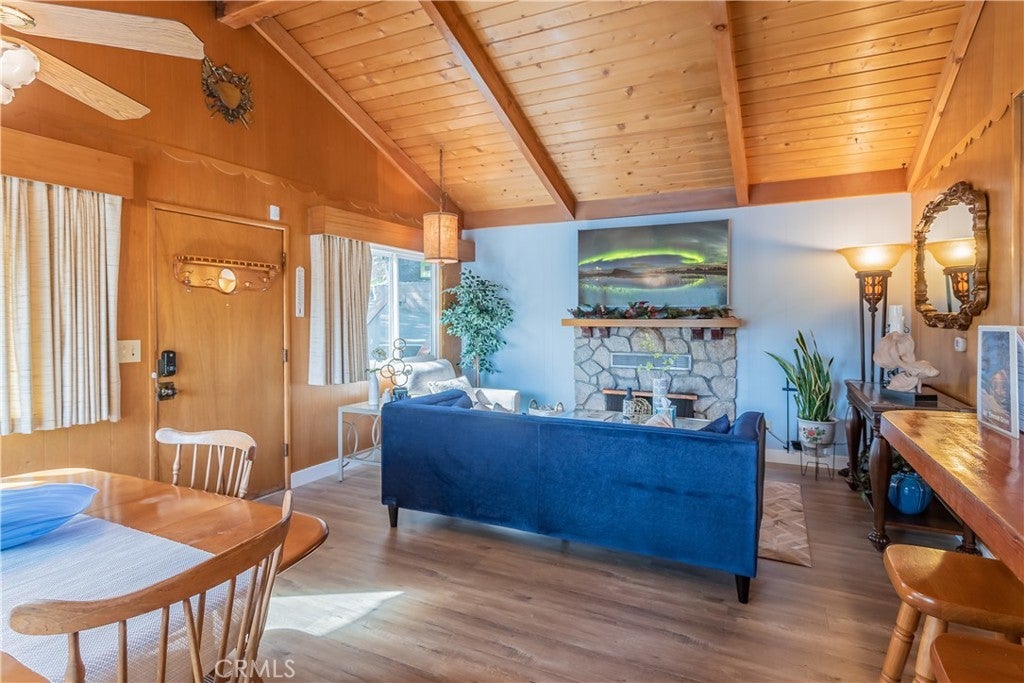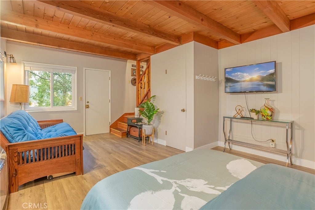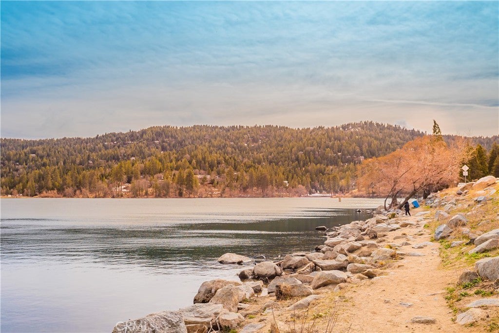 The best LAKE VIEW home in Crestline. It has FULLY FURNISHED with incredible LAKE and mountains VIEW. It offers 2 bedrooms, 2 baths plus a HUGE bonus room. The living room is warm and inviting with vaulted wood beams ceiling, and a wood-burning cozy fireplace. The open-concept kitchen with a bar counter flows seamlessly into the spacious dining area, where large picture windows frame the spectacular lake views. The deck is overlooking 180-degree views of Lake Gregory and mountain. Downstairs, a large bonus/game room and half bath provides excellent potential for guest or it can be use as 3rd bedroom. washer/dryer inside the house. This property is sold fully furnished and is a turn-key, mountain retreat package. Just a minutes from the lake and walking distance to Goodwin & sons’ supermarket, crestline village, shopping, and restaurants. This is the perfect vacation getaway home with year-round mountain sanctuary.