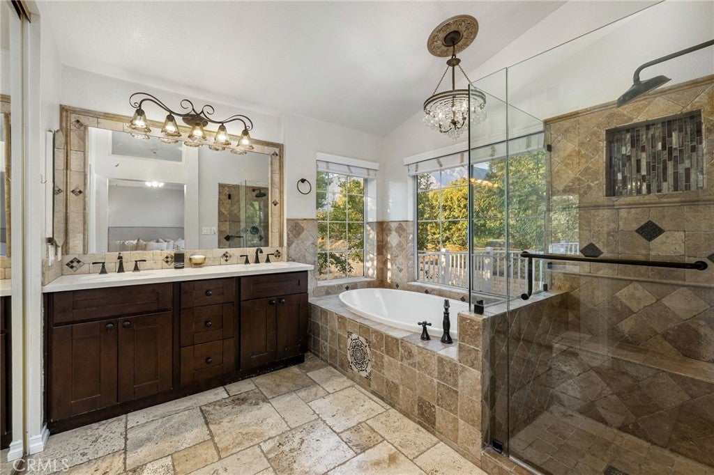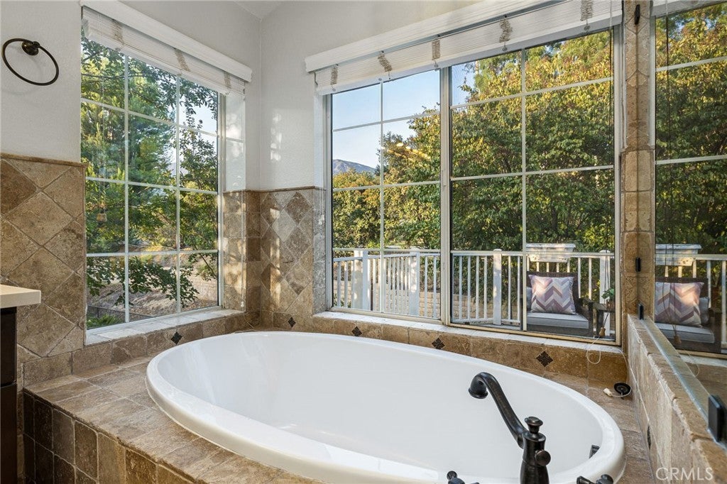 Remodeled home situated in a tucked lot of a quiet cul-de-sac located in the Emerald Ridge at Live Oak gated community. This home offers a long driveway leading to a two-car garage, landscaped front yard, and a covered front porch. Inside, enjoy soaring ceilings and a bright, open floor plan with a view of the center staircase and the living room featuring durable LVP flooring, large windows with plantation shutters, and an adjacent formal dining room with a chandelier and backyard view. The updated kitchen includes wood cabinetry, quartz countertops with full backsplash, stainless steel appliances, recessed lighting, and a breakfast nook, and is open to the family room. The family room has a fireplace with a mantel, windows with shutters, and access through glass French doors to a versatile space, ideal as a playroom, office, or additional lounge, that can remain private or open to the family room. Downstairs also offers a bedroom with double entry doors (currently used as an office), a remodeled bathroom with a custom tiled shower and updated vanity, a laundry room with cabinetry, and direct access to the attached two-car garage. Upstairs, the primary bedroom features a vaulted ceiling, double glass French doors leading to a balcony with mountain and greenbelt views, and direct access to the bathroom. The bathroom offers travertine tile in a versailles pattern, dual sinks, a frameless glass shower, separate tub with greenbelt views, and a walk-in closet with mirrored doors. Two additional bedrooms and a remodeled hall bathroom complete the upstairs. The backyard is set against the greenbelt with no direct neighbor, custom stonework, various trees, planters, a small wood deck, a stone fountain waterfall, and two side yards. The HOA offers a pool, spa, and an RV storage area for residents nearby.