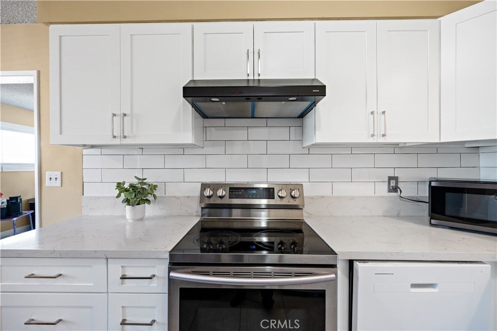 Welcome to this updated and move-in ready upper-level condo offering a spacious single-story layout with strong natural light throughout. The open-concept living and dining area features large windows, laminate wood flooring, and an easy flow into a versatile flex space ideal for a home office or study area. The remodeled kitchen includes white Shaker cabinets, quartz countertops, stainless steel range and hood, and convenient in-unit washer hookups. The generous bedroom offers excellent wall space and closet storage, while the updated bathroom features a newer vanity with quartz counters, upgraded fixtures, and a refreshed shower/tub with contemporary tile surround. Additional hallway cabinets provide valuable interior storage. This condo includes an assigned gated carport space and is located in a well-maintained community with low monthly HOA dues. The central Pomona location provides close access to shopping, groceries, restaurants, parks, and major transportation corridors with convenient access to the 71 and 10 freeways and Pomona Transit Center. With its updated interior, natural light, functional layout, in-unit laundry, and convenient proximity to daily amenities, this home presents a great opportunity for both an owner-occupant or an investment property.