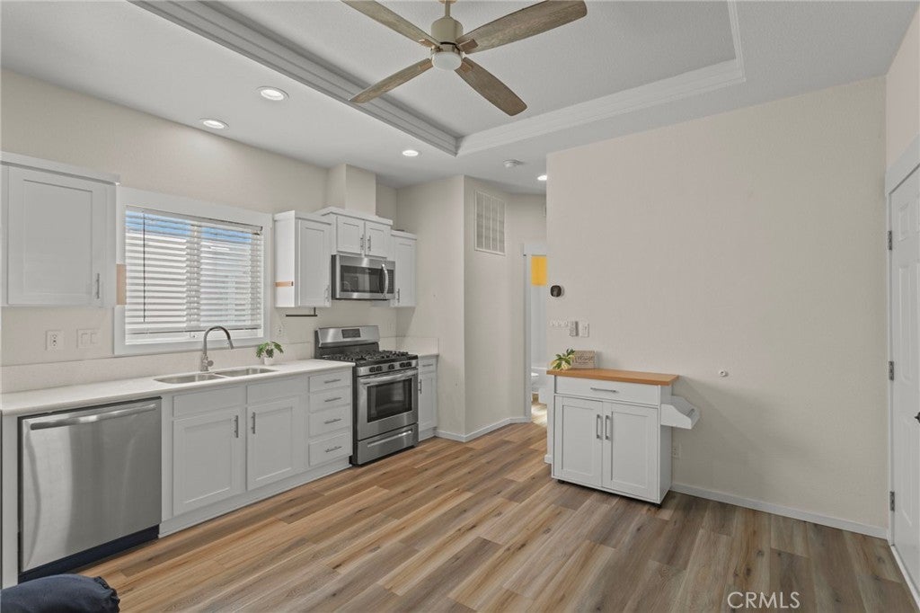 Welcome to this beautifully updated and move-in ready manufactured home offering approximately 621 square feet of thoughtfully designed living space in the all-age Jurupa Hills Mobile Home Park in Riverside. This well-appointed residence features 2 bedrooms and 1 bathroom, combining modern finishes, functional layout, and everyday comfort in a convenient location. Step inside to an open and inviting living area with bright natural light, recessed lighting, and an efficient layout that enhances the home’s sense of space. The stylish kitchen showcases elegant Corian countertops, soft-close shaker cabinetry, and brand-new stainless steel appliances, including a gas range, refrigerator, dishwasher, and microwave, making meal preparation and daily living effortless. A dedicated laundry area with a stackable washer and dryer adds additional convenience. Both bedrooms are well-proportioned, with ample natural light and flexible space for rest, guests, or a home office. The full bathroom has been tastefully updated with contemporary finishes. Throughout the home, flooring has been replaced with durable laminate wood-style planks, and high-efficiency windows help create a bright and comfortable environment. Additional highlights include central air and heating for year-round comfort and clean, freshly painted interiors that complement the overall modern aesthetic. The exterior presents a freshly maintained appearance with a spacious covered carport and paved driveway, providing convenient off-street parking. Located just moments from shopping, dining, freeways, and everyday amenities, this residence offers both accessibility and desirable community living. Jurupa Hills Mobile Home Park is an established neighborhood with a welcoming atmosphere and easy access to local conveniences. This is a remarkable opportunity to own a beautifully updated, move-in ready home with quality finishes and exceptional value. Don’t miss your chance and schedule your showing today to experience all this home has to offer!