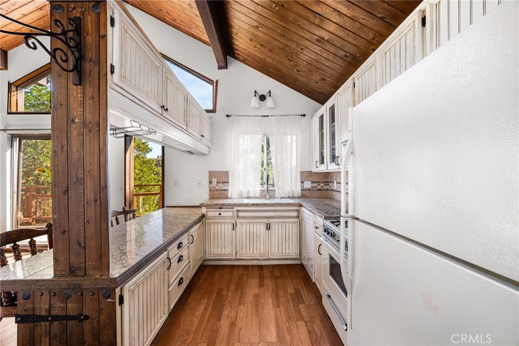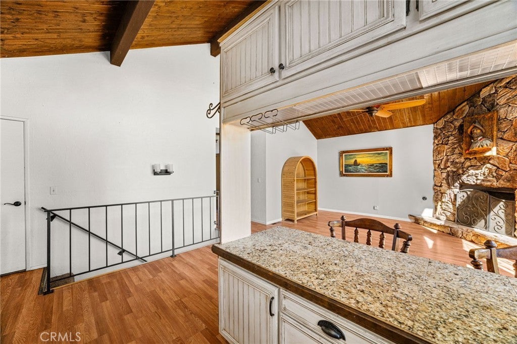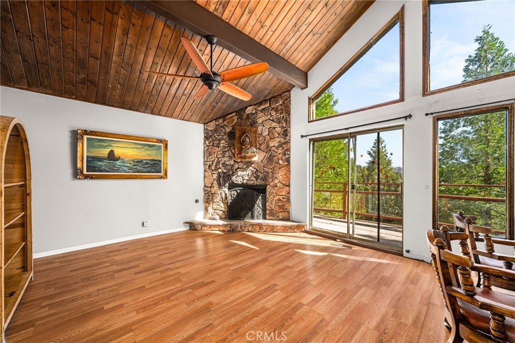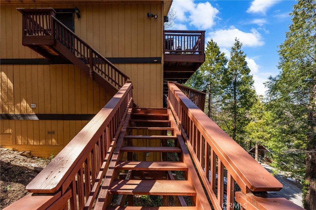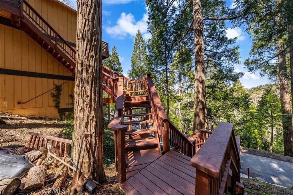Welcome to your serene mountain sanctuary! Nestled in the picturesque community of Crestline, this inviting retreat perfectly blends rustic charm with modern comfort. Step inside to a bright, open-concept kitchen and dining area, where soaring vaulted ceilings and a cozy stone fireplace create the perfect ambiance for entertaining or relaxing after a day at the lake. Vaulted wall windows and oversized sliding glass doors frame breathtaking views of the surrounding forested landscape and Crestline Lake, flooding the home with natural light and connecting seamlessly to the upper balcony—ideal for morning coffee or sunset wine. Downstairs, a spacious and tranquil living area awaits, alongside generously sized bedrooms and a beautifully updated bathroom. Step out onto a second expansive balcony and take in the peaceful sounds of nature—this is mountain living at its finest. Just a short walk to Crestline’s charming town center, including Goodwin & Sons Market, local eateries, the library, and scenic Lake Gregory, you’ll have both convenience and adventure at your doorstep. Bonus: This sale includes two additional adjacent lots—one on each side of the home—offering extra privacy, usable space, or future development potential. Whether you’re looking for a peaceful full-time residence or the perfect weekend escape, this unique property is your opportunity to own a slice of mountain paradise.
