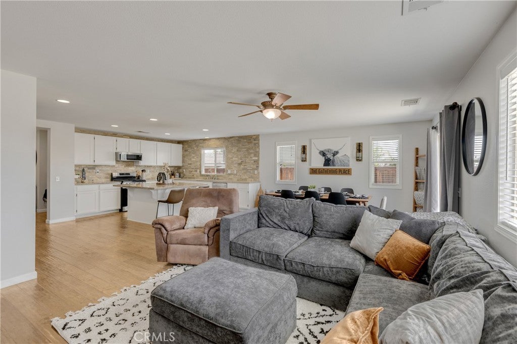 Welcome to this beautifully maintained single-story home located in the desirable gated community of Tournament Hills. Built in 2011, this 4-bedroom, 2-bath residence offers approximately 1,906 sq. ft. of living space on a spacious 10,454 sq. ft. lot with a two-car attached garage. The open-concept floor plan features a bright family room with abundant natural light, recessed lighting, and elegant hardwood flooring. The gourmet kitchen is designed for entertaining, showcasing granite countertops, a stone backsplash, stainless-steel appliances, and a large center island with bar seating. The private primary suite includes a walk-in closet and en-suite bath with dual sinks, a soaking tub, and a separate shower. Secondary bedrooms are generously sized and ideal for family, guests, or a home office. A convenient indoor laundry room and additional storage options enhance everyday functionality. Step outside to enjoy mountain views and a large, fully usable backyard—perfect for outdoor entertaining, gardening, or creating your dream space. Located in a quiet, well-maintained, gated community featuring walking trails, a scenic lake, and nearby parks. Just minutes from local shopping, schools, and freeway access. Low HOA and low taxes make this a rare opportunity to own in one of Beaumont’s most sought-after neighborhoods.