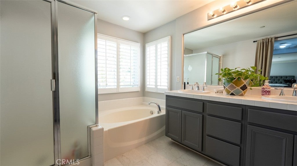 Nestled in the highly sought after Canyon View gated community with 24/7 security, this beautifully maintained 4 bedroom, 3 bathroom home offers stunning mountain views and an inviting atmosphere throughout. Step inside to find a bright, open layout featuring new quartz countertops, elegant window shutters, and stylish crown molding. The spacious kitchen offers a center island, ample cabinetry, and a dedicated dining area that opens to a cozy family room with a fireplace perfect for relaxing or entertaining. The main floor includes a bedroom and full bath, ideal for guests or multi generational living. Upstairs, the primary suite boasts breathtaking views, dual closets, and a luxurious ensuite with dual sinks, soaking tub, and separate shower. Two additional bedrooms share a full hall bath with dual sinks, and the upstairs laundry room with a sink adds convenience. Enjoy outdoor living in the private backyard featuring a built in BBQ and patio area, perfect for gatherings. Additional highlights include dual pane windows, recessed lighting, a commercial grade fire sprinkler system, and a 3 car attached garage with direct access. Community amenities include a sparkling pool, spa, playground, and clubhouse all within minutes of schools, parks, and shopping.