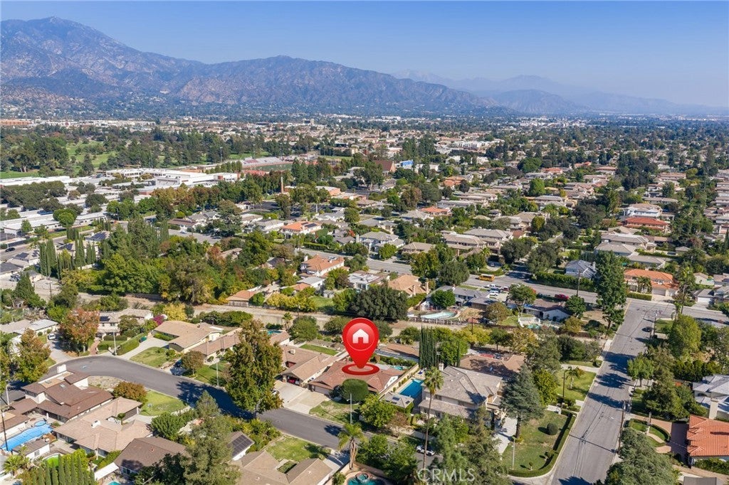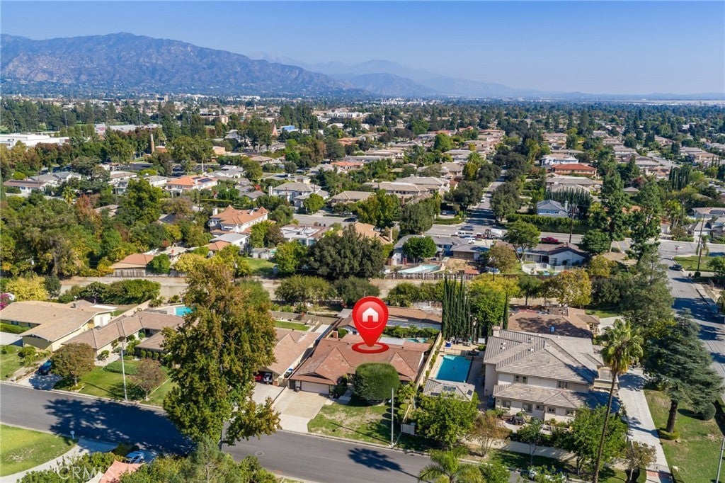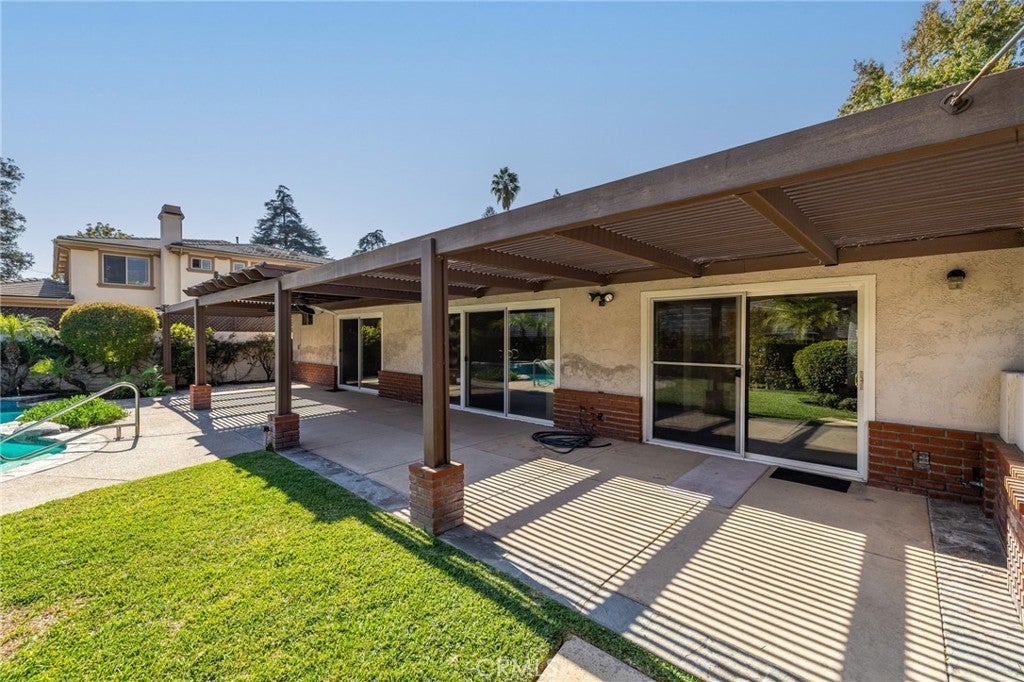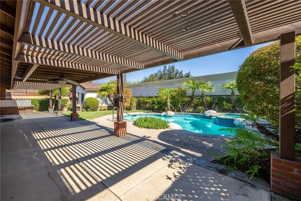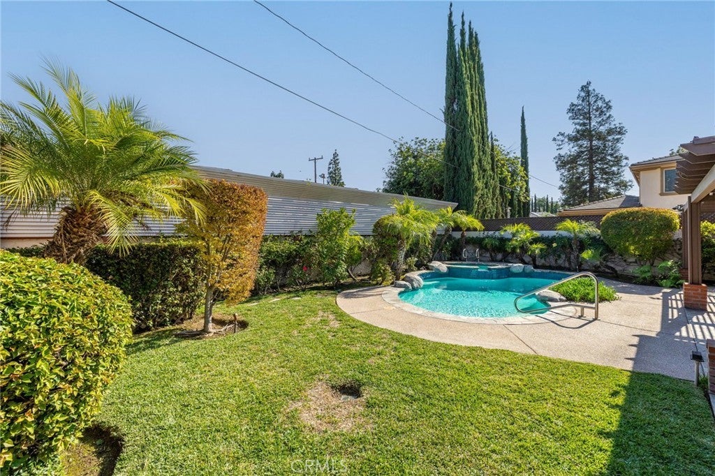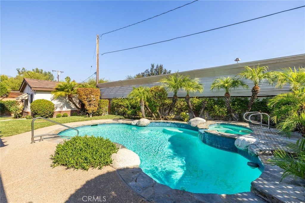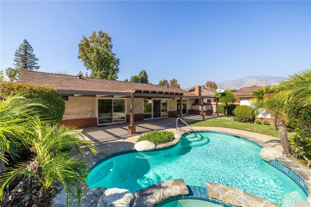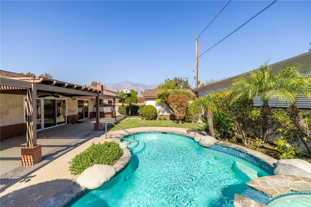 Single-story pool home with a spacious grassy front yard, manicured shade tree and planters, and a gated, covered front courtyard leading to double entry doors. The entryway opens to a generous living room where a wide sliding door forms a glass wall to the backyard and pool and an adjacent dining room off the entry enjoys a picture window to the front yard. The kitchen features classic white cabinetry, tiled floors and countertops, black appliances, and a peninsula and it opens to the family room. The family room offers an arched brick fireplace and a second slider to the patio and backyard. Down the hall, the primary bedroom offers a ceiling fan, its own slider to the backyard, and an ensuite bath with a vanity counter, dual sinks, a walk-in shower, and a walk-in closet. Two additional bedrooms are served by a hall bath with a walk-in shower. The attached two-car garage provides abundant storage cabinetry and an insulated door. A permitted detached structure, currently used as an office, sits just steps from the house and includes a vaulted ceiling and a full wall of closets; per seller, it was part of the original build and functioned as the fourth bedroom (buyer to verify). The backyard is designed for entertaining with a pool and spa, concrete perimeter decking, a wide covered patio, tropical-inspired landscaping, St. Augustine lawn, and block perimeter walls. Arcadia Unified School District.