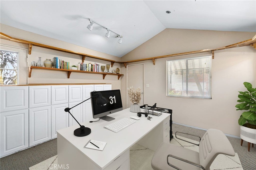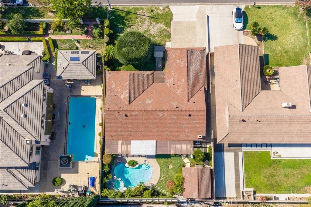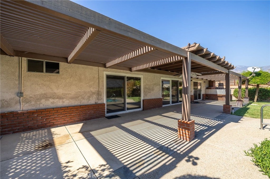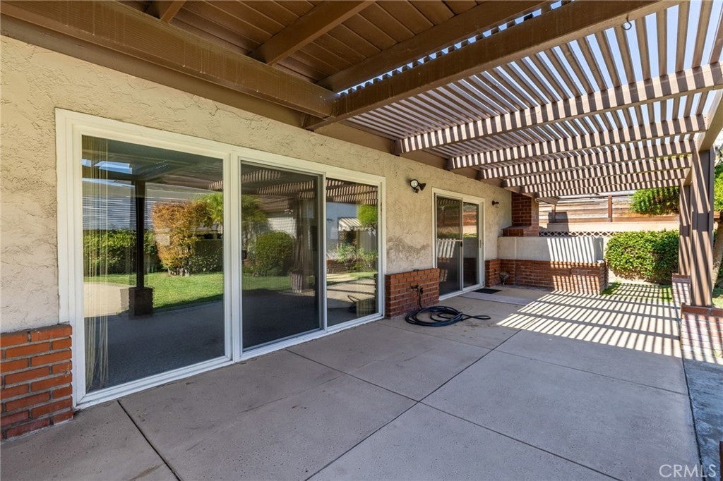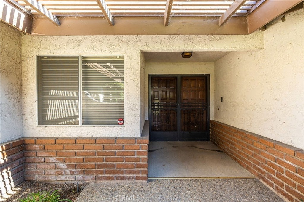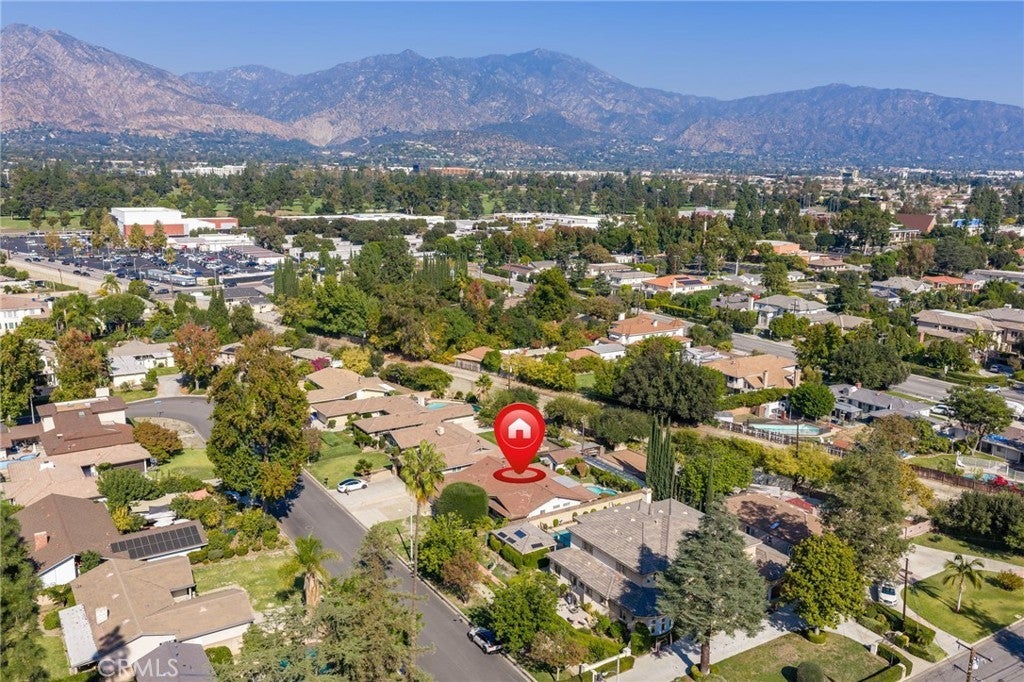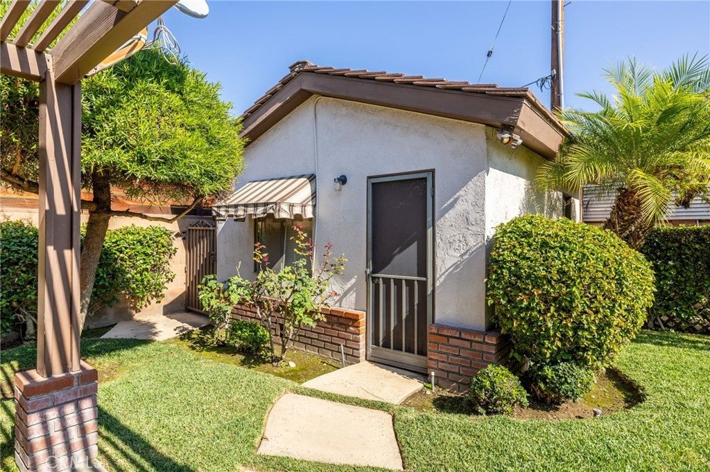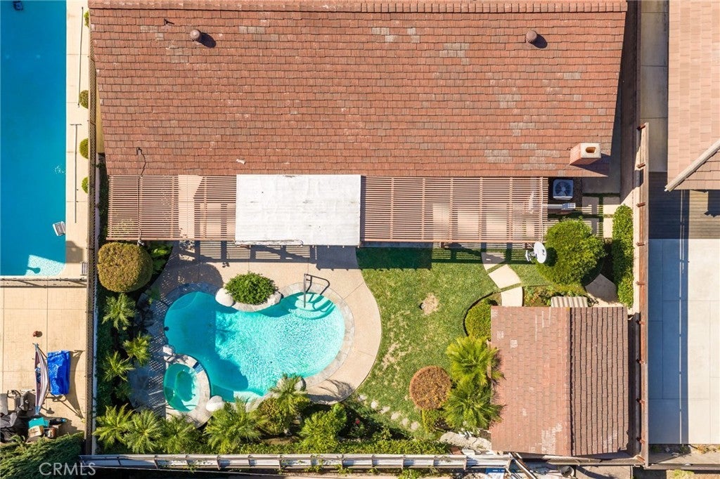 Single-story pool home with a spacious grassy front yard, manicured shade tree and planters, and a gated, covered front courtyard leading to double entry doors. The entryway opens to a generous living room where a wide sliding door forms a glass wall to the backyard and pool and an adjacent dining room off the entry enjoys a picture window to the front yard. The kitchen features classic white cabinetry, tiled floors and countertops, black appliances, and a peninsula and it opens to the family room. The family room offers an arched brick fireplace and a second slider to the patio and backyard. Down the hall, the primary bedroom offers a ceiling fan, its own slider to the backyard, and an ensuite bath with a vanity counter, dual sinks, a walk-in shower, and a walk-in closet. Two additional bedrooms are served by a hall bath with a walk-in shower. The attached two-car garage provides abundant storage cabinetry and an insulated door. A permitted detached structure, currently used as an office, sits just steps from the house and includes a vaulted ceiling and a full wall of closets; per seller, it was part of the original build and functioned as the fourth bedroom (buyer to verify). The backyard is designed for entertaining with a pool and spa, concrete perimeter decking, a wide covered patio, tropical-inspired landscaping, St. Augustine lawn, and block perimeter walls. Arcadia Unified School District.