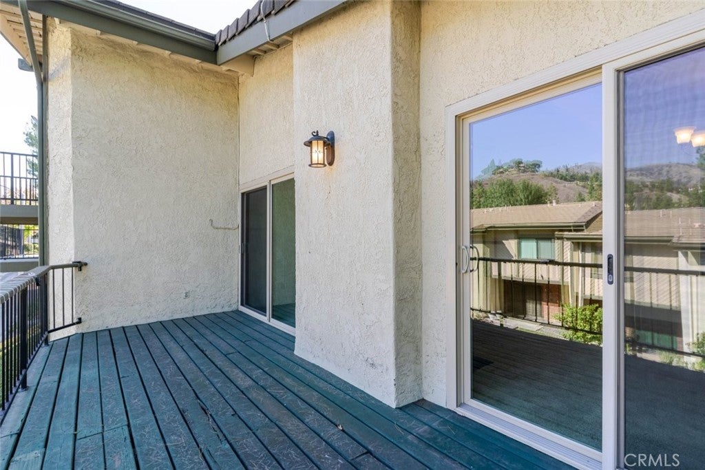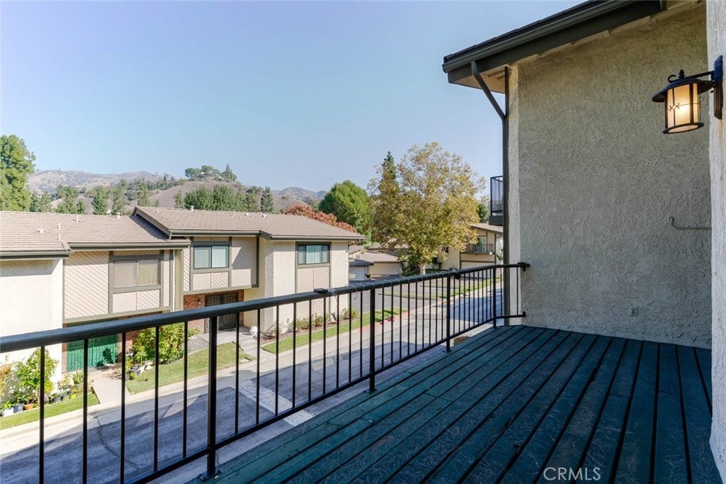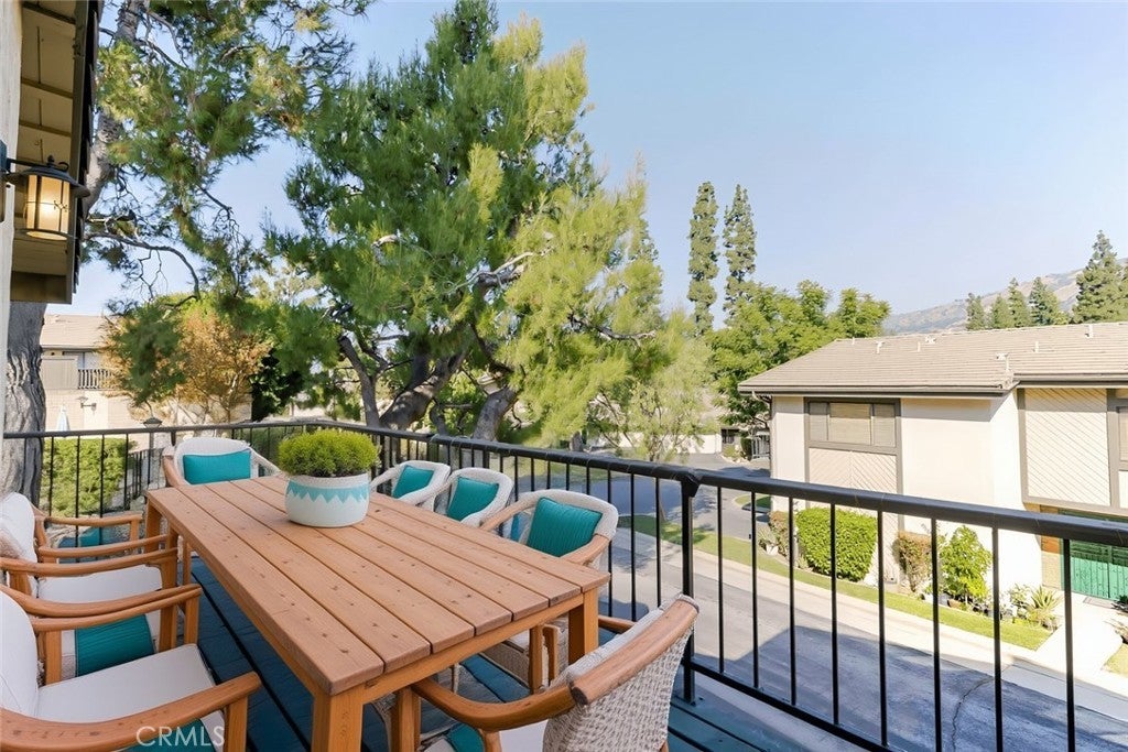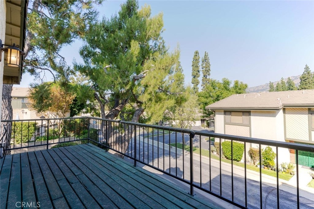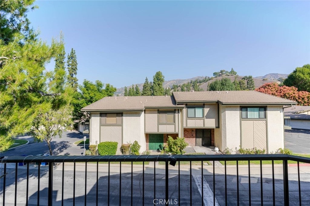 Charming and private, this Glendora residence welcomes you with mature landscaping and lush greenery that create a serene, tucked-away feel. The exterior showcases a classic design with warm wood accents, a two-car garage, and a gated front patio perfect for morning coffee or adding vibrant potted plants for extra curb appeal. Nestled in The peaceful Glendora Greens community, the home blends natural beauty and inviting comfort from the moment you arrive. Enjoy tranquil mornings or stunning sunsets from the private back balcony overlooking the Glendora foothills. Inside, a convenient half bath with washer and dryer adds functionality near the entry, along with direct access to the attached two-car garage. Two private outdoor spaces, one off the kitchen and another off the living room. The updated galley-style kitchen features rich oak self-closing cabinetry, engineered quartz countertops in a warm amber hue, and a decorative tile backsplash with diamond accents. Recessed lighting, a tray ceiling, and white appliances including a gas range, microwave, dishwasher, and refrigerator create a clean and cohesive look. Hardwood floors flow seamlessly through the entry and kitchen area, where sliding glass doors open to the patio, filling the space with natural light. The spacious living room offers a bright and airy setting with high ceilings, neutral tones, and a charming brick fireplace as its focal point. Large sliding doors frame beautiful mountain views, while the split-level layout connects the adjoining spaces with decorative railings and a ceiling fan for year-round comfort. Upstairs, two generous bedrooms share a three-quarter bath. The private primary suite is a spacious retreat, featuring his-and-hers walk-in closets and room for a sitting area or home office. The adjoining bath offers dual vanities, a separate shower and soaking tub, and a high privacy window that fills the space with soft natural light. This home perfectly combines charm, comfort, and convenience in a highly desirable Glendora location.
