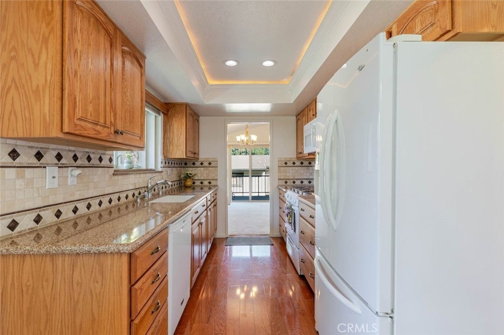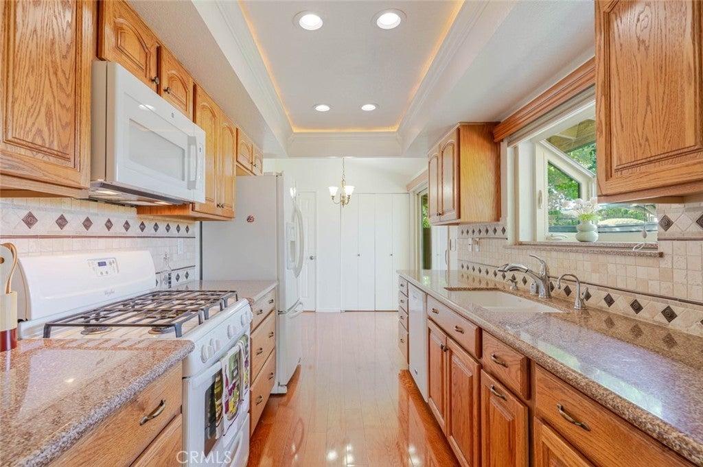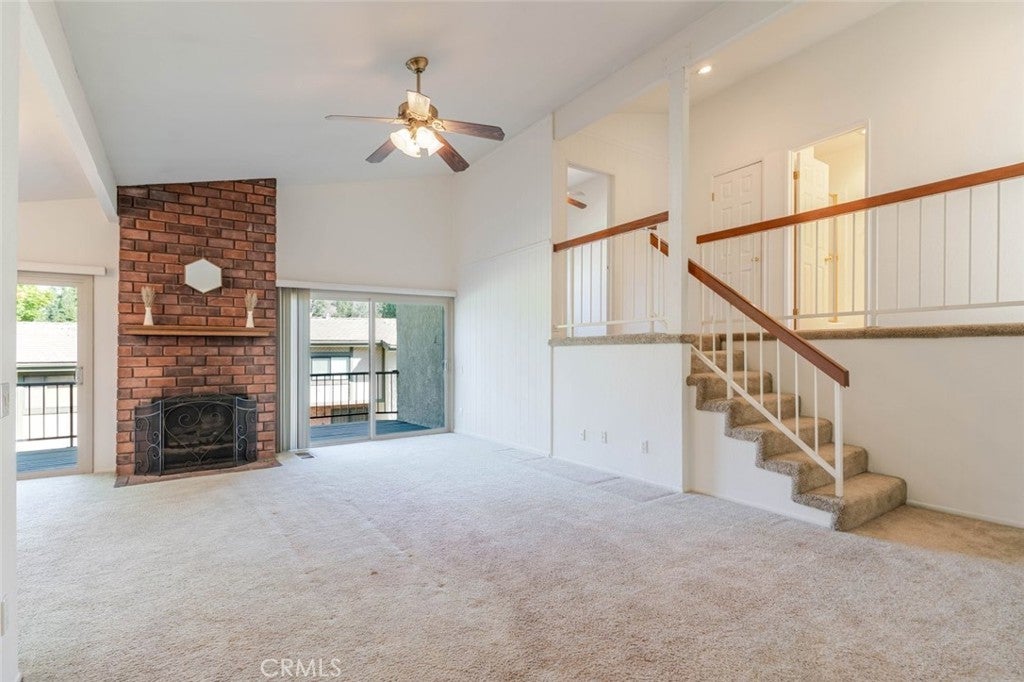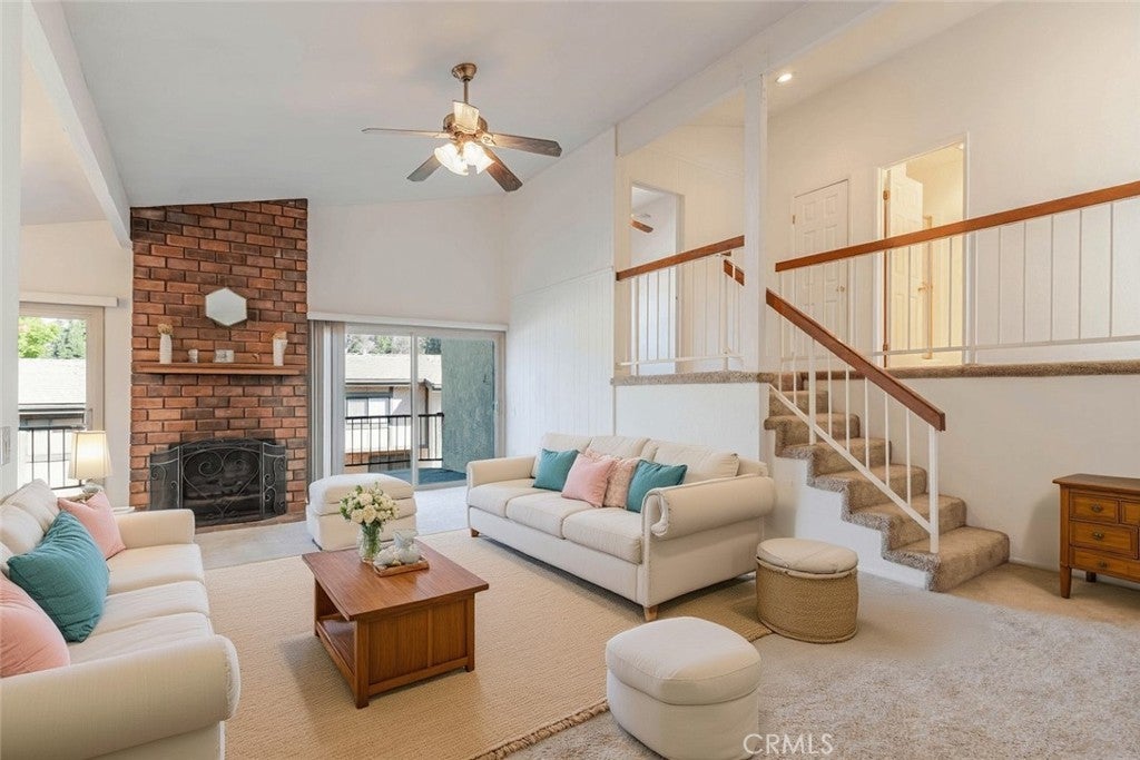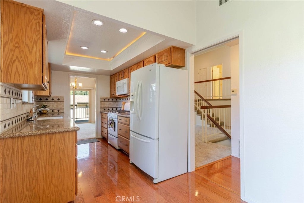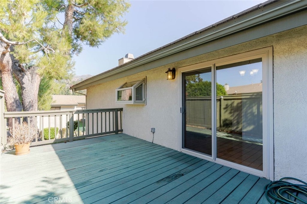 Charming and private, this Glendora residence welcomes you with mature landscaping and lush greenery that create a serene, tucked-away feel. The exterior showcases a classic design with warm wood accents, a two-car garage, and a gated front patio perfect for morning coffee or adding vibrant potted plants for extra curb appeal. Nestled in The peaceful Glendora Greens community, the home blends natural beauty and inviting comfort from the moment you arrive. Enjoy tranquil mornings or stunning sunsets from the private back balcony overlooking the Glendora foothills. Inside, a convenient half bath with washer and dryer adds functionality near the entry, along with direct access to the attached two-car garage. Two private outdoor spaces, one off the kitchen and another off the living room. The updated galley-style kitchen features rich oak self-closing cabinetry, engineered quartz countertops in a warm amber hue, and a decorative tile backsplash with diamond accents. Recessed lighting, a tray ceiling, and white appliances including a gas range, microwave, dishwasher, and refrigerator create a clean and cohesive look. Hardwood floors flow seamlessly through the entry and kitchen area, where sliding glass doors open to the patio, filling the space with natural light. The spacious living room offers a bright and airy setting with high ceilings, neutral tones, and a charming brick fireplace as its focal point. Large sliding doors frame beautiful mountain views, while the split-level layout connects the adjoining spaces with decorative railings and a ceiling fan for year-round comfort. Upstairs, two generous bedrooms share a three-quarter bath. The private primary suite is a spacious retreat, featuring his-and-hers walk-in closets and room for a sitting area or home office. The adjoining bath offers dual vanities, a separate shower and soaking tub, and a high privacy window that fills the space with soft natural light. This home perfectly combines charm, comfort, and convenience in a highly desirable Glendora location.