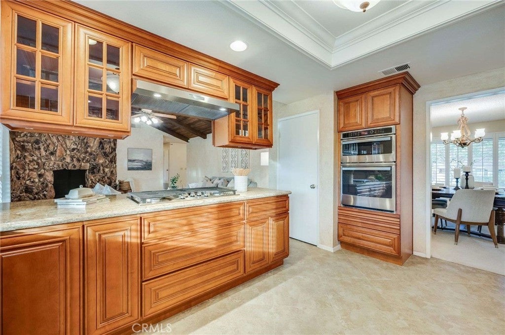 Breakfast Bar, Ceiling Fan(s), Separate/Formal Dining Room, Granite Counters, Pantry, Bedroom on Main Level, Main Level Primary, Beamed Ceilings, Ceramic Counters, Tile Counters, Track Lighting