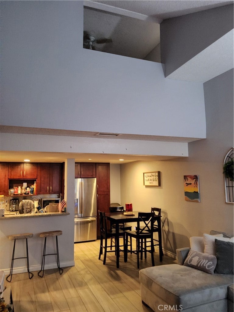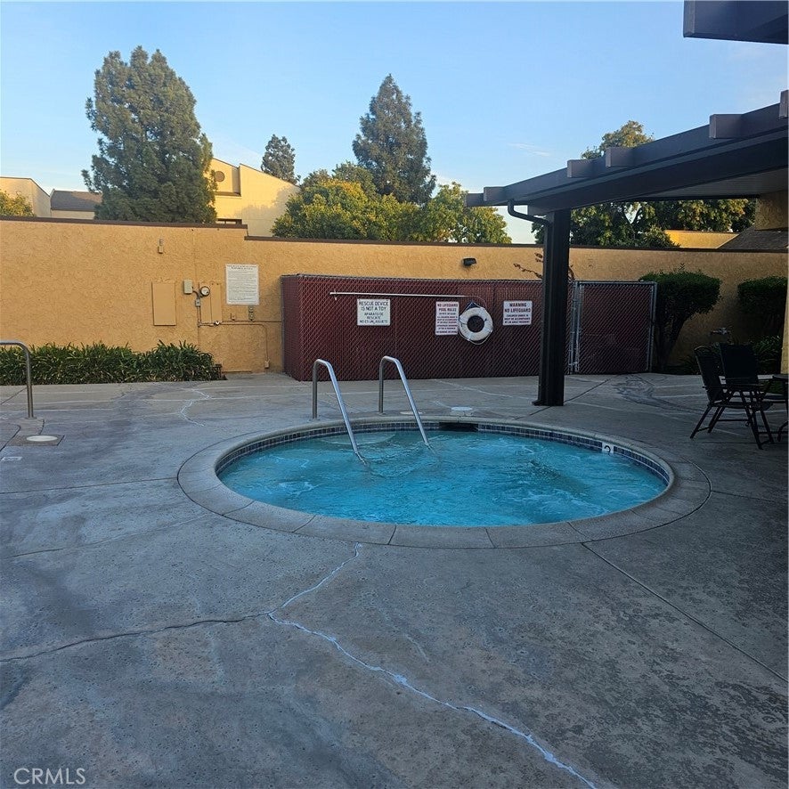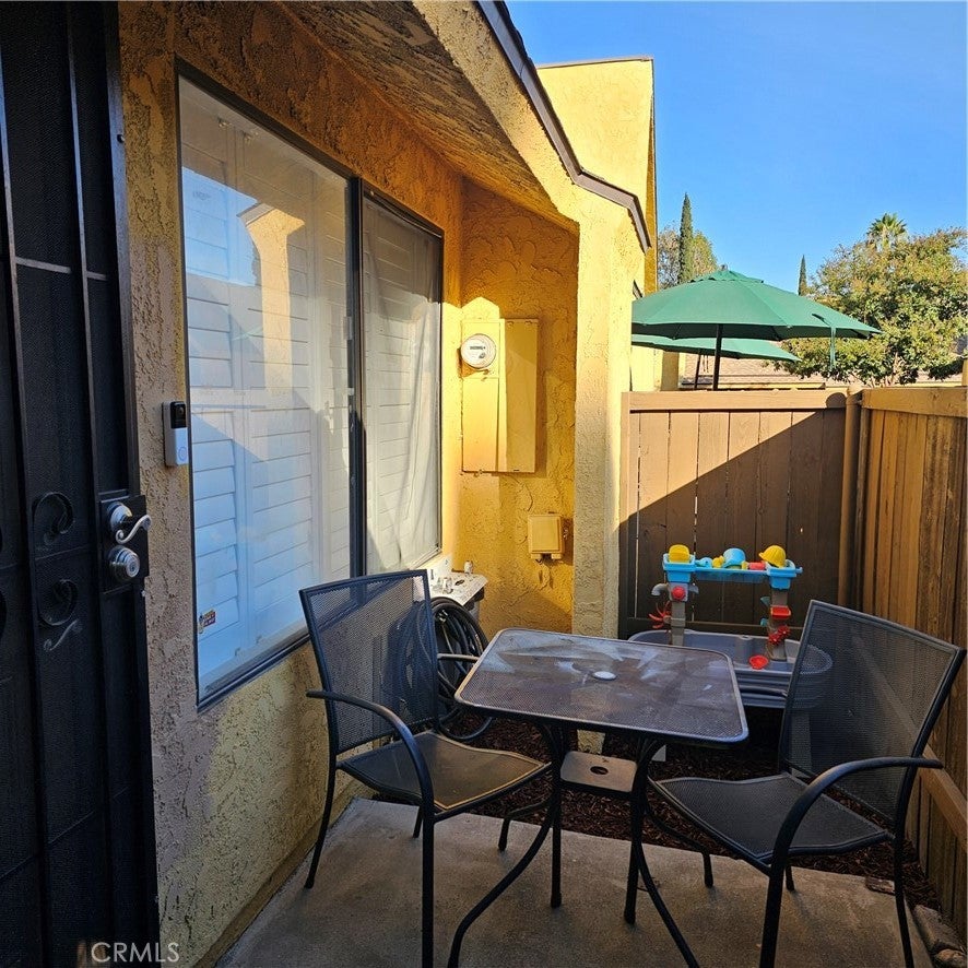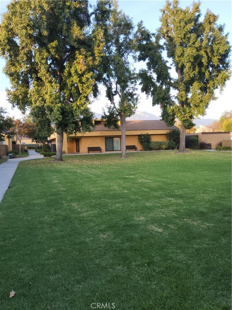 Schedule your viewing today! Welcome to the sought-after Pepperdale Community, where comfort meets convenience. This inviting condominium offers 3 bedrooms and 2 baths, highlighted by tall ceilings and recessed lighting that create an open and airy atmosphere. A spacious patio greets you prior to entering your home, providing the perfect extension of living space. The kitchen features rich cherry wood cabinetry with brushed nickel hardware, polished granite countertops, a metallic mosaic backsplash, and stainless steel appliances including a freestanding electric range and a curved glass range hood. Recent kitchen and flooring improvements add modern style and functionality, while central air conditioning ensures year-round comfort. Plantation shutters in the family room add timeless elegance and privacy. An option is available to add your own or purchase the existing GE Profile Smart Washer & Dryer Combo featuring ventless heat pump technology. Detached spacious 2 car garage, multiple community laundry areas, well manicured grounds, gated pool and heated spa, club house with restrooms. Behind the community lies the scenic Pacific Electric Inland Empire Trail, offering miles of walking, biking, and outdoor enjoyment. The Pepperdale Community is known for its quiet and peaceful setting, with close proximity to local amenities, shopping, and dining. A perfect blend of location and lifestyle makes this home an exceptional opportunity.