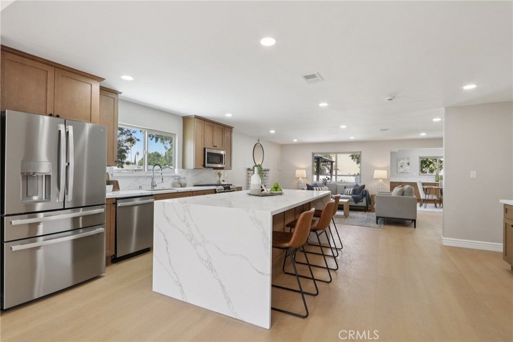Seller giving $20,000 buyer concessions to buy down rate or towards closing cost. Newly renovated Granada Hills gem situated on a spacious corner lot. This single-story home boasts a modern open-concept layout with brand-new interior and exterior paint, a new roof, and upgraded laminate flooring throughout. The stunning chef’s kitchen is the centerpiece of the home, featuring a 9-foot waterfall island with granite countertops, added cabinetry and pantry space, and sleek recessed lighting that flows seamlessly into the living and dining areas. Offering two primary suites and three fully remodeled bathrooms, this home is designed for comfort and flexibility. Every detail has been thoughtfully updated, including a 200-amp electrical panel, new garage door, fully drywalled garage with epoxy flooring, and recessed lighting. With its huge lot, curb appeal, and high-end finishes, this move-in-ready property is the perfect blend of modern design and everyday functionality.