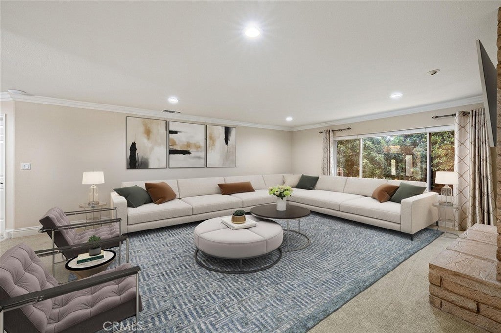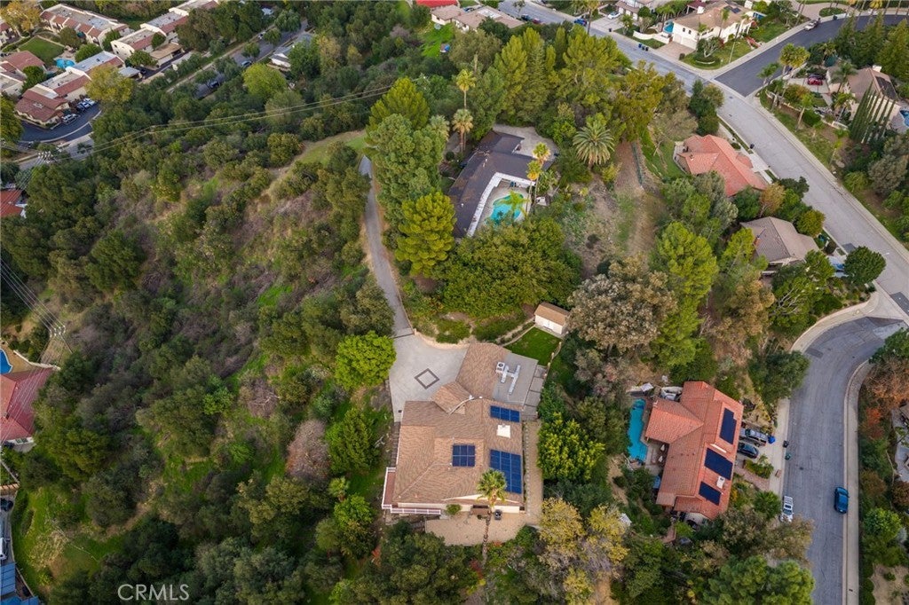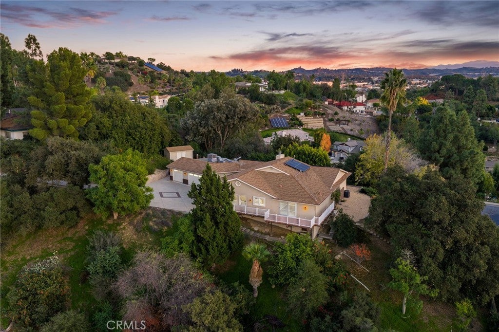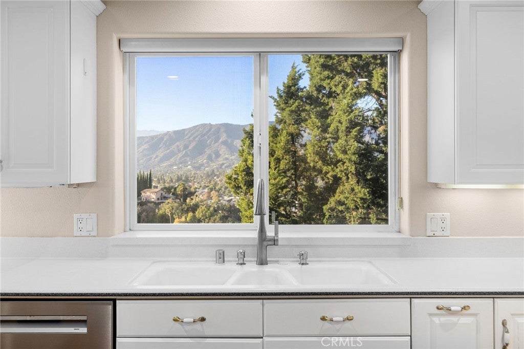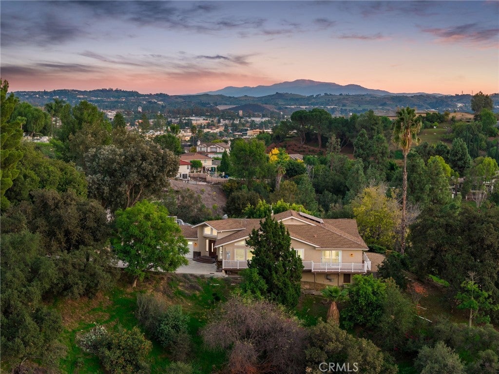 Updated Single-Story Home with Panoramic Mountain Views. Nestled on a secluded hillside lot with ultimate privacy, this beautifully updated single-story residence is accessed via a long, private driveway that opens to an extra-wide front motor court. Double wood-and-glass entry doors welcome you into a bright foyer with tile flooring that flows seamlessly into the expansive open-concept living areas. The dramatic family room showcases vaulted ceilings, a wall of picture windows framing sweeping mountain views, a bay window overlooking the front yard, and complete openness to kitchen. The kitchen features classic white shaker cabinetry, stainless steel appliances, recessed lighting, hardwood flooring, and a peninsula with casual countertop seating. Adjacent to the family room is a well appointed wet bar equipped with a sink, under-counter refrigerator, glass-front upper cabinets, and a curved radius counter perfect sitting and entertaining. The formal living room serves as a stunning focal point with its floor-to-ceiling Roman-brick fireplace and raised hearth, recessed lighting, elegant crown molding, and an expansive picture window. A versatile bonus room (easily convertible to a fourth bedroom) includes a dry bar that could be transformed into a kitchenette, crown molding, and sliding glass doors opening to the backyard. Down the hallway, the generously sized primary suite offers carpeting, direct access to a private balcony showcasing beautiful mountain views. The primary bathroom includes a glass-enclosed walk-in shower, a soaking tub with marble surround, dual-sink with a dedicated vanity, and a walk-in closet with built-in organizers. Two additional bedrooms feature ceiling fans and plantation shuttered windows, while the well-appointed hall bathroom includes dual sinks, a shower/tub combination with sliding glass enclosure, and a view window. Convenience is elevated with an oversized laundry room offering a folding counter, abundant built-in storage cabinets, hanging rod, and a built-in cabinet ironing center. Exterior grounds are designed for low-maintenance living, featuring drought-tolerant gravel landscaping, stepping stones, concrete walkways accented with brick ribbons, a grassy play area, and a convenient storage shed. There is a solar system that will be transferred to the new buyer on lease that began in 2012. This thoughtfully updated home combines mid-century character with modern amenities and unparalleled panoramic views throughout.