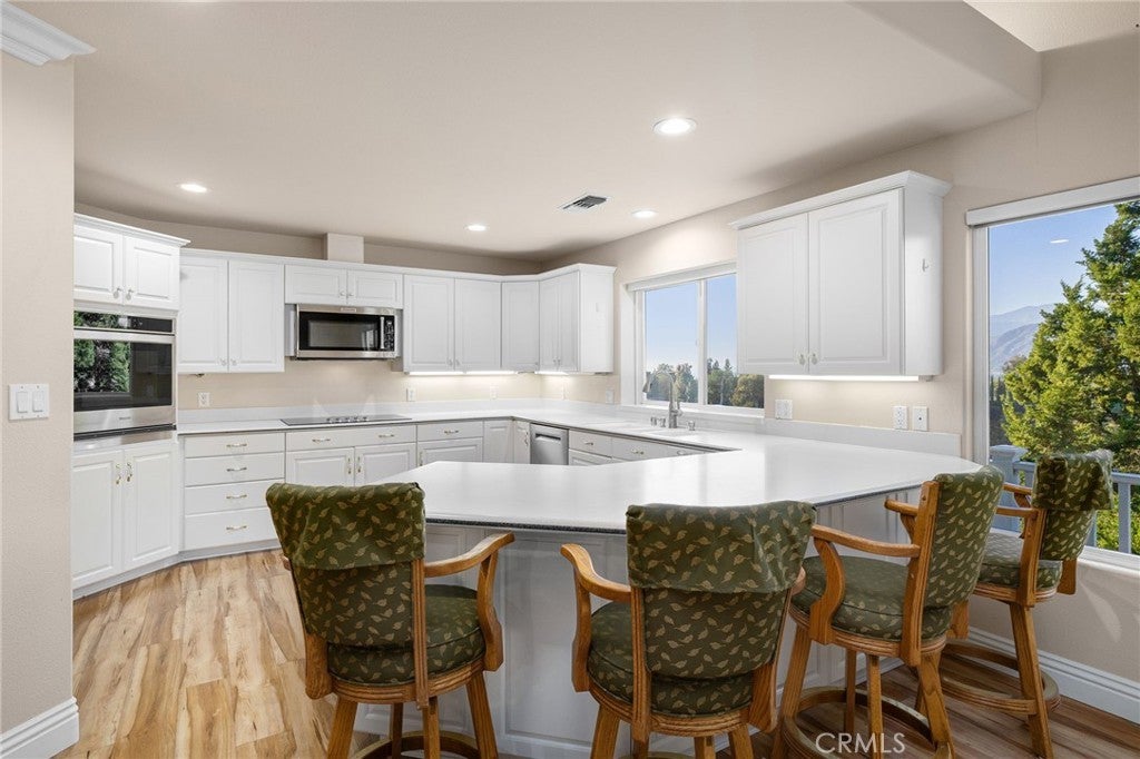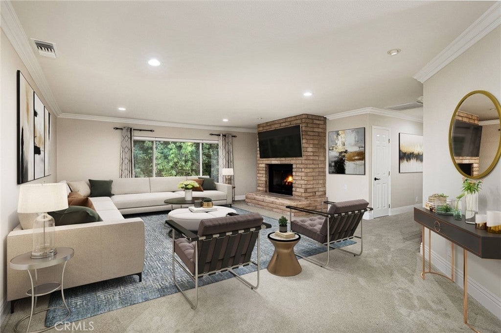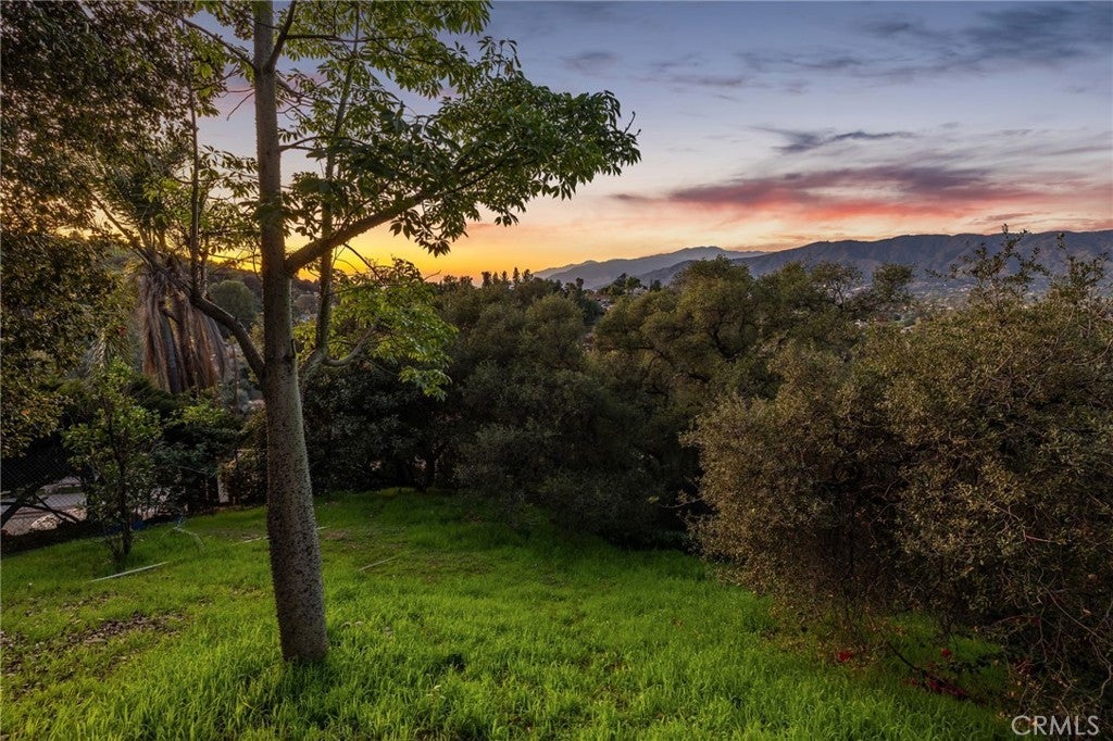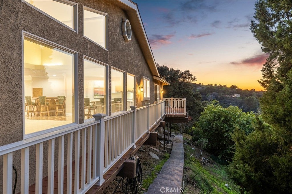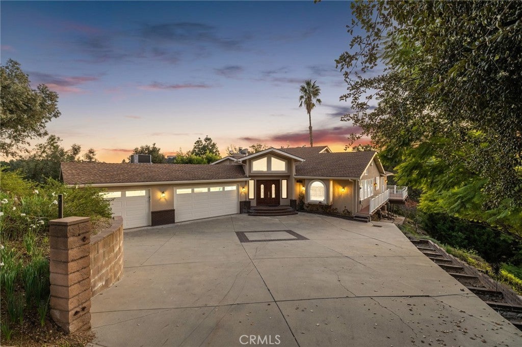 Updated Single-Story Home with Panoramic Mountain Views. Nestled on a secluded hillside lot with ultimate privacy, this beautifully updated single-story residence is accessed via a long, private driveway that opens to an extra-wide front motor court. Double wood-and-glass entry doors welcome you into a bright foyer with tile flooring that flows seamlessly into the expansive open-concept living areas. The dramatic family room showcases vaulted ceilings, a wall of picture windows framing sweeping mountain views, a bay window overlooking the front yard, and complete openness to kitchen. The kitchen features classic white shaker cabinetry, stainless steel appliances, recessed lighting, hardwood flooring, and a peninsula with casual countertop seating. Adjacent to the family room is a well appointed wet bar equipped with a sink, under-counter refrigerator, glass-front upper cabinets, and a curved radius counter perfect sitting and entertaining. The formal living room serves as a stunning focal point with its floor-to-ceiling Roman-brick fireplace and raised hearth, recessed lighting, elegant crown molding, and an expansive picture window. A versatile bonus room (easily convertible to a fourth bedroom) includes a dry bar that could be transformed into a kitchenette, crown molding, and sliding glass doors opening to the backyard. Down the hallway, the generously sized primary suite offers carpeting, direct access to a private balcony showcasing beautiful mountain views. The primary bathroom includes a glass-enclosed walk-in shower, a soaking tub with marble surround, dual-sink with a dedicated vanity, and a walk-in closet with built-in organizers. Two additional bedrooms feature ceiling fans and plantation shuttered windows, while the well-appointed hall bathroom includes dual sinks, a shower/tub combination with sliding glass enclosure, and a view window. Convenience is elevated with an oversized laundry room offering a folding counter, abundant built-in storage cabinets, hanging rod, and a built-in cabinet ironing center. Exterior grounds are designed for low-maintenance living, featuring drought-tolerant gravel landscaping, stepping stones, concrete walkways accented with brick ribbons, a grassy play area, and a convenient storage shed. There is a solar system that will be transferred to the new buyer on lease that began in 2012. This thoughtfully updated home combines mid-century character with modern amenities and unparalleled panoramic views throughout.