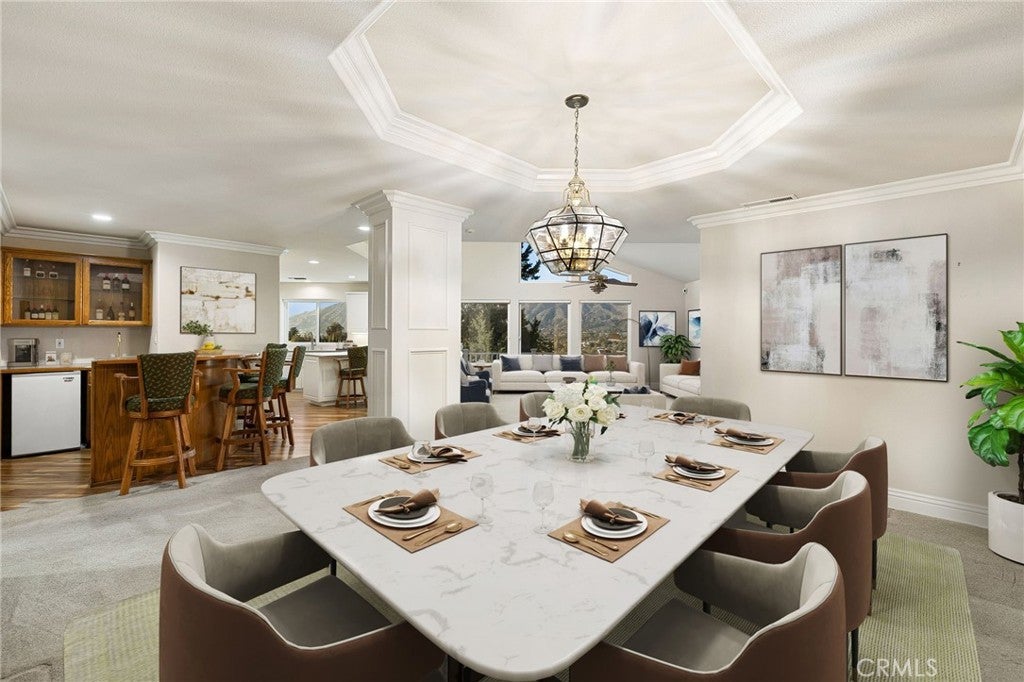 Breakfast Bar, Crown Molding, Separate/Formal Dining Room, High Ceilings, Open Floorplan, Recessed Lighting, Solid Surface Counters, All Bedrooms Down, Bedroom on Main Level, Main Level Primary, Walk-In Closet(s), Wet Bar