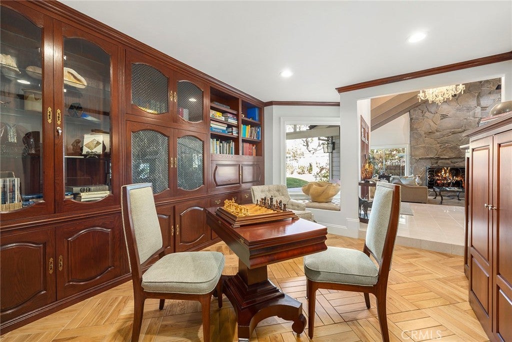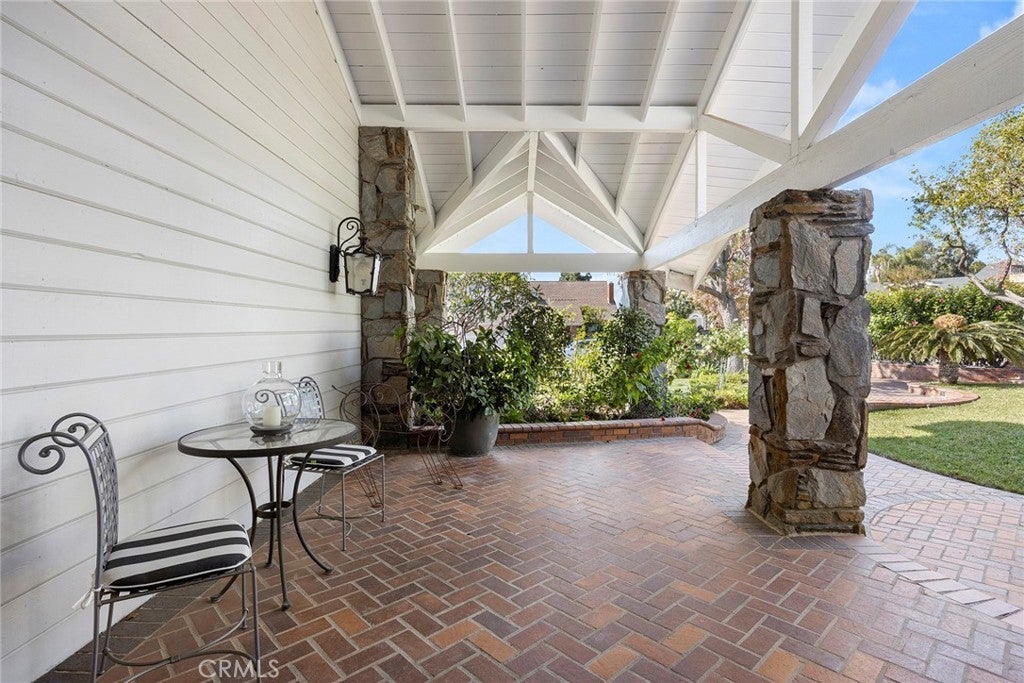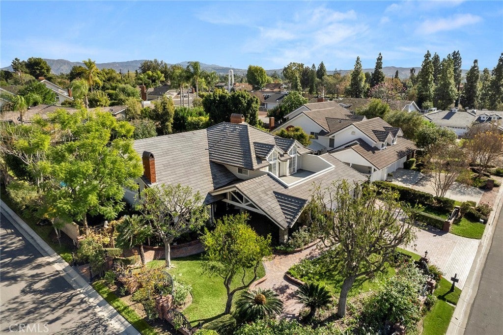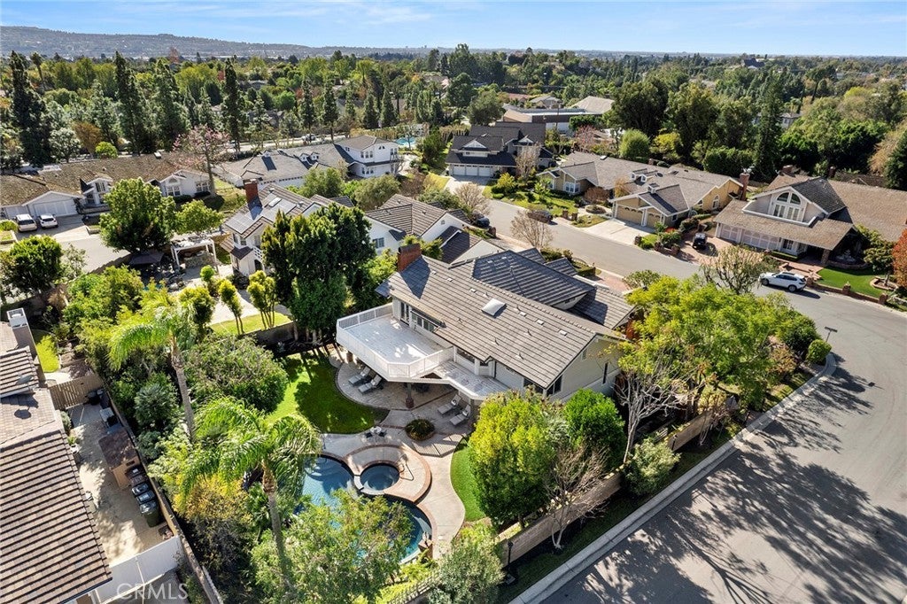 A serene oasis nestled within expansive grounds. Discover refined living in this elegant property set on a sprawling corner lot. The entrance is graced by a charming front courtyard with a fountain and brick walkways, leading to a welcoming covered porch and double door entry. The journey begins in a sophisticated foyer with soaring vaulted beam ceilings, surrounded by generous living and dining rooms, a classic staircase, and a sophisticated library. The expansive family room serves as a warm and inviting centerpiece, featuring a cozy brick fireplace and a convenient wet bar. Meals are a delight in the large breakfast nook, adjacent to the country kitchen, which is appointed with quartzite counters, pristine white shaker cabinetry, a built-in Viking refrigerator, Wolf double ovens, a warming drawer, and a gas cooktop. The kitchen’s large farm sink offers picturesque views of the impressive backyard. The main floor adds practicality with a bonus room, a full bath, and a laundry room. Upstairs, the primary suite is a serene sanctuary, complete with a brick fireplace, French doors leading to a spacious deck, a sitting area, and a luxurious bathroom with a custom multi-head shower and a broad double vanity. Two secondary bedrooms feature ample closet space and a shared, tastefully designed double vanity bath. An in-law suite with a private bath and sitting area further enhances comfort on the upper level. Outdoor living is equally captivating, with a large covered patio perfect for gatherings, extensive lawn areas, a magnificent pool and spa, and zoning for two horses. The property also features a built-in BBQ island, potential RV parking, and a half outdoor bathroom, completing an exceptional outdoor experience.