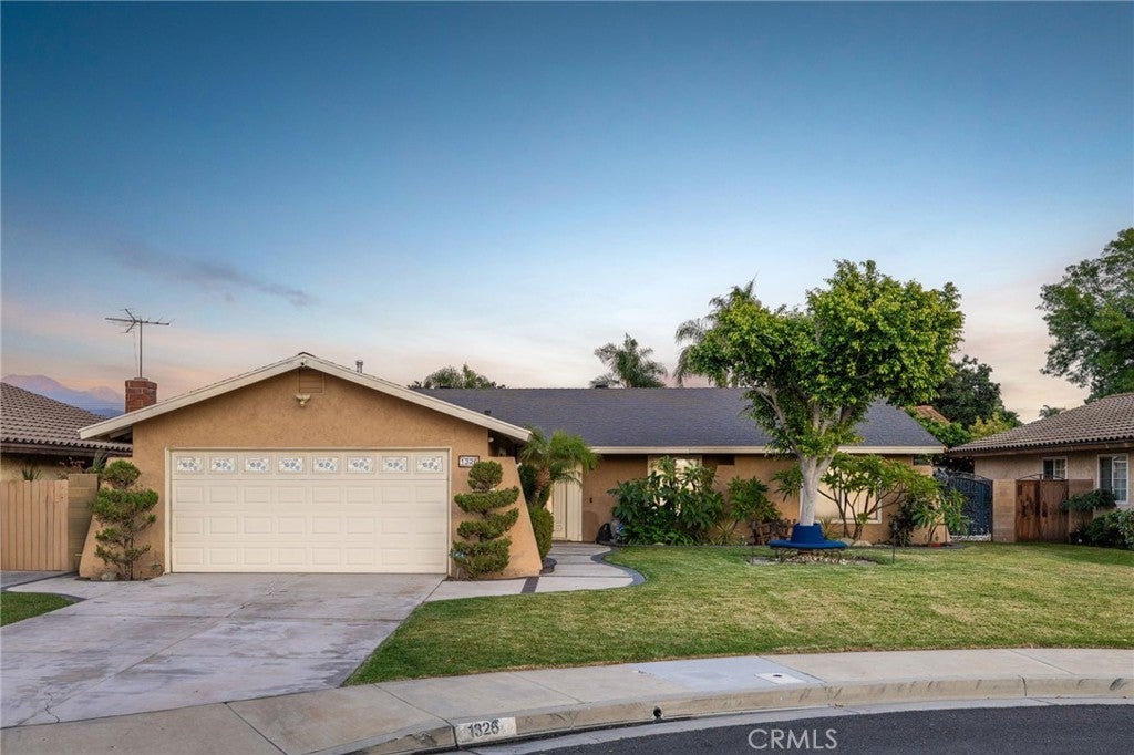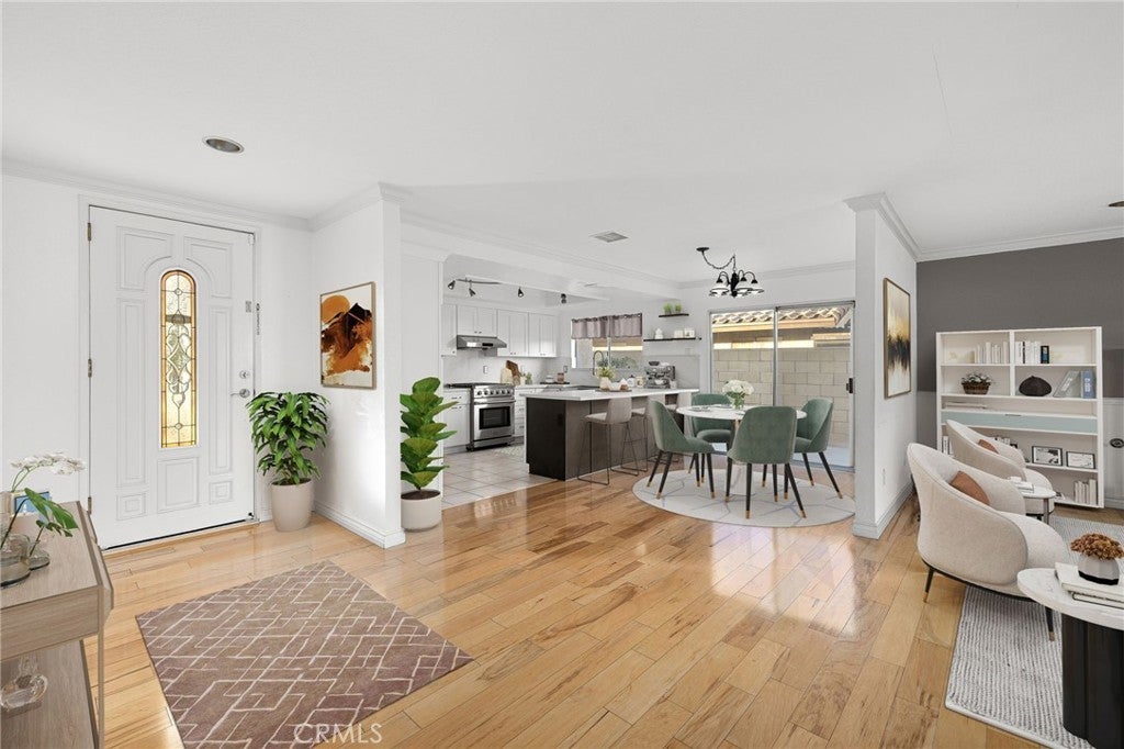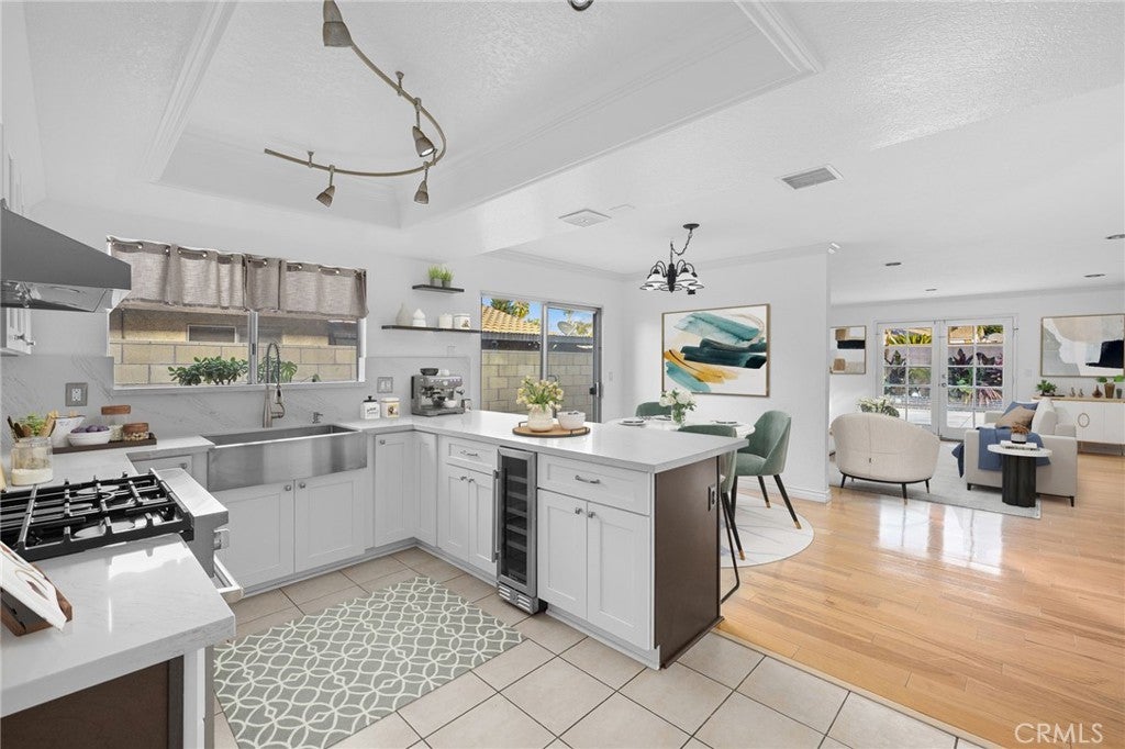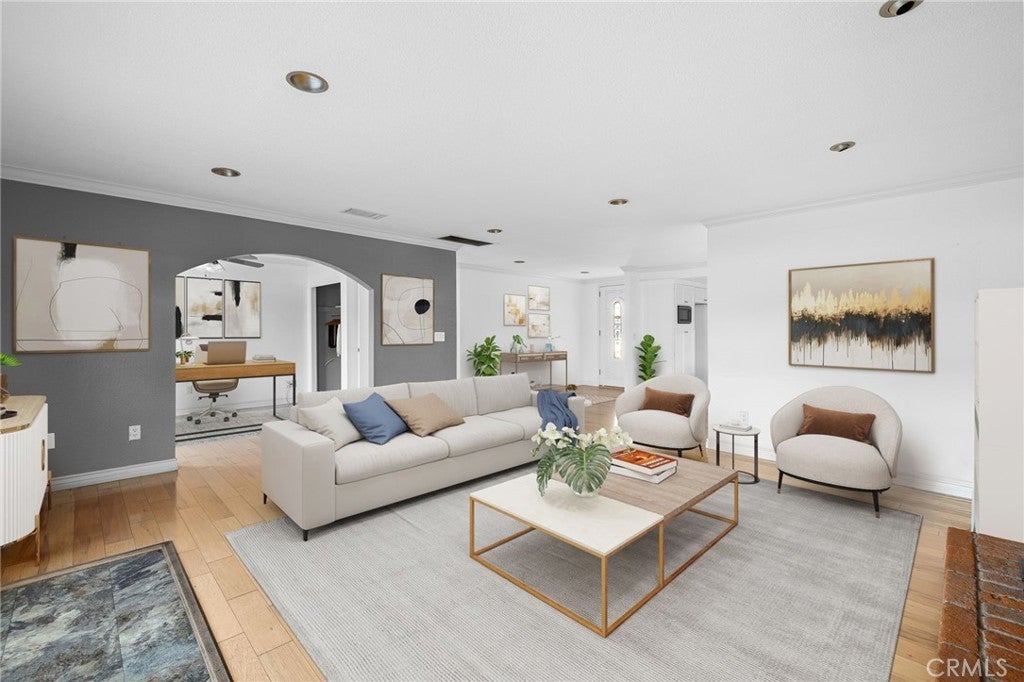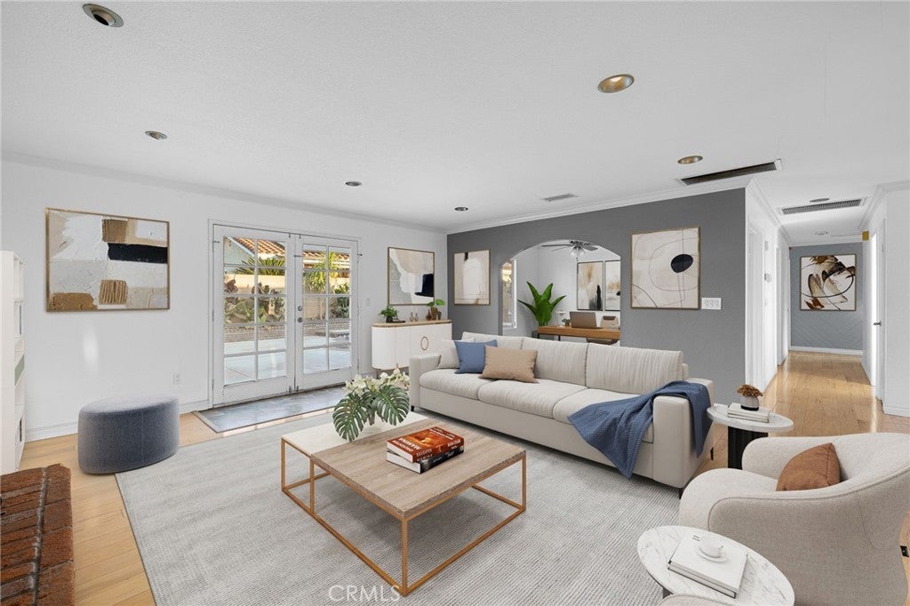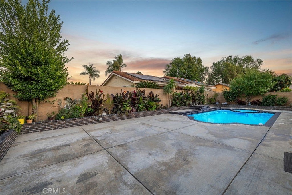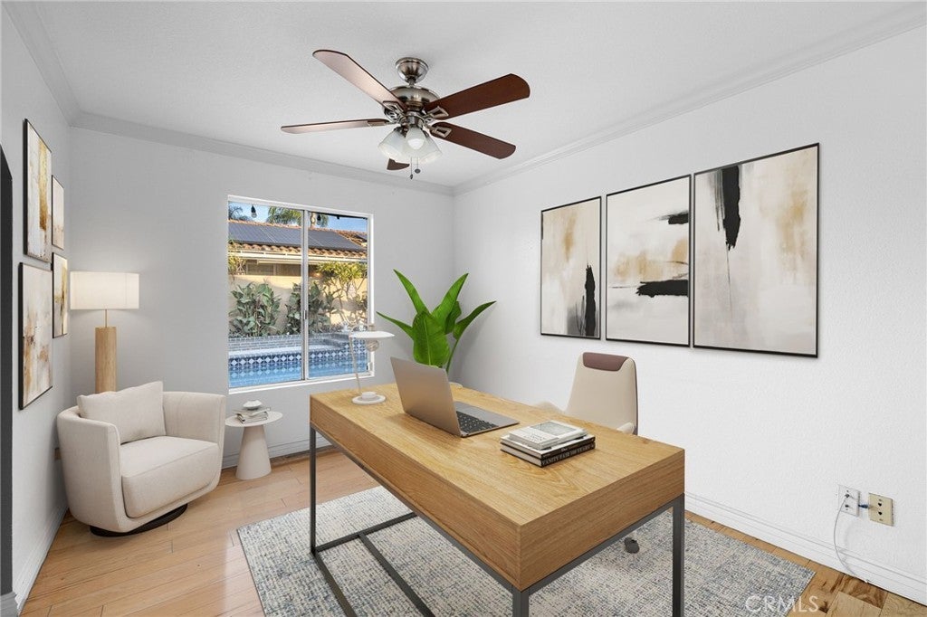 Remodeled Pool Home on a Private Cul-De-Sac. A manicured front yard with a lawn, clean planters, and a concrete walkway leads to a welcoming covered porch. Inside, the open-concept layout features rich wood flooring, crown molding, and recessed lighting throughout. The remodeled kitchen offers white shaker cabinetry, quartz counters, stainless steel appliances, including a sleek slimline wine fridge, a farm sink, and a peninsula with bar seating. An adjacent dining area provides abundant natural light and direct access to the side yard through a sliding glass door. The spacious family room showcases a brick fireplace with a raised hearth and mantel, recessed lighting, and French doors framing views of the pool and backyard. Just off the family room is an office with an arched opening and double-door hallway access (previously the fourth bedroom and easily convertible back if desired.) Down the hallway, the primary bedroom overlooks the pool and features tiled flooring, crown molding, a ceiling fan, dual closets, and a sliding door to the backyard. The primary bath includes a walk-in shower with a glass enclosure and a pedestal sink. Two additional bedrooms also offer ceiling fans and share a well-appointed hall bath with a tub/shower combo and pedestal sink. The backyard is designed for entertaining, offering a sparkling pool and spa, expansive concrete decking, elevated brick planters, and block walls on all sides for privacy.
