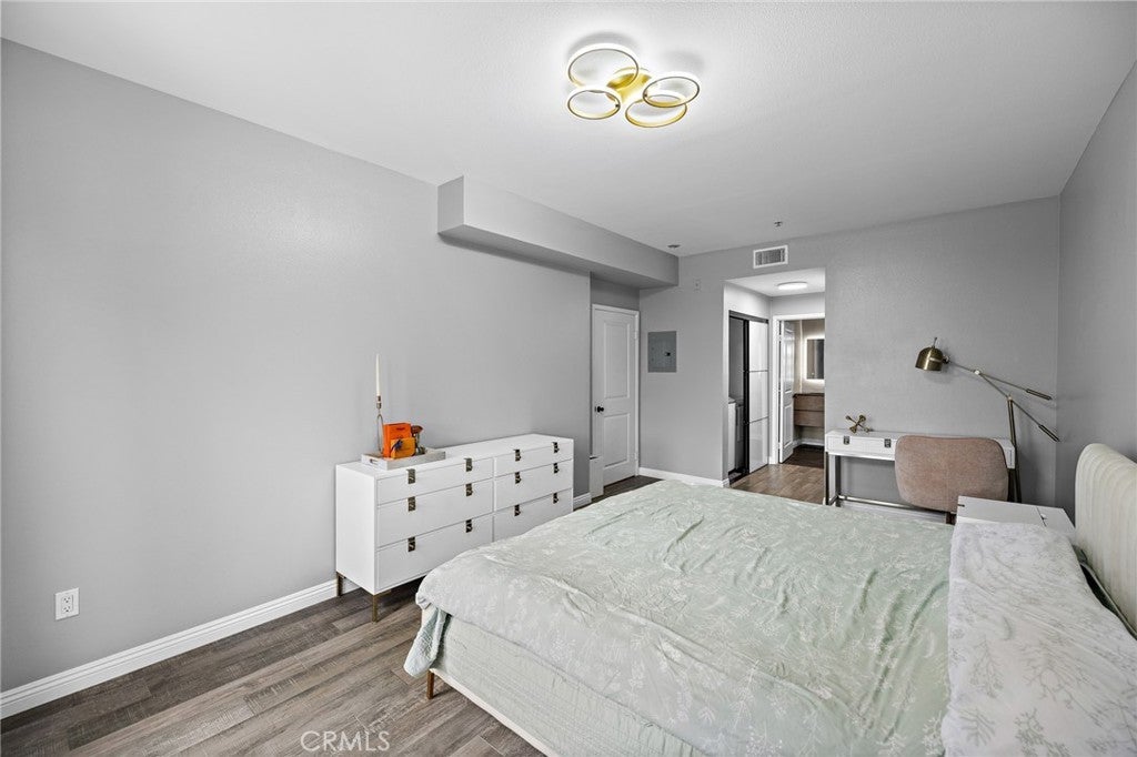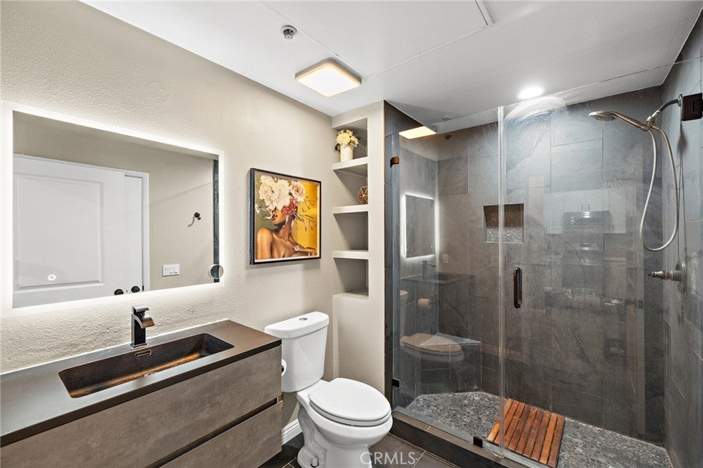 Welcome to this stunning top-floor fully furnished condo at 1801 E Katella #4005 in Anaheim, California, where elegance meets convenience. Nestled in the highly desired Platinum Triangle neighborhood, this meticulously remodeled home has wonderful city views and boasts prime access to parking, an elevator, and storage, making it a true gem in the community. This unit comes with two parking spaces and a storage room. Step inside this delightful 784 square foot home, adorned with exquisite porcelain flooring that flows seamlessly throughout. The living space is bathed in nourishing natural light from large glass French doors that invite you to unwind on your private balcony. Enjoy evenings in your cozy living area, equipped with a large flat-screen TV, offers a perfect spot for relaxation. The modern kitchen features sleek white high-gloss cabinets with stylish brass hardware, a state-of-the-art pull-down brass faucet, and quartz countertops with elegant bar seating illuminated by beautiful LED pendant lights. With newer stainless-steel appliances and a new garbage disposal, every meal can be crafted with ease. Retreat to the spacious primary bedroom, designed for comfort with ample space for a king-sized bed. Revel in the grandeur of a lovely hanging light fixture and a generous walk-in closet that caters to all your storage needs. The updated bathroom features an updated sink with a touch-sensitive lighting mirror, Alexa speaker, a glass walk-in shower adorned with a stone mosaic floor, and Italian slate tiles. This home is complete with an efficiently designed laundry closet, accommodating new full-sized washer and dryer, and new shelving for perfect organization witth new tempered glass doors giving it a classy look. The entire home is freshly painted and impeccably cleaned, this residence is move-in ready! Experience the impressive amenities of the Stadium Lofts Community including Water, Trash, Free Wi-Fi, AMPLE GUEST PARKING, Electric Car Charging, clubhouse, a sparkling pool and spa, a fully equipped gym with a Peloton room, a sauna, indoor lounges, and outdoor BBQ areas perfect for entertaining. Enjoy the vibrant local lifestyle, with top attractions like Angel Stadium, The Grove, Disneyland, and the Honda Center all at your doorstep, along with a plethora of dining and shopping options. Convenient freeway access to the 5 and 57 freeways ensures that everything you need is close to home. Do not miss the chance to call this exquisite abode your home!