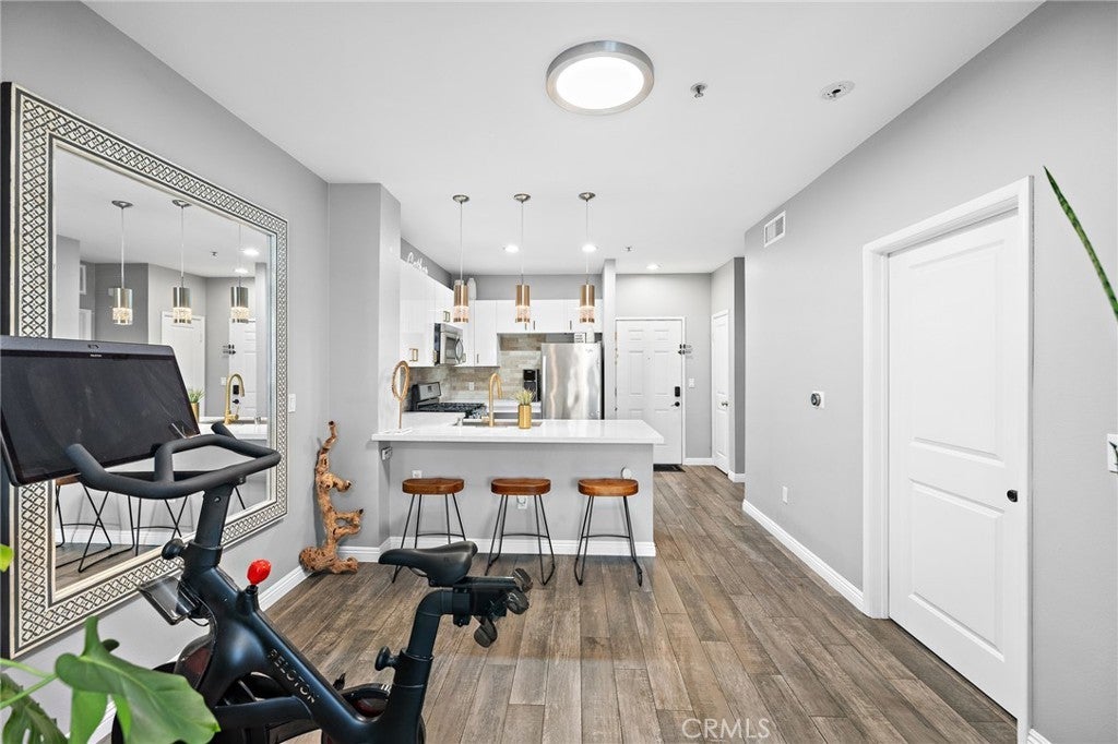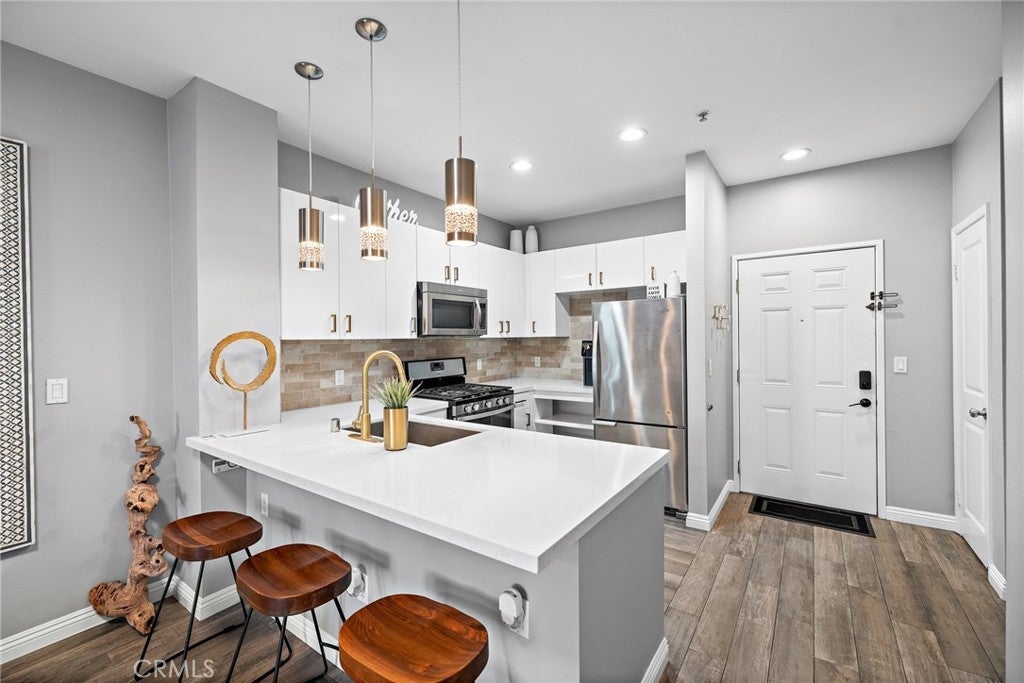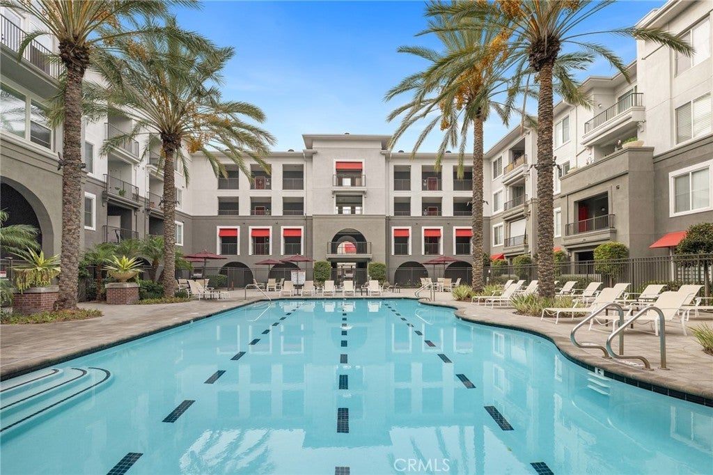 Platinum Triangle Condo! Near OC Vibe! Welcome to this stunning top-floor fully furnished condo at 1801 E Katella #4005 in Anaheim, where elegance meets convenience. Nestled in the highly desired Platinum Triangle neighborhood, this remodeled home has wonderful city views and boasts prime access to parking, an elevator, and storage, making it a true gem in the community. This unit comes with two parking spaces and a storage room. Step inside this delightful 784 square foot home, adorned with exquisite porcelain flooring that flows seamlessly throughout. The living space is bathed in nourishing natural light from large glass French doors that invite you to unwind on your private balcony. Enjoy evenings in your cozy living area, equipped with a large flat-screen TV, offers a perfect spot for relaxation. The modern kitchen features sleek white high-gloss cabinets with stylish brass hardware, a state-of-the-art pull-down brass faucet, and quartz countertops with elegant bar seating illuminated by beautiful LED pendant lights. With newer stainless-steel appliances and a new garbage disposal, every meal can be crafted with ease. Retreat to the spacious primary bedroom, designed for comfort with ample space for a king-sized bed. Revel in the grandeur of a lovely hanging light fixture and a generous walk-in closet that caters to all your storage needs. The updated bathroom features an updated sink with a touch-sensitive lighting mirror, Alexa speaker, a glass walk-in shower adorned with a stone mosaic floor, and Italian slate tiles. This home is complete with an efficiently designed laundry closet, accommodating new full-sized washer and dryer, and new shelving for perfect organization witth new tempered glass doors giving it a classy look. The entire home is freshly painted and impeccably cleaned, this residence is move-in ready! Enjoy the amenities of the Stadium Lofts Community including Water, Trash, Free Wi-Fi, AMPLE GUEST PARKING, Electric Car Charging, clubhouse, a sparkling pool and spa, a fully equipped gym with a Peloton room, a sauna, indoor lounges, and outdoor BBQ areas perfect for entertaining. Enjoy the vibrant local lifestyle, with top attractions like Angel Stadium, The Grove, Disneyland, and the Honda Center all at your doorstep, along with a plethora of dining and shopping options. Convenient freeway access to the 5 and 57 freeways ensures that everything you need is close to home. Do not miss the chance to call this exquisite abode your home!