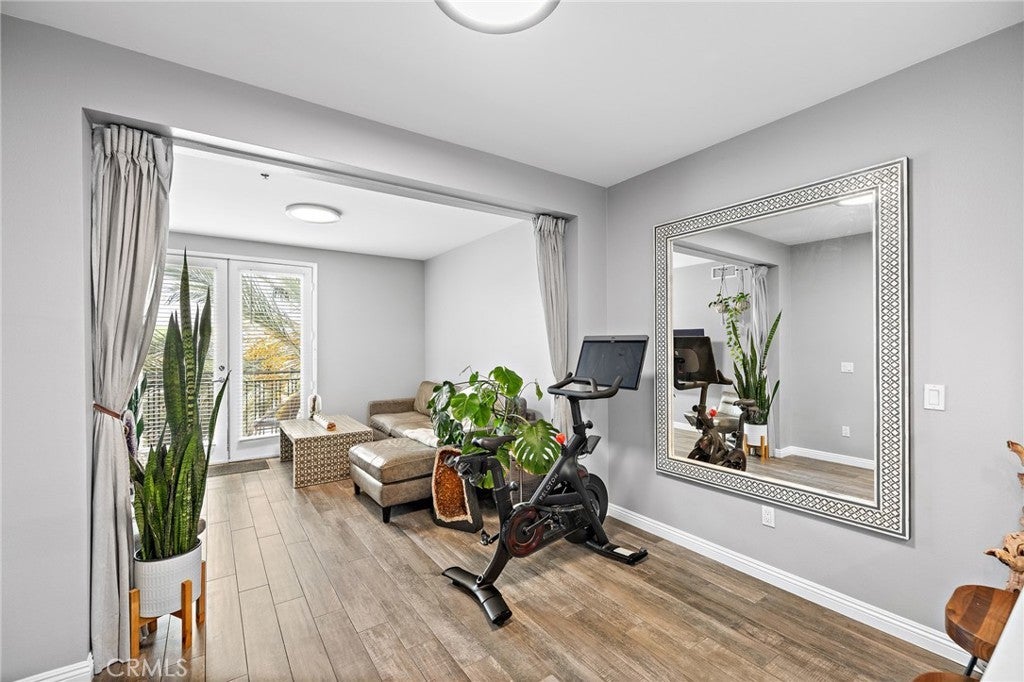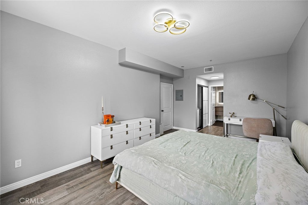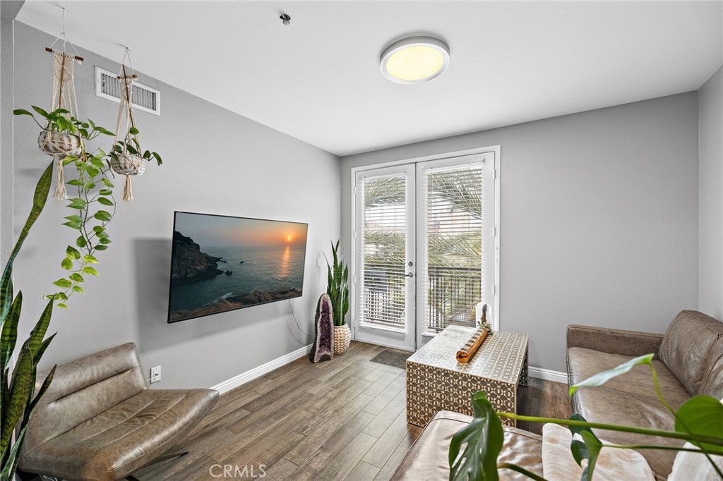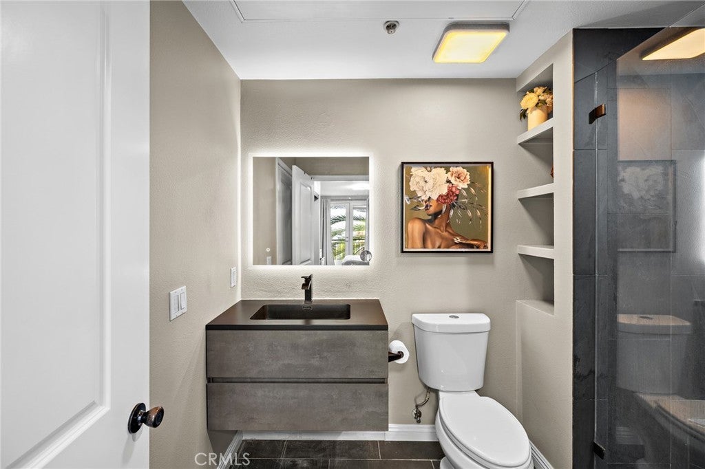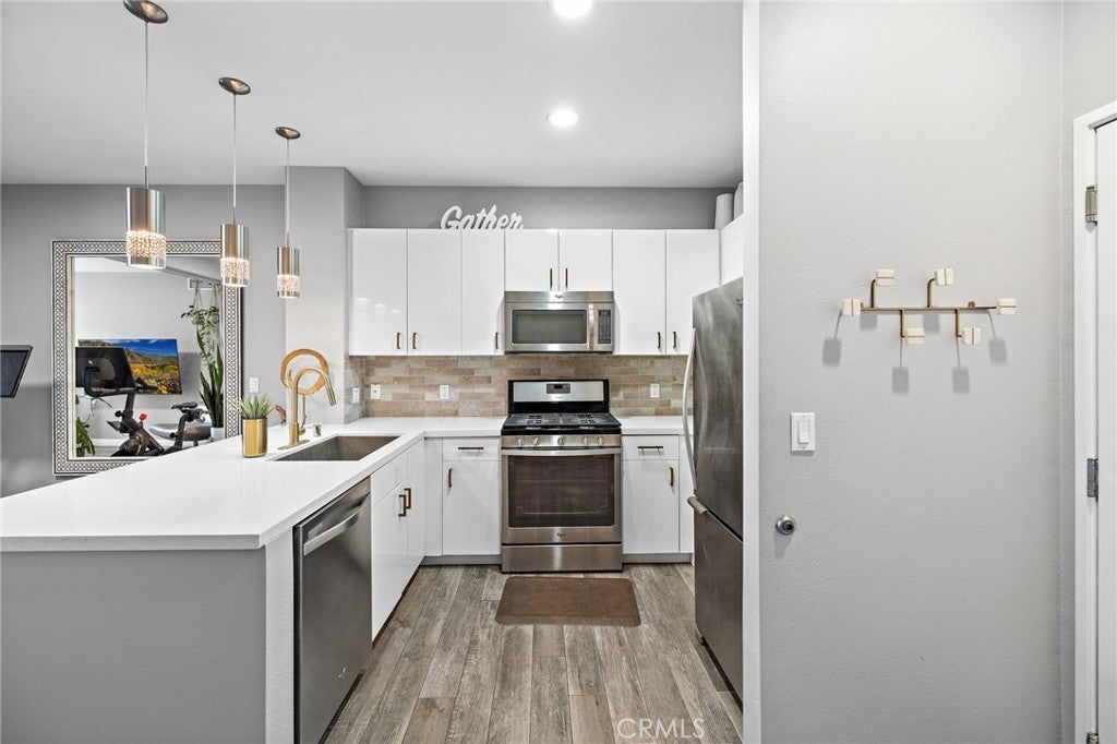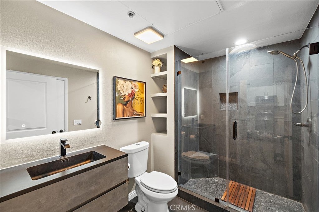 BIG PRICE ADJUSTMENT FOR TOTALLY REMODELED CONDO! ACT FACT! Platinum Triangle! OC Vibe! Top Floor! City View! Two Parking Spaces! Extra Storage Room! Stunning condo where elegance meets convenience. This home has wonderful city views and boasts prime access to parking, an elevator, and storage, making it a true gem in the community. This unit comes with two parking spaces and a storage room. Step inside this delightful 784 square foot home, adorned with exquisite porcelain flooring that flows seamlessly throughout. The living space is bathed in nourishing natural light from large glass French doors that invite you to unwind on your private balcony. Enjoy evenings in your cozy living area, equipped with a large flat-screen TV, offers a perfect spot for relaxation. The modern kitchen features sleek white high-gloss cabinets with stylish brass hardware, a state-of-the-art pull-down brass faucet, and quartz countertops with elegant bar seating illuminated by beautiful LED pendant lights. With newer stainless-steel appliances and a new garbage disposal, every meal can be crafted with ease. Retreat to the spacious primary bedroom, designed for comfort with ample space for a king-sized bed. Revel in the grandeur of a lovely hanging light fixture and a generous walk-in closet that caters to all your storage needs. The updated bathroom features an updated sink with a touch-sensitive lighting mirror, Alexa speaker, a glass walk-in shower adorned with a stone mosaic floor, and Italian slate tiles. This home is complete with an efficiently designed laundry closet, accommodating new full-sized washer and dryer, and new shelving for perfect organization witth new tempered glass doors giving it a classy look. The entire home is freshly painted and impeccably cleaned, this residence is move-in ready! Enjoy the amenities of the Stadium Lofts Community including Water, Trash, Free Wi-Fi, AMPLE GUEST PARKING, Electric Car Charging, clubhouse, a sparkling pool and spa, a fully equipped gym with a Peloton room, a sauna, indoor lounges, and outdoor BBQ areas perfect for entertaining. Enjoy the vibrant local lifestyle, with top attractions like Angel Stadium, The Grove, Disneyland, and the Honda Center all at your doorstep, along with a plethora of dining and shopping options. Convenient freeway access to the 5 and 57 freeways ensures that everything you need is close to home. Do not miss the chance to call this exquisite abode your home!