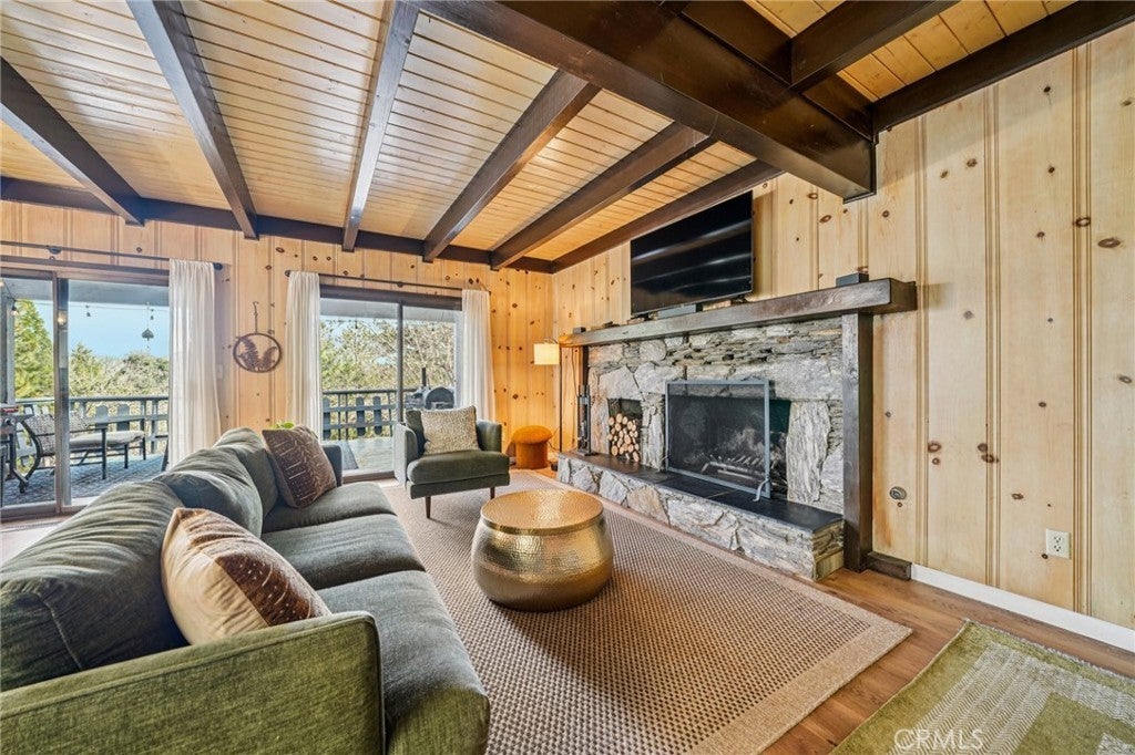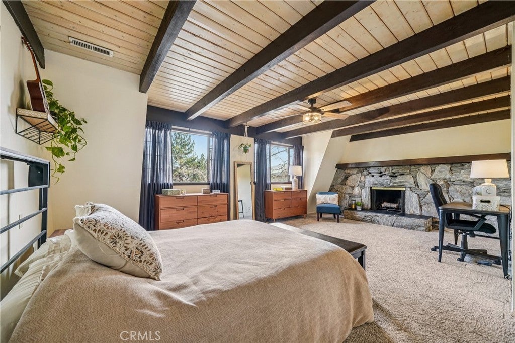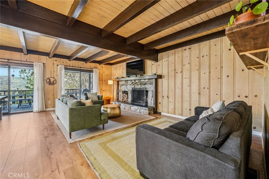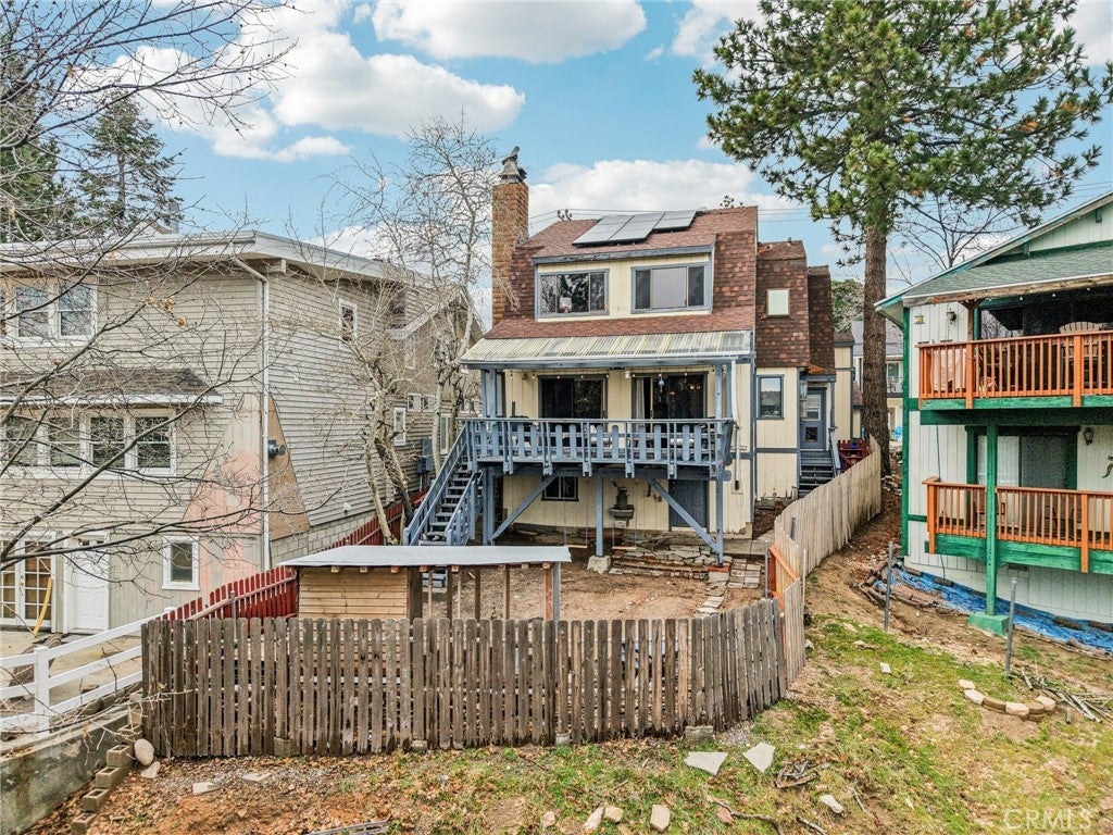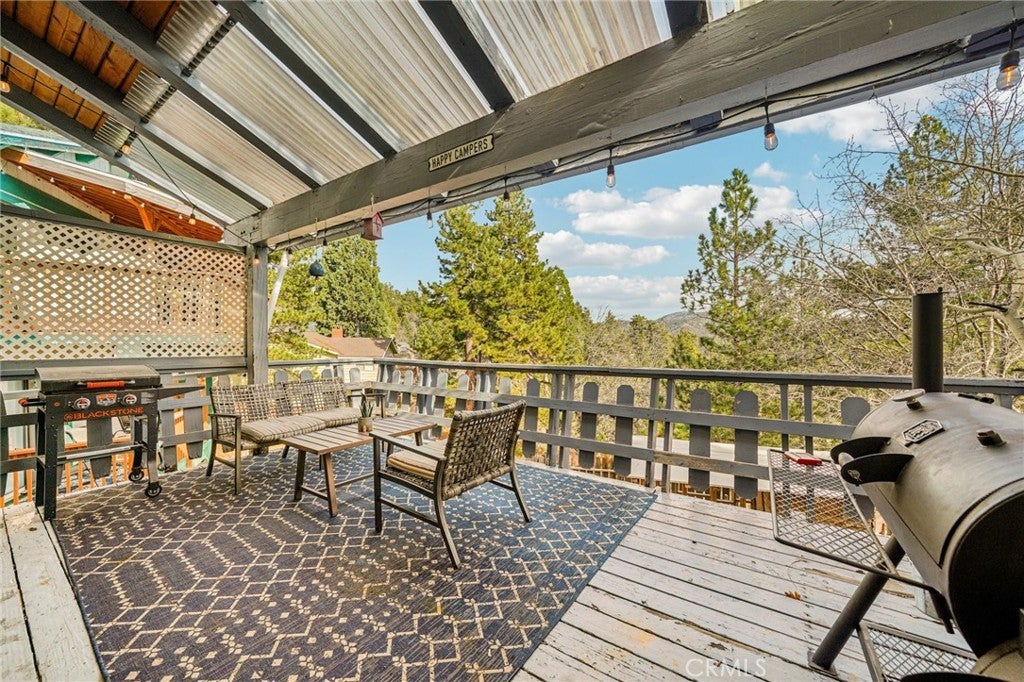 This well-maintained mountain home is located in a desirable hilltop neighborhood in Running Springs with convenient access right off a main highway. The property features a south-facing front that provides excellent winter sun exposure, easy flat-entry driveway, and an attached one-car garage, providing year-round accessibility. The home offers an open floor plan filled with abundant natural light with beautiful north-facing mountain views from the back deck. This creating an ideal setting for both everyday living and entertaining. The upper level includes three spacious bedrooms, including a large primary bedroom with its own fireplace. A fourth bedroom or office is located on the lower level and features pocket doors and its own closet space; not included on the title. The home includes two and one-half bathrooms. The kitchen has been updated with a replaced stovetop, oven, and dishwasher, along with a large stainless steel single-bowl sink. Heating is provided throughout the home for year-round comfort with an upper level furnace and lower level furnace. Flooring had been updated in 2020 with wood floors and carpet. The living room features a second fireplace, adding warmth and character to the space. Additional interior features include a large mudroom, well-suited for mountain living, as well as a finished build up utilized as a workshop and for additional storage. Plus, a finished attic that is used as a bonus playroom and adds additional space. Outdoor amenities include a large fenced backyard, a greenhouse, an expansive deck overlooking the mountains, and a leased solar system for energy efficiency and savings. The sellers are also leaving a snow blower and a generator that can be plugged into the home for power outages, providing added convenience and peace of mind.