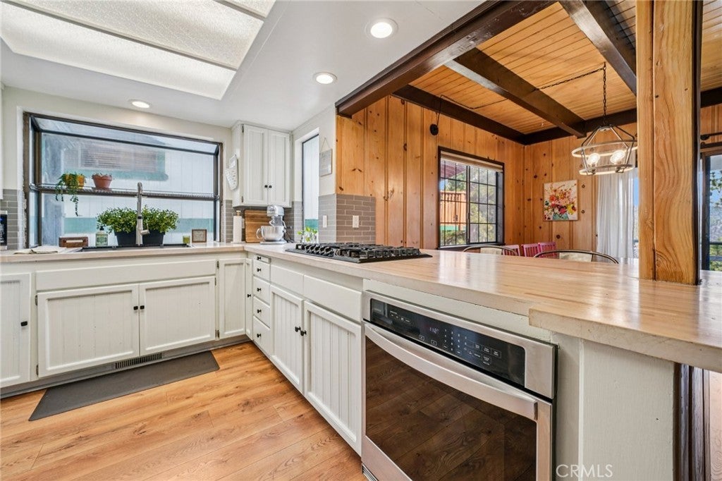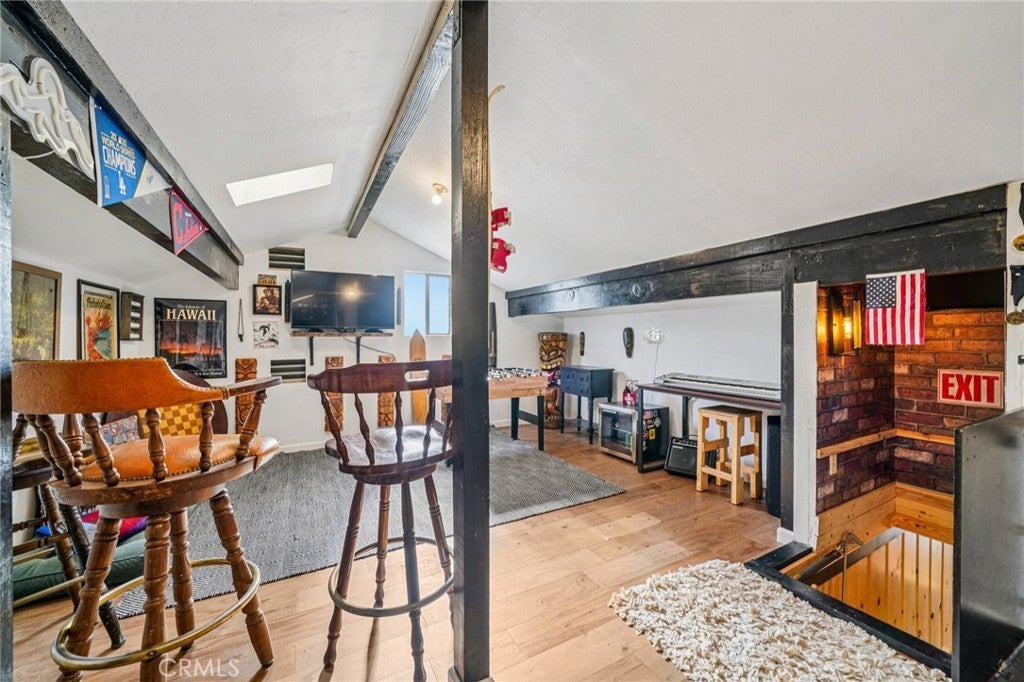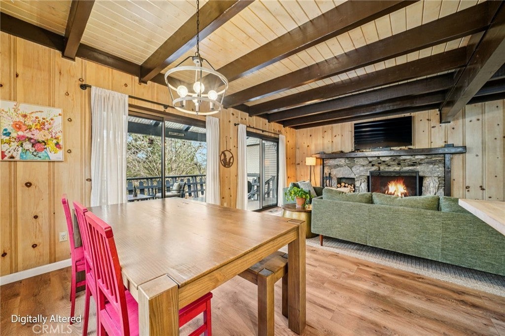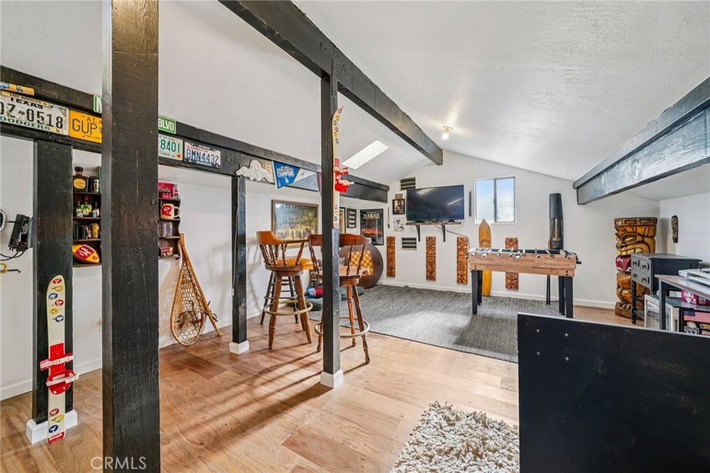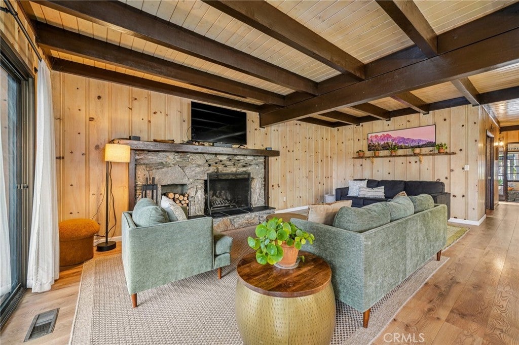 This well-maintained mountain home is located in a desirable hilltop neighborhood in Running Springs with convenient access right off a main highway. The property features a south-facing front that provides excellent winter sun exposure, easy flat-entry driveway, and an attached one-car garage, providing year-round accessibility. The home offers an open floor plan filled with abundant natural light with beautiful north-facing mountain views from the back deck. This creating an ideal setting for both everyday living and entertaining. The upper level includes three spacious bedrooms, including a large primary bedroom with its own fireplace. A fourth bedroom or office is located on the lower level and features pocket doors and its own closet space; not included on the title. The home includes two and one-half bathrooms. The kitchen has been updated with a replaced stovetop, oven, and dishwasher, along with a large stainless steel single-bowl sink. Heating is provided throughout the home for year-round comfort with an upper level furnace and lower level furnace. Flooring had been updated in 2020 with wood floors and carpet. The living room features a second fireplace, adding warmth and character to the space. Additional interior features include a large mudroom, well-suited for mountain living, as well as a finished build up utilized as a workshop and for additional storage. Plus, a finished attic that is used as a bonus playroom and adds additional space. Outdoor amenities include a large fenced backyard, a greenhouse, an expansive deck overlooking the mountains, and a leased solar system for energy efficiency and savings. The sellers are also leaving a snow blower and a generator that can be plugged into the home for power outages, providing added convenience and peace of mind.
