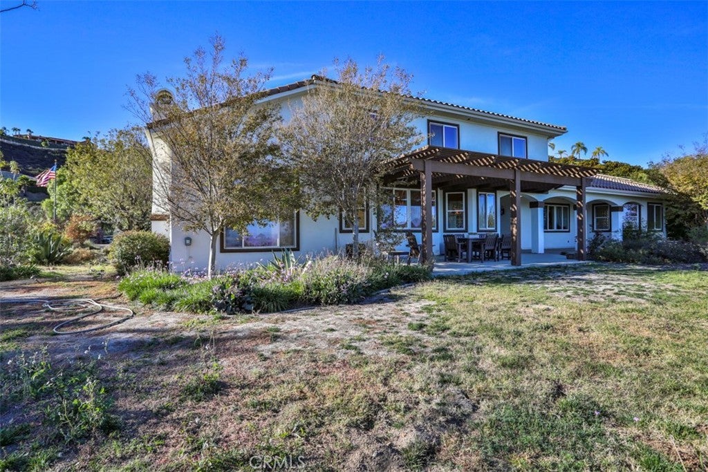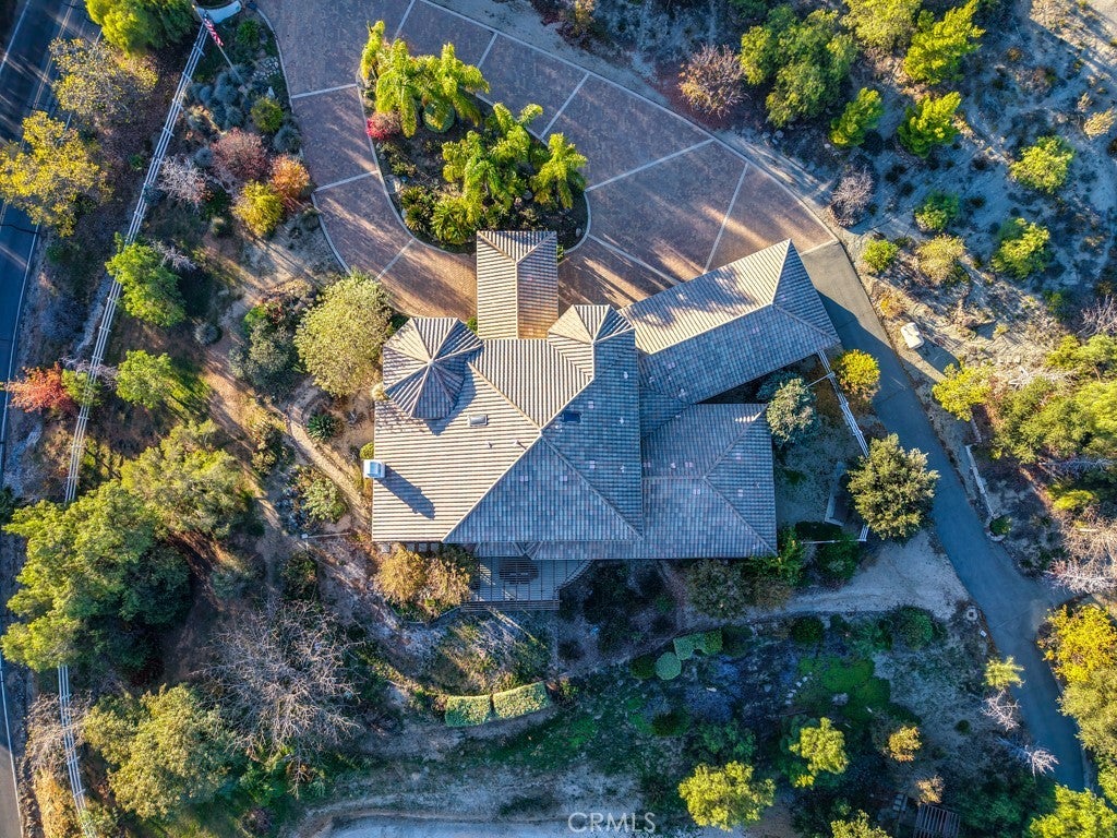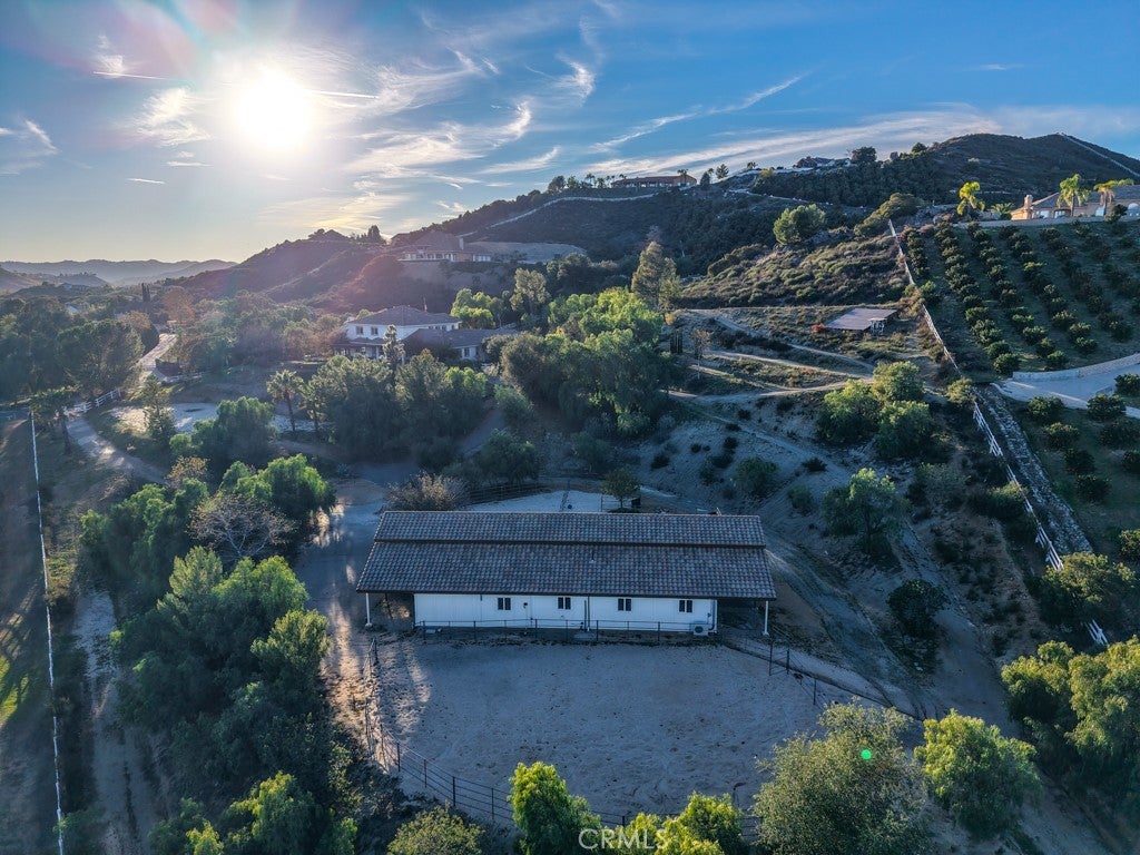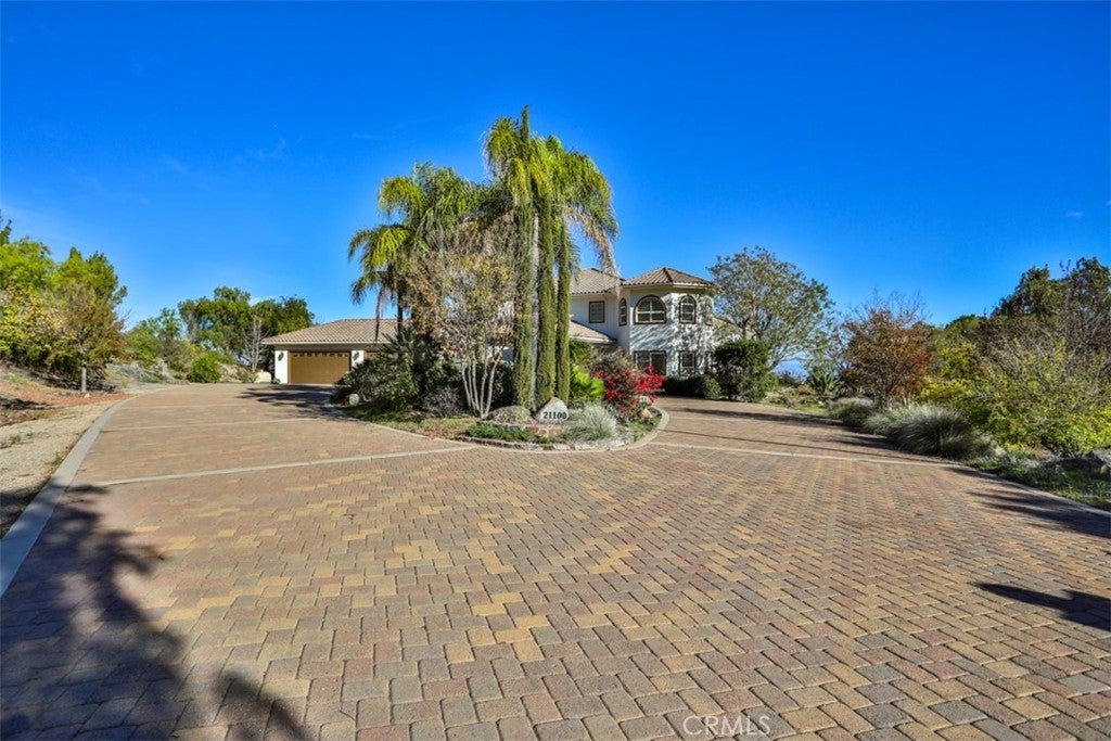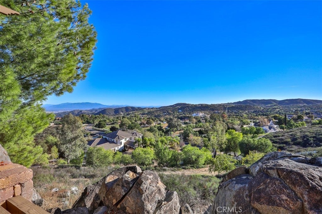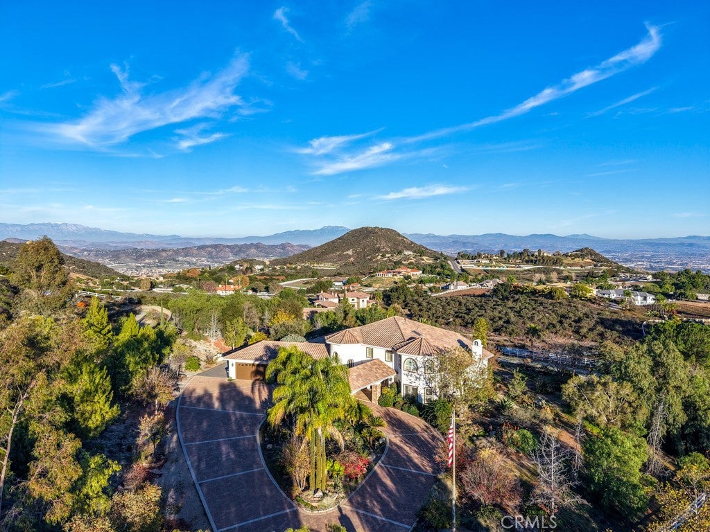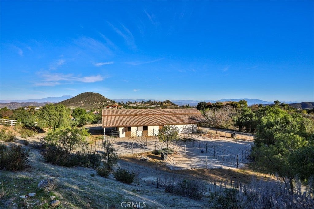 Stunning La Cresta Estate with Panoramic Valley, City-Light & Mountain Views Perched on just over five fully fenced acres, this exceptional custom La Cresta estate offers breathtaking views of the Temecula Valley, city lights, and surrounding mountains. A dramatic stone and wrought-iron gated entry leads to an expansive circular paver driveway, porte cochère, and elegant valet-style entrance. Inside, a grand foyer with soaring ceilings opens to an expansive great room featuring a fireplace, built-ins, and walls of windows framing the spectacular scenery. The open-concept layout includes a formal dining room, sunny breakfast nook, and a well-appointed kitchen with large island, built-in refrigerator, ample storage, and ideal for both entertaining and everyday living. The main-level primary suite offers a walk-in closet, dual vanities with makeup area, soaking tub, and spacious walk-in shower. Also on the main floor are a large office with closet, powder room, full bath, and an oversized laundry room with chute. Upstairs, a sweeping curved staircase leads to a secondary primary or junior suite with ensuite bath, two additional bedrooms, a full bath, and a light-filled bonus room/library. Outdoor living is equally impressive with covered patios, manicured grounds, fruit trees, walking paths, and a grassy area with room for a pool. At the highest point of the property, a viewing platform captures unforgettable 360-degree views and star-filled skies. Equestrian amenities include a large breezeway barn with three in-and-out stalls, tack room, workshop, paddocks, round pen, wash stations, and a separate living quarters featuring a bedroom, bathroom, kitchen, and living area with its own septic system—ideal for guests, caretakers, or rental potential. Additional fenced areas accommodate small livestock or gardening. This meticulously maintained, estate includes paid-off solar array, a tankless water heater, and mature landscaping throughout. Located in the desirable Santa Rosa Plateau, enjoy privacy, trails, and open space just minutes from schools, shopping, the 15 freeway, and Temecula Wine Country. A rare opportunity to own a refined equestrian estate offering luxury, versatility, and breathtaking views.