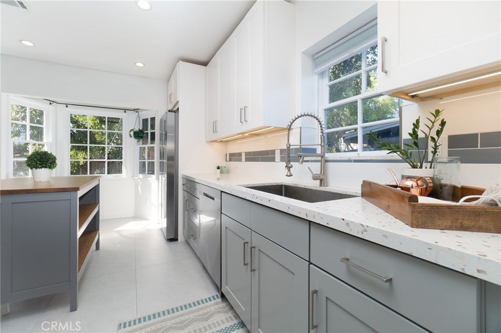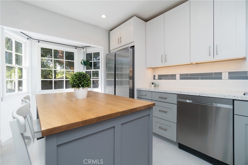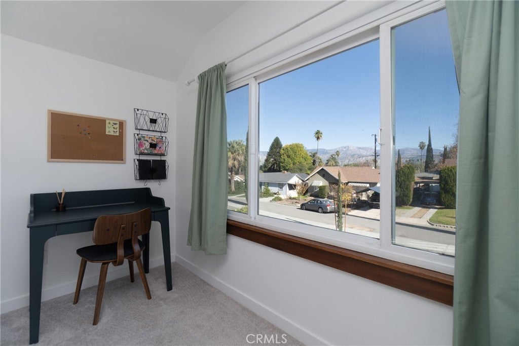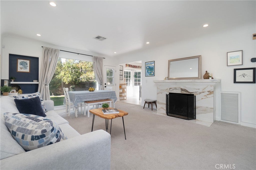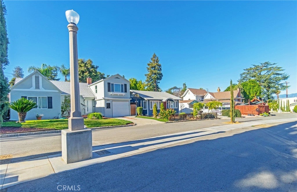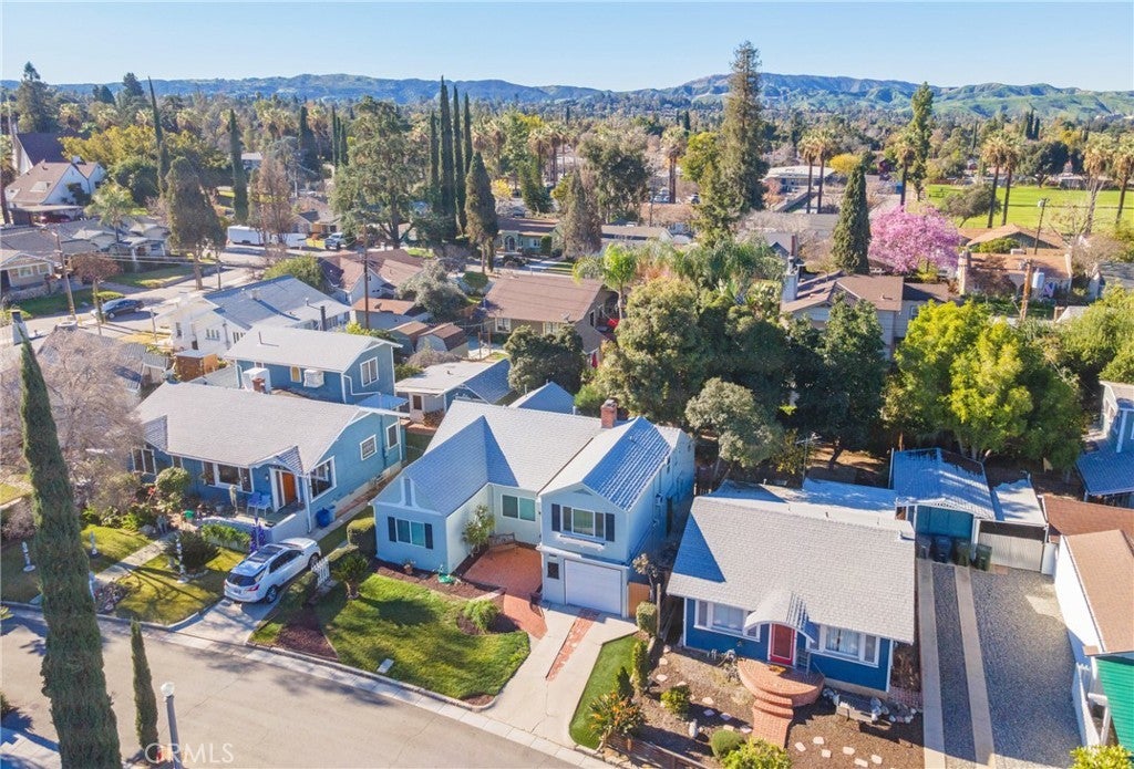 Welcome to Cypress Circle in South Redlands, a historical tree-lined street known for its collection of bungalow-style and Craftsman homes. The central promenade features towering Italian cypress trees that create a picturesque setting for leisurely neighborhood strolls. Don’t miss this rare opportunity to own a charming 1932 Tudor Revival inspired home with three bedrooms and three bathrooms – the perfect blend of modern comfort and original character. Cross the classic brick patio set in a basket weave pattern to the front door, and enter into the over-sized living and dining room. This inviting space features mountain views, plaster walls, a dramatic floor-to-ceiling window, a wood-burning fireplace, a built-in bookshelf, and Art Deco details. The expansive window fills the home with natural light and overlooks the lush backyard, highlighted by a mature lemon tree. Just off the main living area, the recently updated kitchen offers newer Samsung® smart appliances, quartz counter-tops, an island with seating, exposed brick, and a sunlit bay window breakfast nook. The first floor includes a guest/kid's’ room with mountain views, an updated hall bath, and an over-sized primary suite with mini-split AC. The beautifully remodeled en-suite bathroom features a double shower with four shower heads (two rainfall), pebble flooring, dual sinks, and floating shelves. Behind a stylish barn door, stairs lead to the second-story third bedroom. With its own bathroom and mountain views, this versatile space works well as an office, guest suite, older kid’s room, or second primary. The private backyard offers fruit trees, lawn space, and a large stone fireplace ideal for outdoor entertaining. Additional highlights include a letter box, coved ceilings, recessed lighting, central heat and AC, a laundry room, a new roof (April 2025), and storage in the attached garage. Located near Prospect Park and downtown Redlands. With its rare blend of history, upgrades, and location, this home won’t stay on the market long—schedule your showing before this Cypress Circle gem is gone.