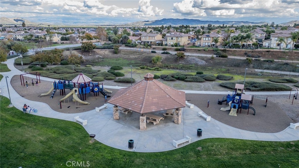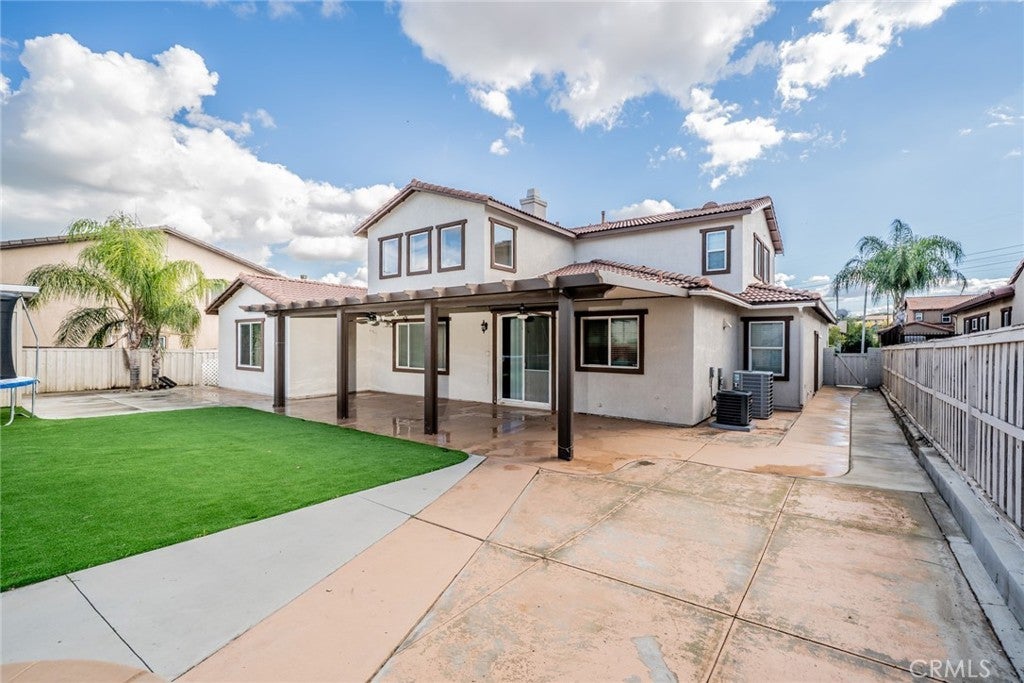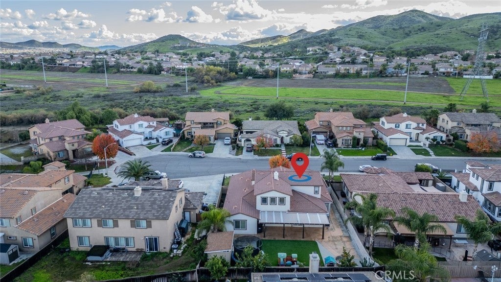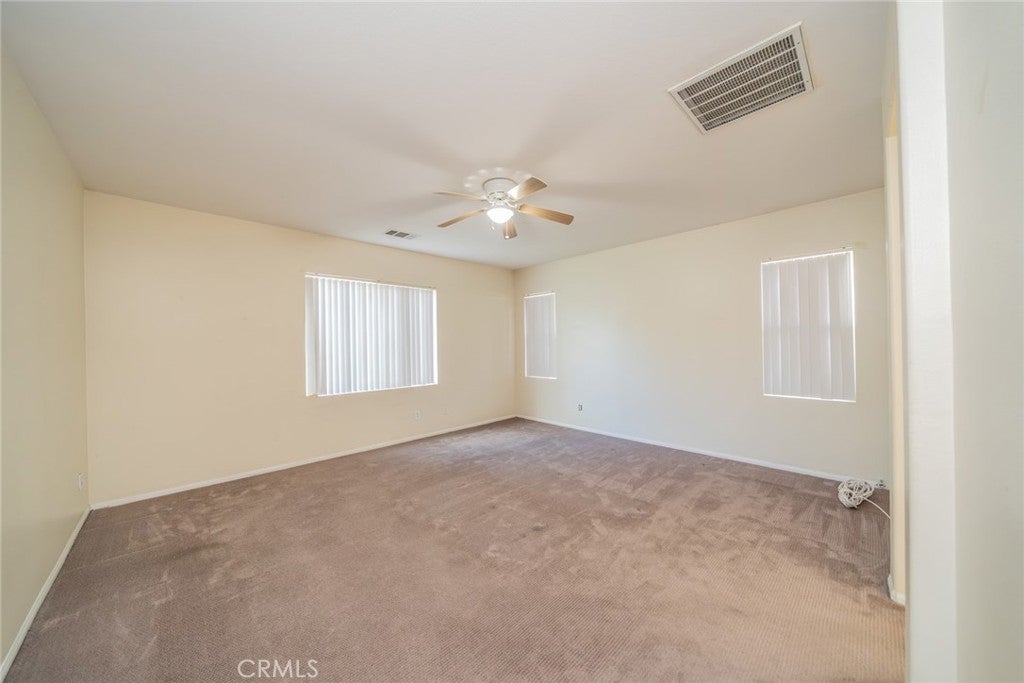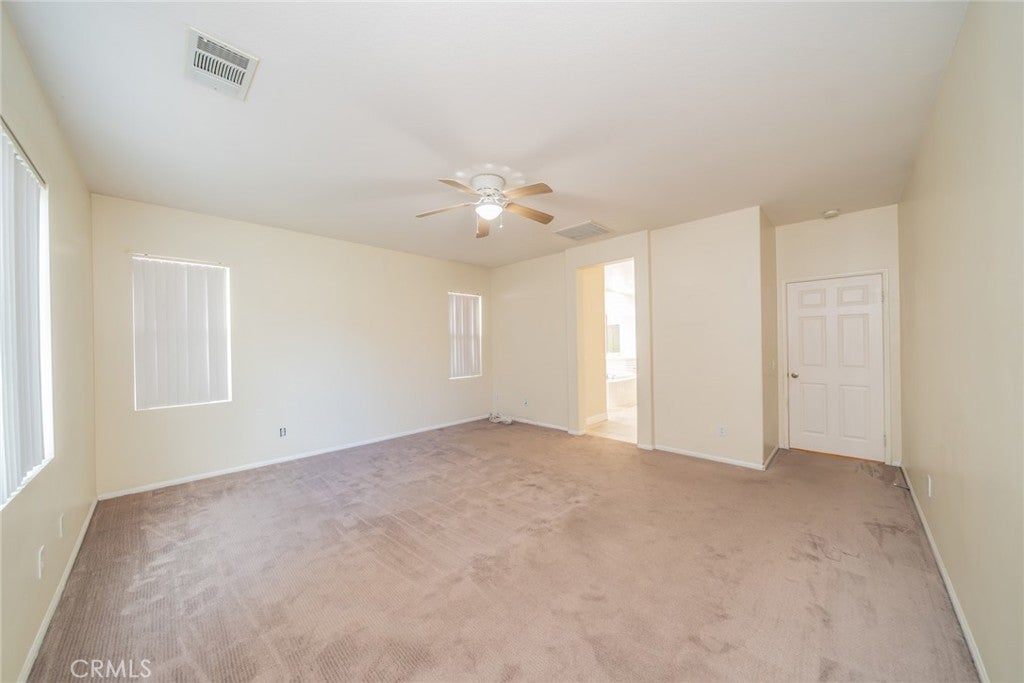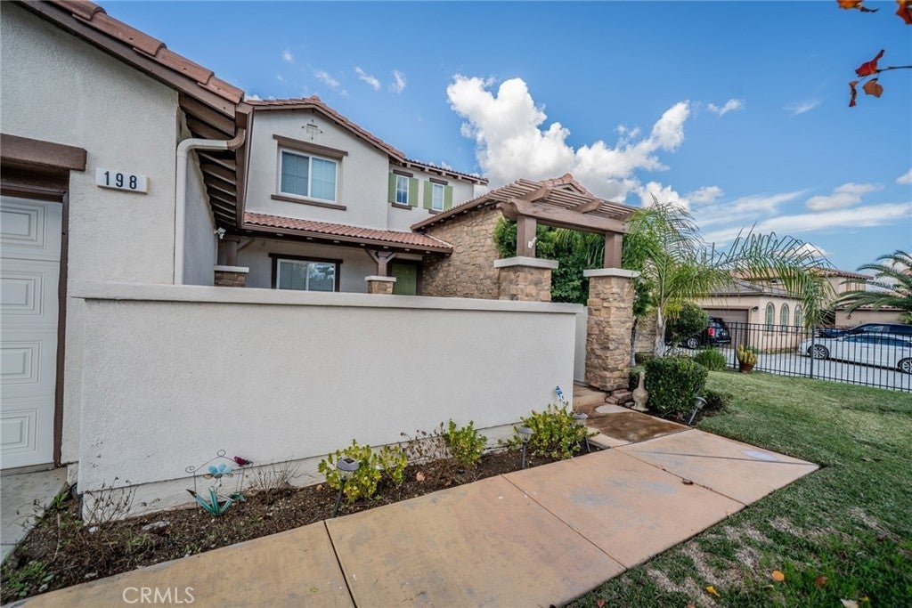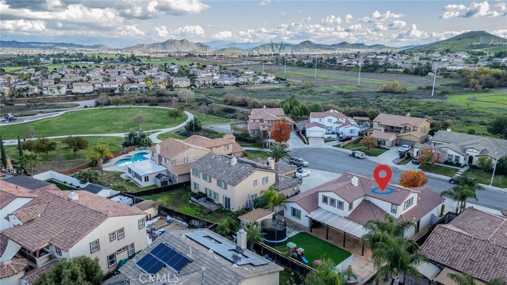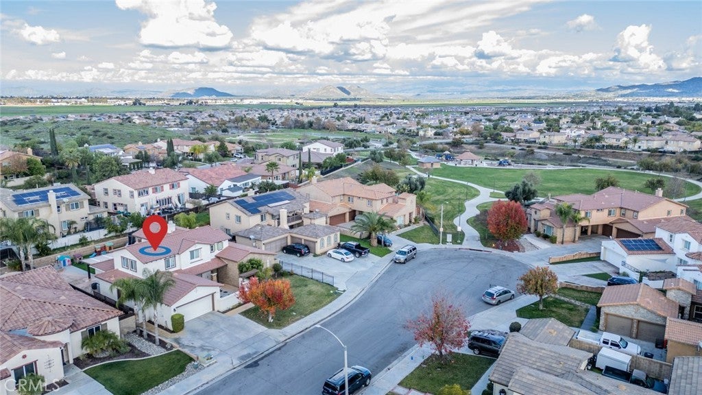 Gorgeous 4-bedroom, 2.5-bath residence with a 4-car garage with courtyard entrance, located in a quiet and highly desirable Perris neighborhood at the end of the Cul-De-Sac, right next to Monument Ranch Park and very close to Granite Hills Elementary School. NEW 2 BRAND-NEW AIR CONDITIONERS & SYSTEM!!! NEW LARGE WATER HEATER!! This beautifully designed home offers a spacious open floor plan with a HUGE primary suite on the FIRST LEVEL!!! complete with a spa-like bathroom, separate shower, oval bathtub, and walk-in closet, along with an additional spacious bedroom downstairs. Upon entering the family room, enjoy soaring two-story ceilings, a refined ceiling fan, and abundant natural light. Thoughtfully designed for comfort and entertaining, the main level features separate, generous living and dining rooms, a customized built-in desk with fine cabinetry ideal for a home office, elegant laminated waterproof flooring, upgraded baseboards and crown molding, an enhanced fireplace, and stylish ceiling fans throughout. The gourmet kitchen with beautifully designed granite countertops boasts a large center island, a walk-in pantry!! perfect for gatherings. Downstairs, a large Laundry room with shelves!! Upstairs, a spacious loft with built-in storage overlooks the family room and is accompanied by two generously sized bedrooms and a large bathroom. The expansive 4-car garage offers ample space for parking and additional storage. The beautifully landscaped backyard features new turf, a decorative fountain, an upgraded covered patio with recessed lighting and ceiling fan throughout, and a storage shed—ideal for relaxing or entertaining. Additional upgrades include a freshly painted exterior. This move-in-ready home offers modern comfort, style, and exceptional functionality throughout. NO HOA!!!