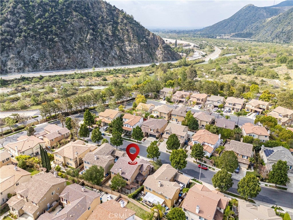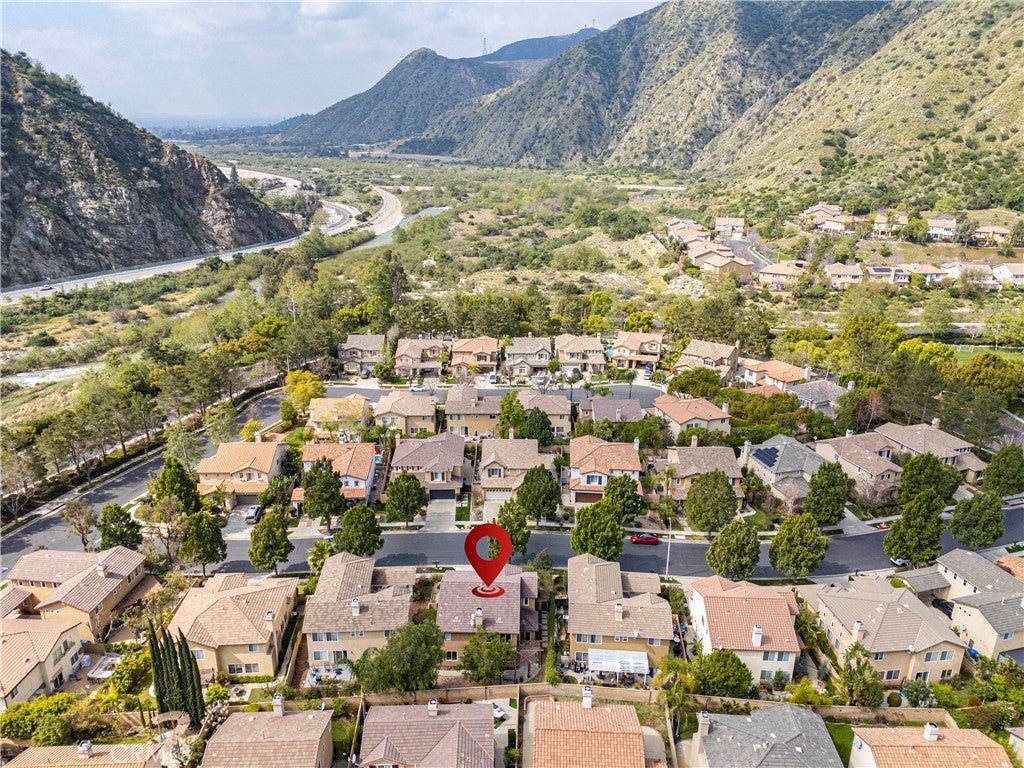 Nestled within the highly desirable gated community of Mountain Cove in Azusa, this beautifully maintained two-story home offers a rare foothill setting surrounded by the scenic San Gabriel Mountains and the nearby San Gabriel River. The community is known for its peaceful canyon atmosphere, natural surroundings, and resort-style amenities. This spacious residence offers approximately 2,481 square feet of living space with 4 bedrooms and 3 bathrooms, including a convenient bedroom and remodeled three-quarter bathroom on the main level. Inside, the home features a bright and open floor plan with soaring ceilings, crown molding, recessed lighting, plantation shutters, and a combination of tile and wood flooring throughout. The formal living and dining areas flow seamlessly into the inviting family room, highlighted by a stone fireplace and built-in entertainment center. The kitchen is designed for both function and gathering, offering a center island with sink, tile countertops, gas cooktop, built-in oven and microwave, stainless steel refrigerator, abundant cabinetry, and a dining area with sliding glass doors that lead to the backyard. Upstairs, the spacious primary suite features plantation shutters, generous closet space including a walk-in closet, and a private bathroom with dual sinks, a soaking tub, and a separate glass-enclosed shower. Additional bedrooms are well sized and share a full hallway bathroom with dual sinks. A separate upstairs laundry room adds everyday convenience. The backyard offers a relaxing outdoor retreat with a covered pergola patio, charming swing seating, and space to unwind while enjoying the tranquil foothill surroundings. Residents of Mountain Cove enjoy resort-style amenities including a community pool and spa, playground, clubhouse, picnic areas, and expansive greenbelts. The neighborhood is surrounded by natural beauty with nearby walking paths, river views, and access to hiking trails in the San Gabriel Mountains, while still conveniently located near parks, shopping, dining, Azusa Pacific University, Citrus College, and Metro Gold Line access. This home offers the perfect blend of comfort, space, and scenic foothill living in one of Azusa’s most sought-after gated communities.
