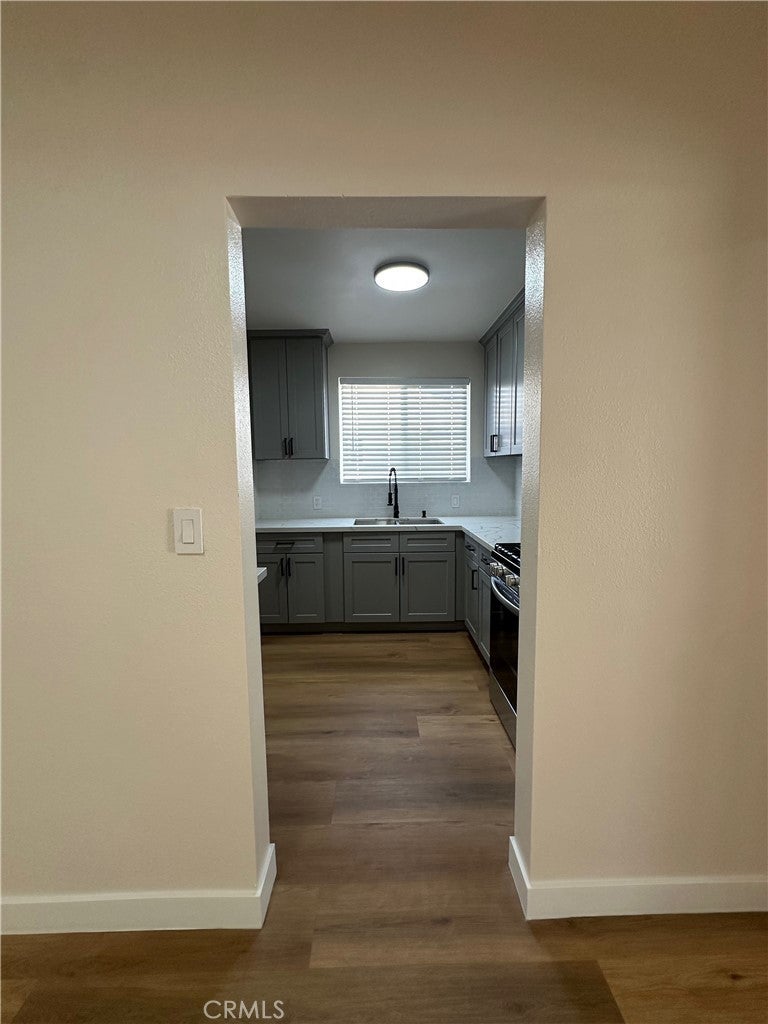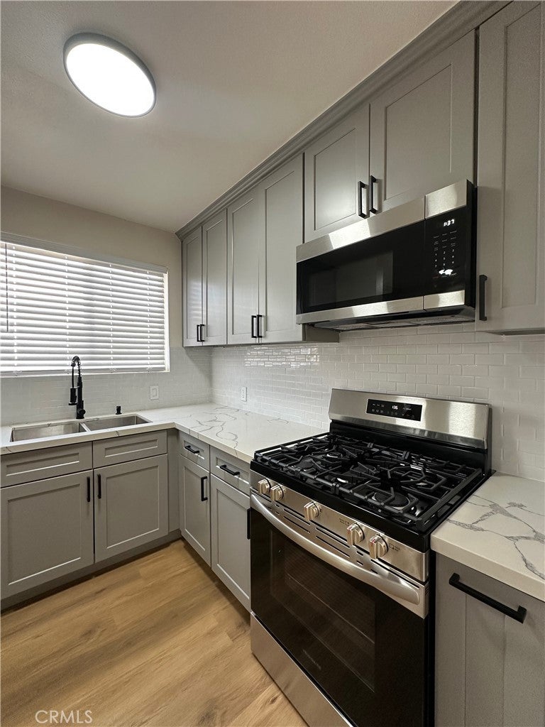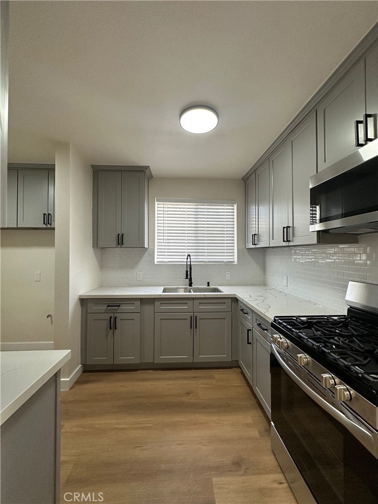 Beautifully renovated 3-bedroom, 1-bath home featuring a modern, updated interior. The kitchen offers stainless steel appliances, including a six-burner gas range with hood, attached microwave, and refrigerator. Interior washer and dryer hookups add convenience. The home includes a private gated entry leading to a backyard/patio area, perfect for outdoor enjoyment. Clean finishes and thoughtful upgrades throughout make this home move-in ready.
