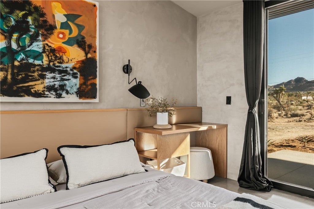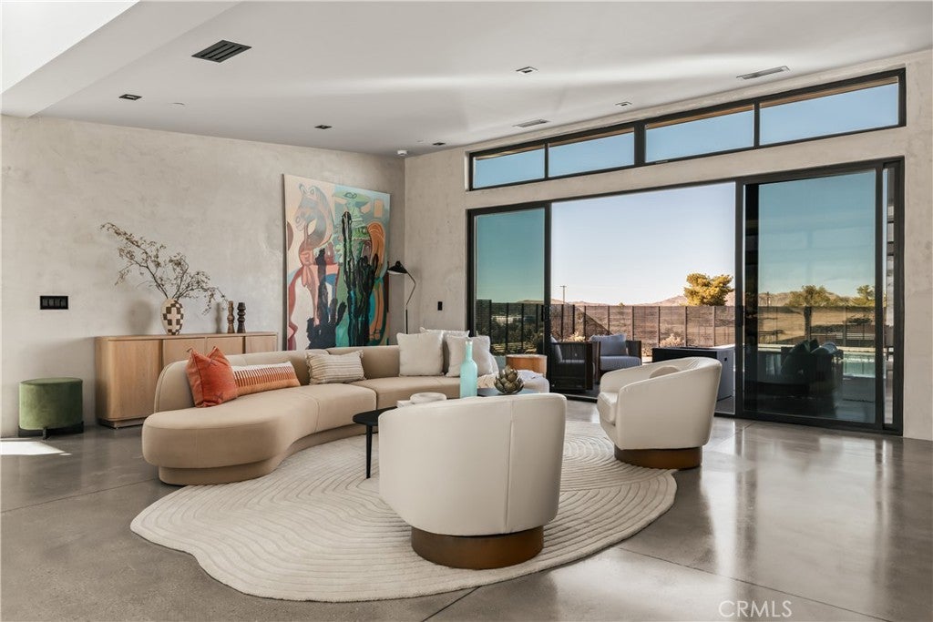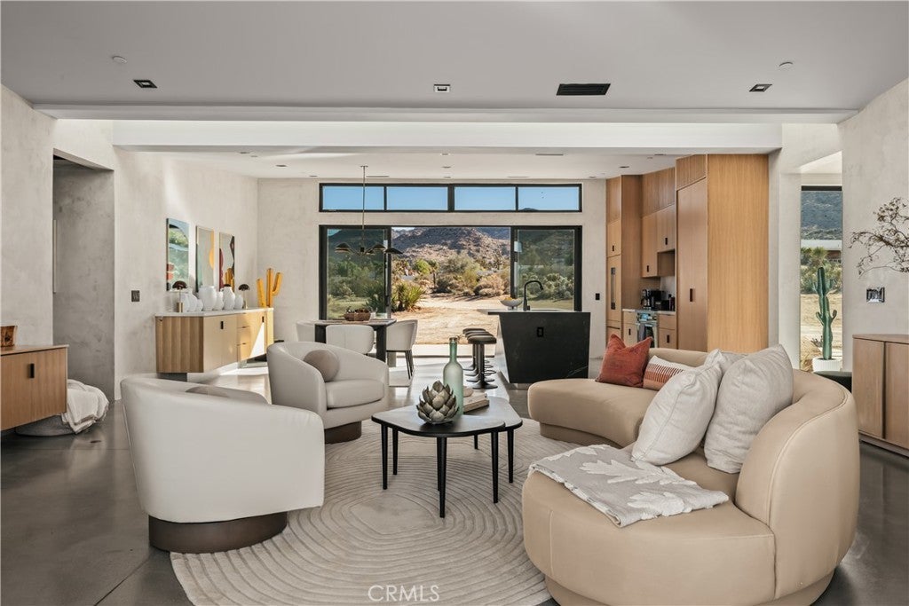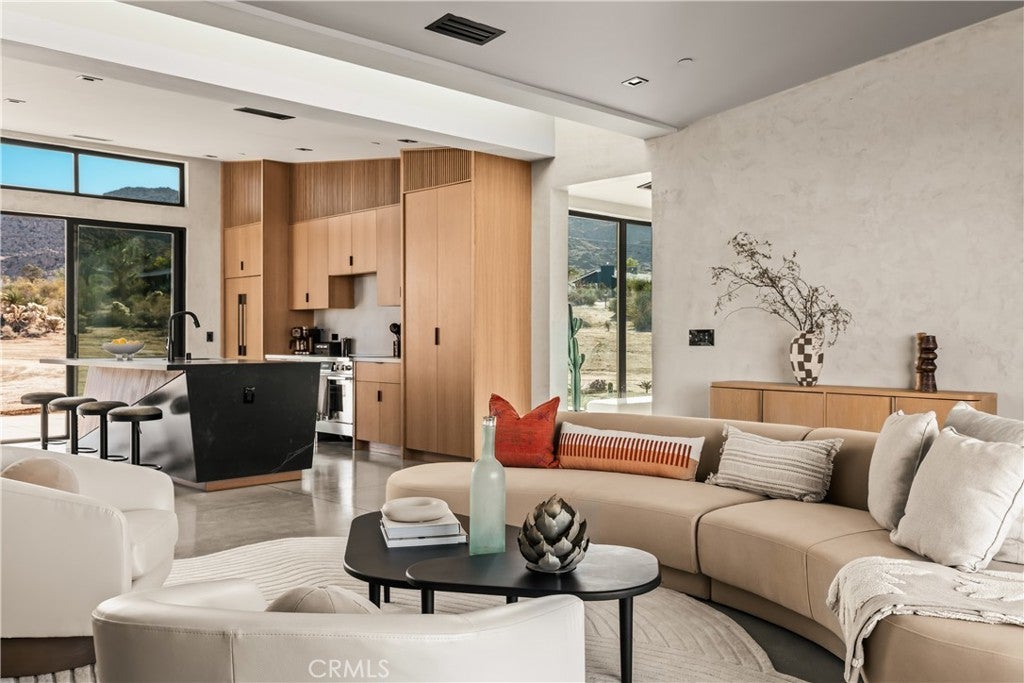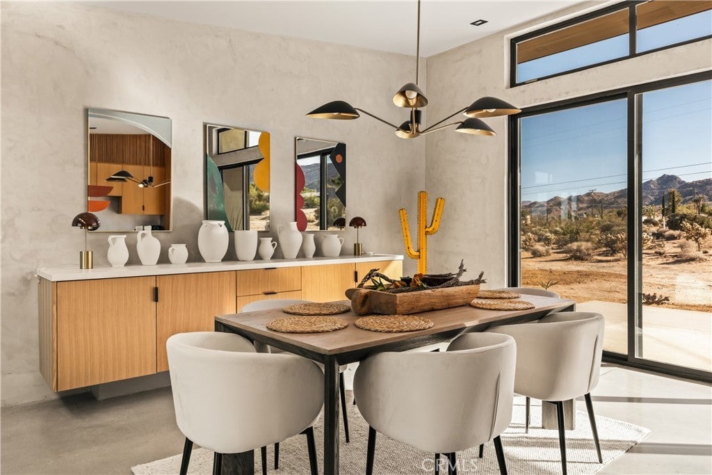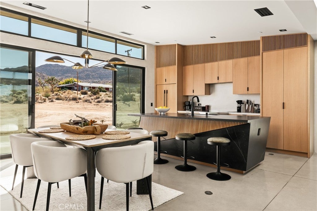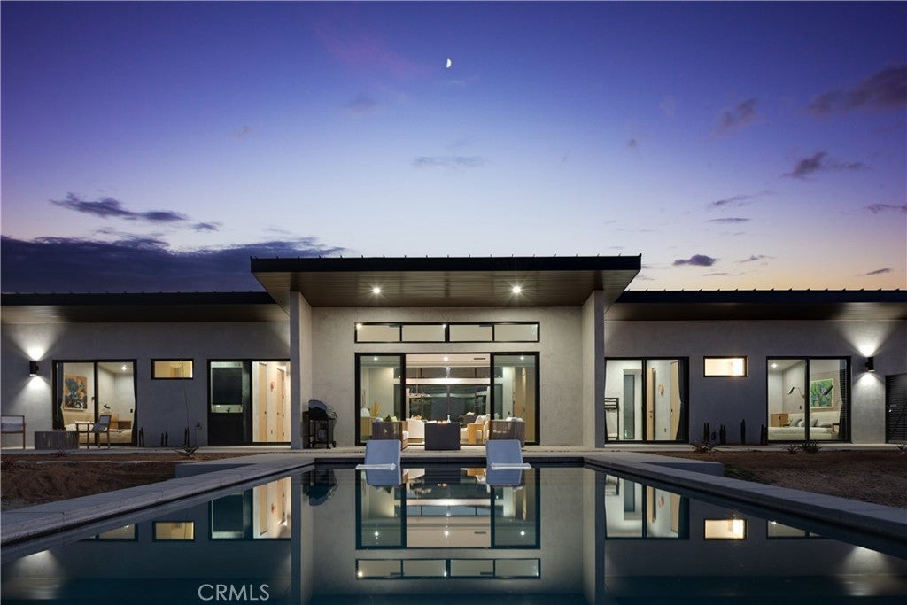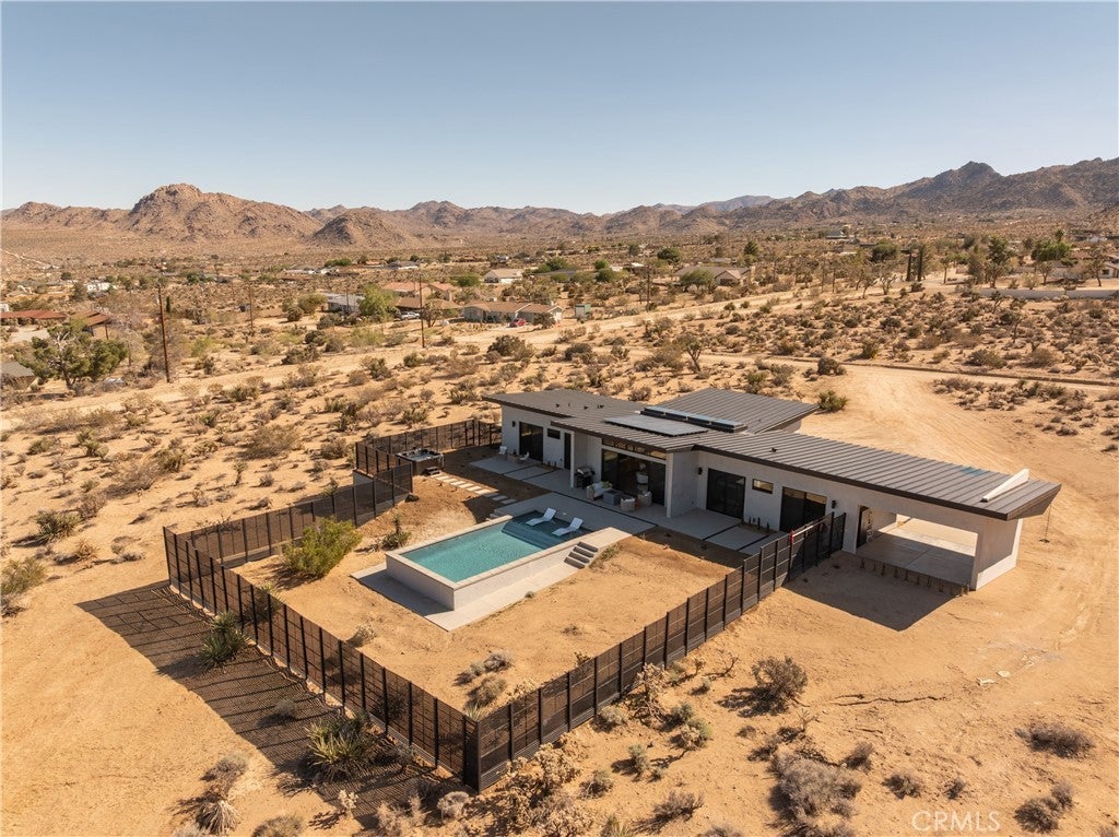 An extraordinary modernist eco-friendly home where sustainability meets inspired design. Located in the heart of Joshua Tree, this ultra luxurious desert retreat blends modern design with stunning desert lighting, seamless indoor-outdoor living ambiance and breathtaking panoramic desert views. This home includes design aesthetics such as 12-foot vaulted ceilings; cantilevered eves; open design element to maximize the outdoor experience; an open skylight in the living room and midcentury gullwing roof concept; an extensively functional floor plan; east and west wing ensuite bedrooms for privacy. The resort style backyard features a beautiful inground pool and privately fenced backyard while transitioning into the great room and chef’s kitchen for easy entertainment. The custom kitchen features a professionally designed 3-D island, handmade cabinetry, countertops imported from Spain, premium Fisher & Paykel and Bosch appliances. The bathrooms are finished with elegant Italian terrazzo flooring and imported tile. Designed for enjoyment as a private sanctuary, holistic retreat or a cash flow investment. The home is licensed as a daily rental and qualifies as an Airbnb “Luxe” property. Constructed with sustainable, high efficiency Structural Concrete Insulated Panels (SCIP), the home offers superior energy performance with zero air exchange, reduced maintenance, and enhanced durability, with resistance to mold, fire and seismic activity. Qualifying for Passive House Designation. Situated on a prime “Upper Friendly Hills” lot with 360-degree mountain views, city water services and convenient access to the National Park and local amenities. Additional features include owned solar, fire sprinkler system, two-car carport with EV charger, dual-zone HVAC with energy efficient heat pumps, Nest thermostats, laundry closet with washer and dryer, pool heater, and a 7-person, 69 jet Cal Spa. Offered fully operational with short term rental permit and professional management in place. Currently under consideration for an AIA Design Award recognized for its innovation integration form, function and environmental resilience.