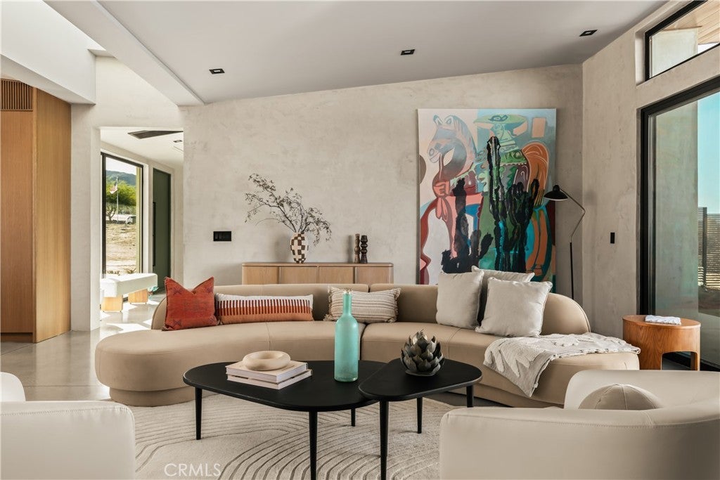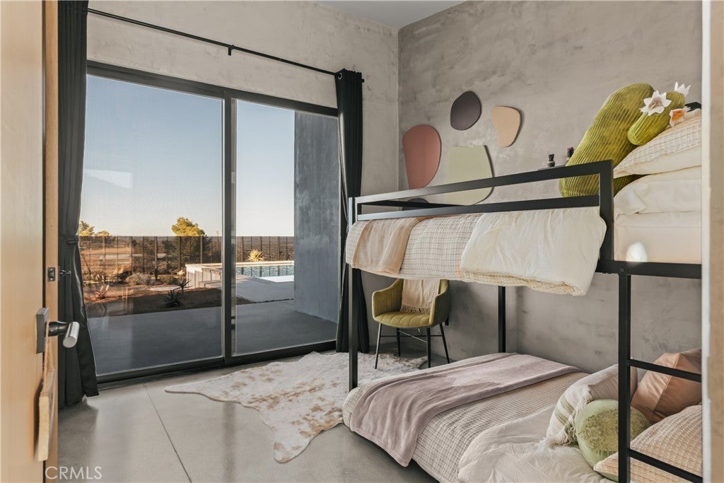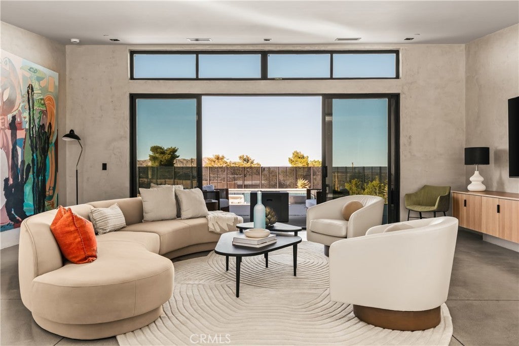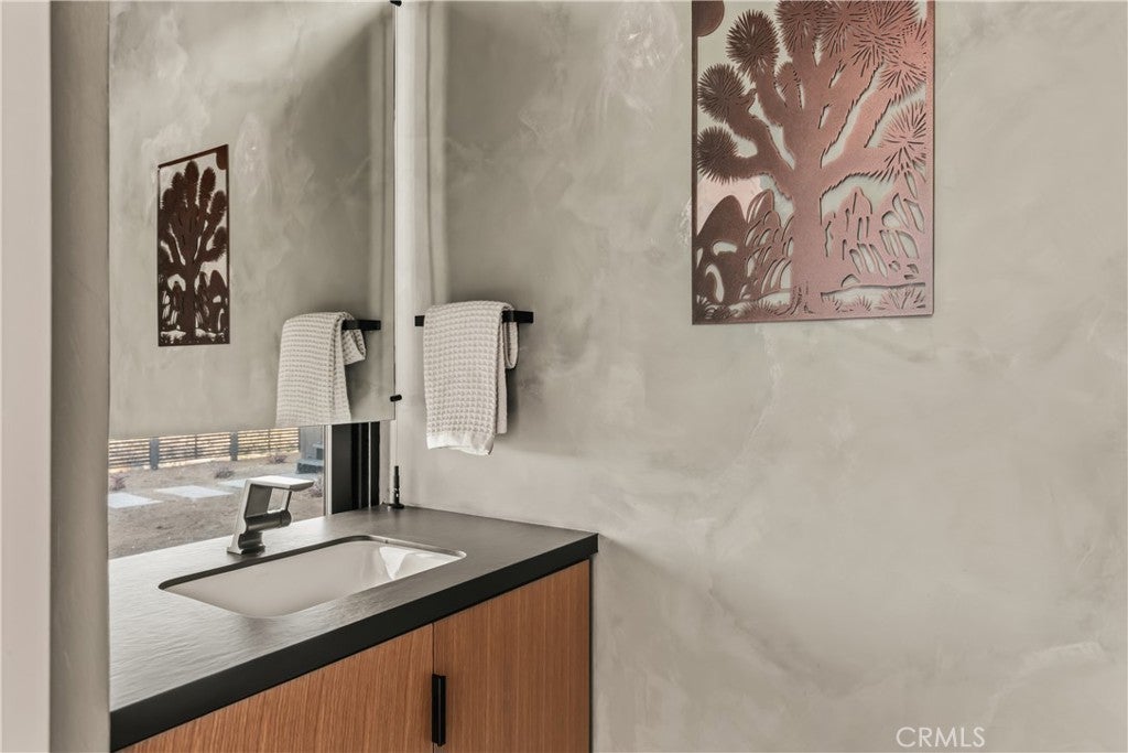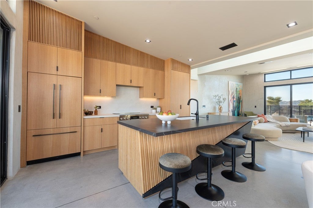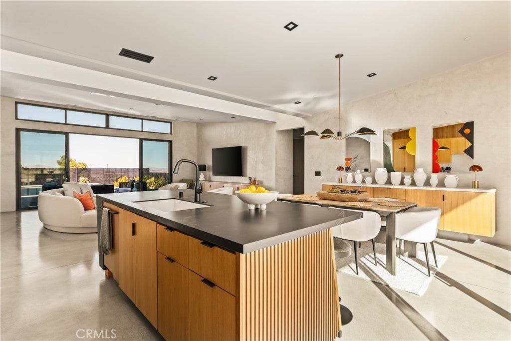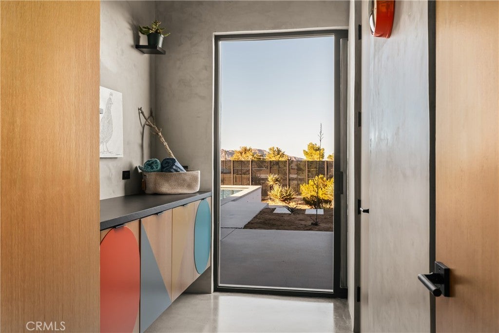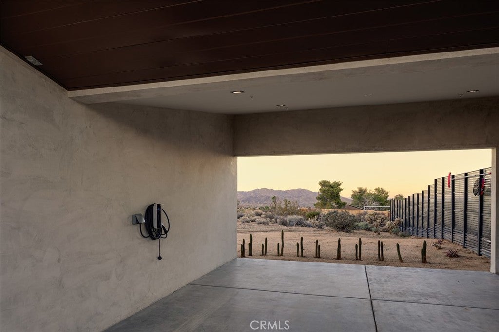An extraordinary modernist eco-friendly home where sustainability meets inspired design. Located in the heart of Joshua Tree, this ultra luxurious desert retreat blends modern design with stunning desert lighting, seamless indoor-outdoor living ambiance and breathtaking panoramic desert views. This home includes design aesthetics such as 12-foot vaulted ceilings; cantilevered eves; open design element to maximize the outdoor experience; an open skylight in the living room and midcentury gullwing roof concept; an extensively functional floor plan; east and west wing ensuite bedrooms for privacy. The resort style backyard features a beautiful inground pool and privately fenced backyard while transitioning into the great room and chef’s kitchen for easy entertainment. The custom kitchen features a professionally designed 3-D island, handmade cabinetry, countertops imported from Spain, premium Fisher & Paykel and Bosch appliances. The bathrooms are finished with elegant Italian terrazzo flooring and imported tile. Designed for enjoyment as a private sanctuary, holistic retreat or a cash flow investment. The home is licensed as a daily rental and qualifies as an Airbnb “Luxe” property. Constructed with sustainable, high efficiency Structural Concrete Insulated Panels (SCIP), the home offers superior energy performance with zero air exchange, reduced maintenance, and enhanced durability, with resistance to mold, fire and seismic activity. Qualifying for Passive House Designation. Situated on a prime “Upper Friendly Hills” lot with 360-degree mountain views, city water services and convenient access to the National Park and local amenities. Additional features include owned solar, fire sprinkler system, two-car carport with EV charger, dual-zone HVAC with energy efficient heat pumps, Nest thermostats, laundry closet with washer and dryer, pool heater, and a 7-person, 69 jet Cal Spa. Offered fully operational with short term rental permit and professional management in place. Currently under consideration for an AIA Design Award recognized for its innovation integration form, function and environmental resilience.