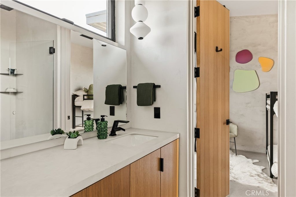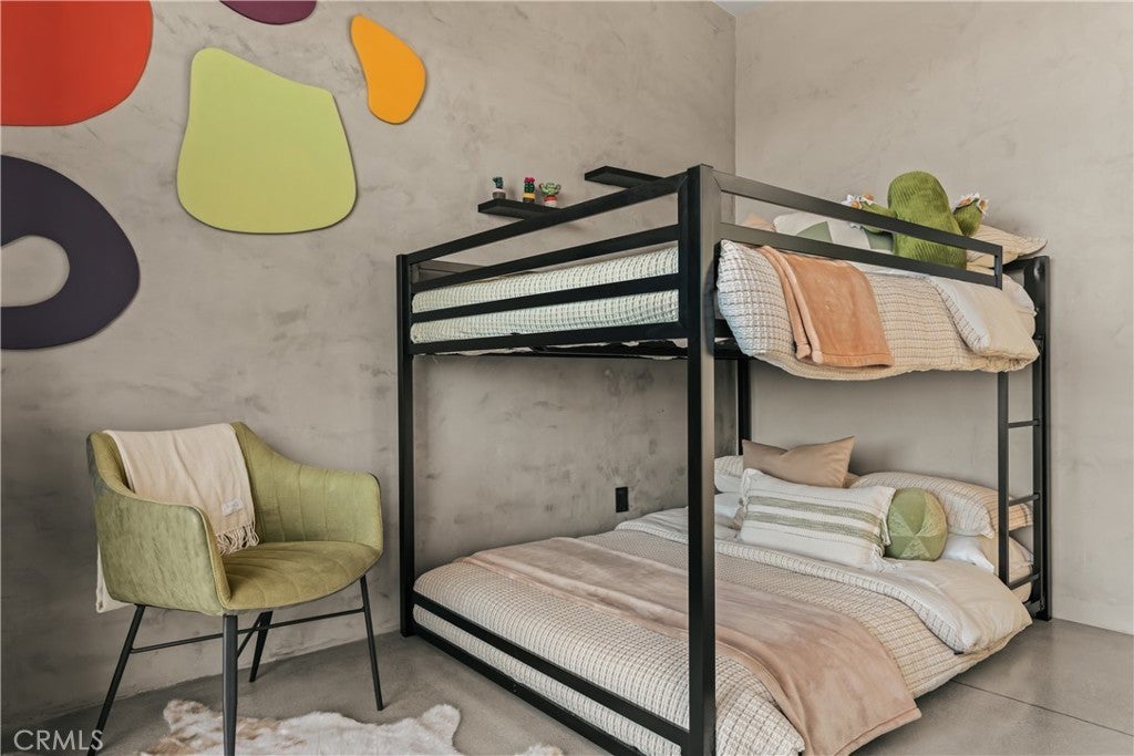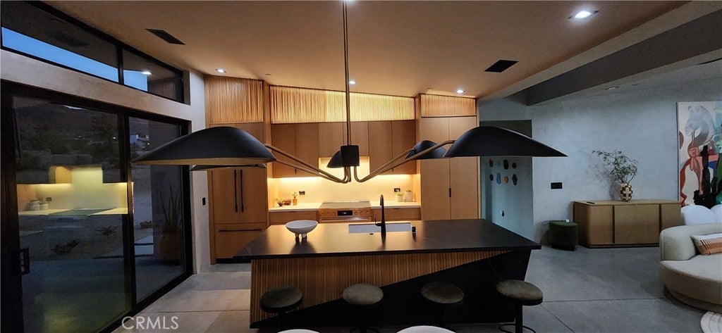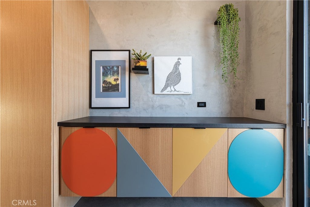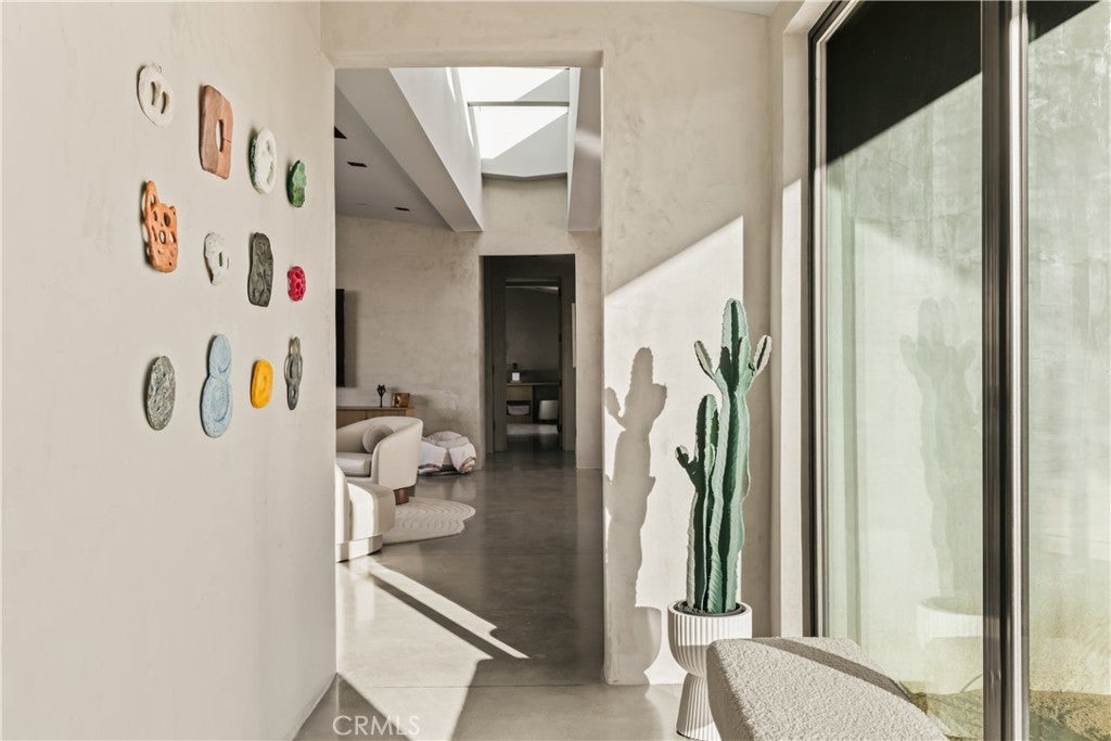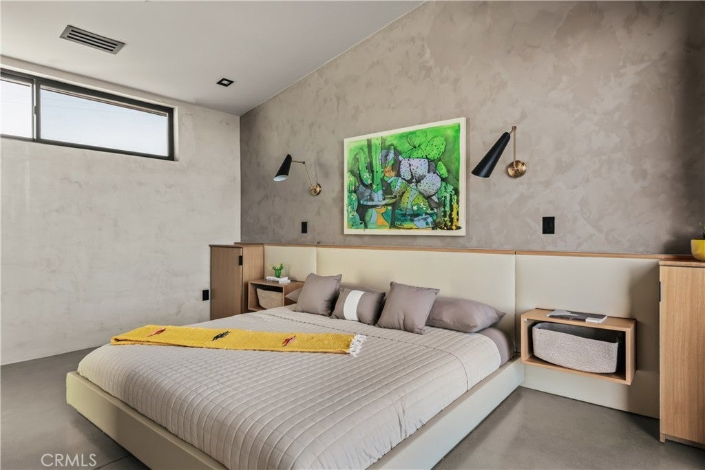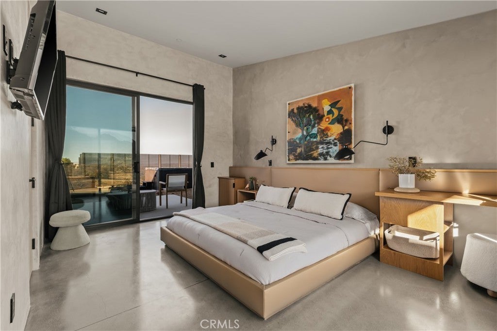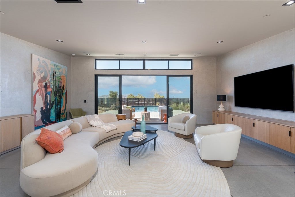An extraordinary modernist eco-friendly home where sustainability meets inspired design. Located in the heart of Joshua Tree, this ultra luxurious desert retreat blends modern design with stunning desert lighting, seamless indoor-outdoor living ambiance and breathtaking panoramic desert views. This home includes design aesthetics such as 12-foot vaulted ceilings; cantilevered eves; open design element to maximize the outdoor experience; an open skylight in the living room and midcentury gullwing roof concept; an extensively functional floor plan; east and west wing ensuite bedrooms for privacy. The resort style backyard features a beautiful inground pool and privately fenced backyard while transitioning into the great room and chef’s kitchen for easy entertainment. The custom kitchen features a professionally designed 3-D island, handmade cabinetry, countertops imported from Spain, premium Fisher & Paykel and Bosch appliances. The bathrooms are finished with elegant Italian terrazzo flooring and imported tile. Designed for enjoyment as a private sanctuary, holistic retreat or a cash flow investment. The home is licensed as a daily rental and qualifies as an Airbnb “Luxe” property. Constructed with sustainable, high efficiency Structural Concrete Insulated Panels (SCIP), the home offers superior energy performance with zero air exchange, reduced maintenance, and enhanced durability, with resistance to mold, fire and seismic activity. Qualifying for Passive House Designation. Situated on a prime “Upper Friendly Hills” lot with 360-degree mountain views, city water services and convenient access to the National Park and local amenities. Additional features include owned solar, fire sprinkler system, two-car carport with EV charger, dual-zone HVAC with energy efficient heat pumps, Nest thermostats, laundry closet with washer and dryer, pool heater, and a 7-person, 69 jet Cal Spa. Offered fully operational with short term rental permit and professional management in place. Currently under consideration for an AIA Design Award recognized for its innovation integration form, function and environmental resilience.