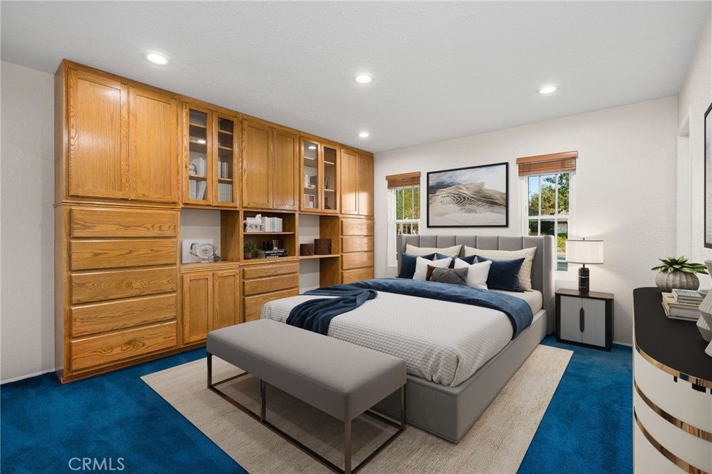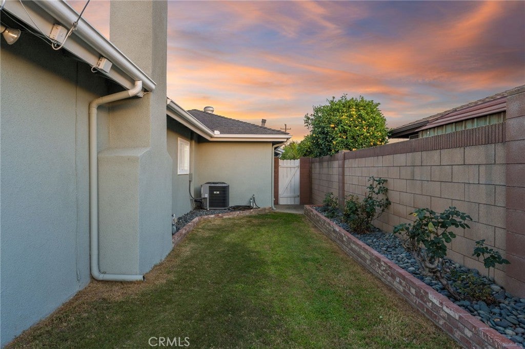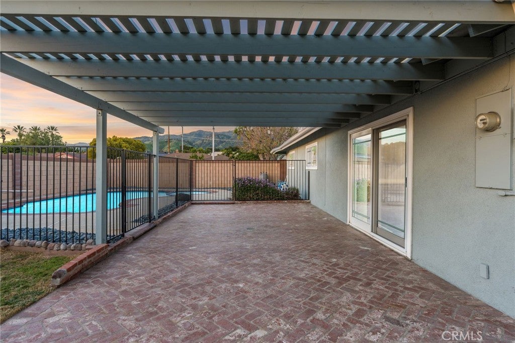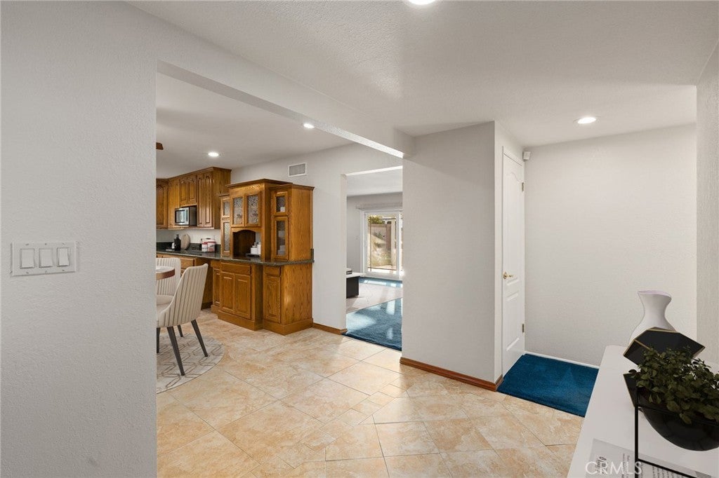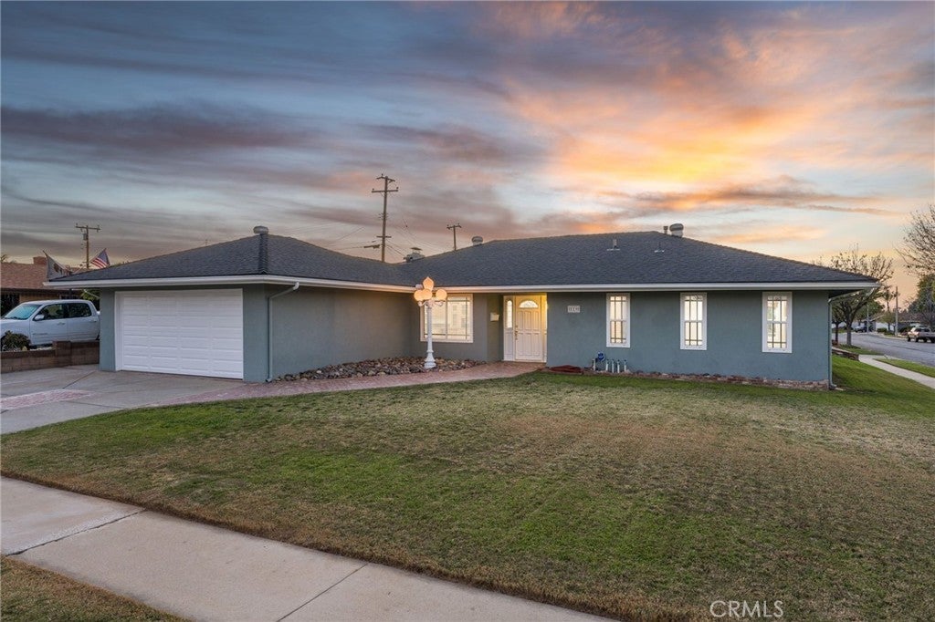 Single-story pool home situated on a desirable corner lot. The front yard features a manicured lawn, decorative river-rock garden with a Victorian lantern, and a herringbone brick planter leading to the covered front entry with a wood and glass front door . Inside, the home offers tiled flooring and a bright, open feel with LED recessed lighting throughout. The spacious kitchen features rich wood cabinetry, granite countertops, stainless steel appliances, and a peninsula with a gas cooktop and four-sided stainless steel vent hood. An adjacent dining area opens directly to the kitchen and includes custom built-ins and a window overlooking the front yard. The family room offers carpeted flooring, a fireplace with tiled surround and wood mantel, a built-in workstation, and a sliding glass door with views of the backyard and swimming pool. Down the hallway, ample built-in storage cabinetry provides added convenience and leads to the bedroom wing. The primary bedroom features carpeted flooring, custom built-ins, and an en-suite bathroom with tiled flooring, an expansive wood vanity, and a custom tiled shower with sliding glass enclosure. Two additional bedrooms are generously sized, one currently configured as a home office, along with an updated hall bathroom. The spacious garage includes a laundry center, bright lighting, and a pull-down ladder providing access to attic storage. The backyard is ideal for entertaining, offering a newly refinished pool and spa with brick coping, concrete decking, a large grass area, rock gardens, a covered patio with herringbone brick decking, and spacious side yards with lawn areas. Additional features include dual-pane windows throughout, brand-new interior and exterior paint, a two year old HVAC system, LED lighting, and a new water heater.