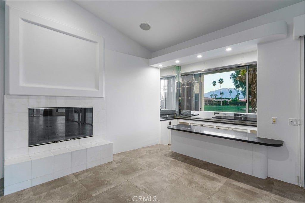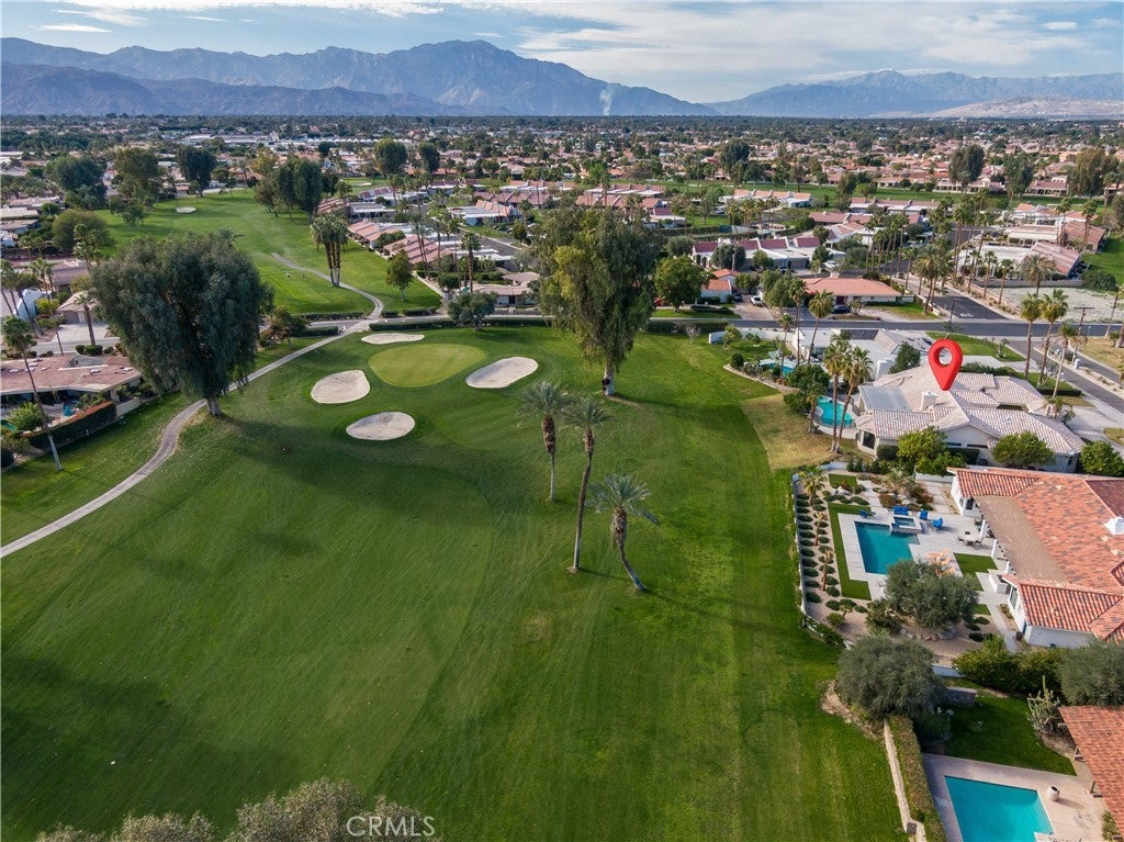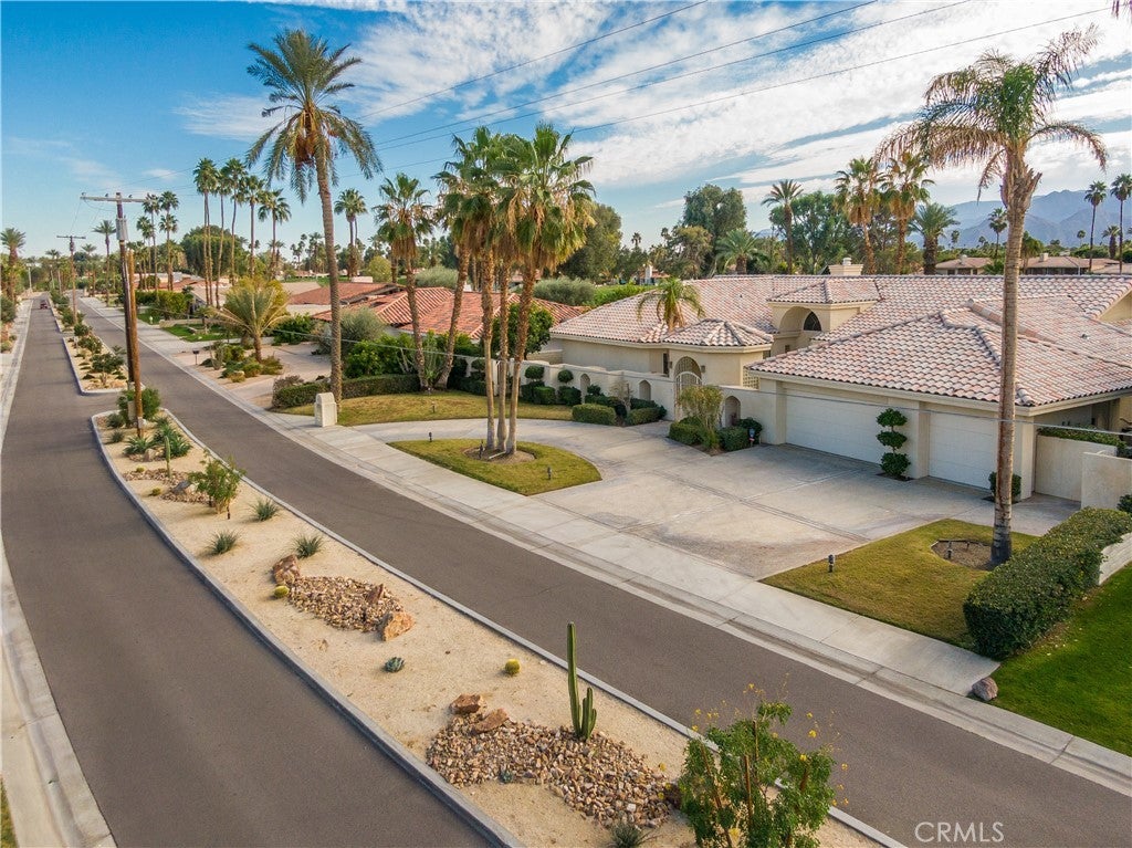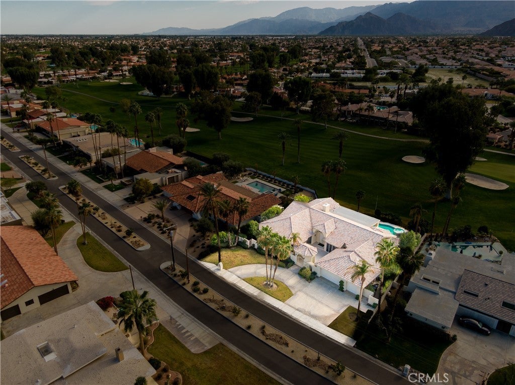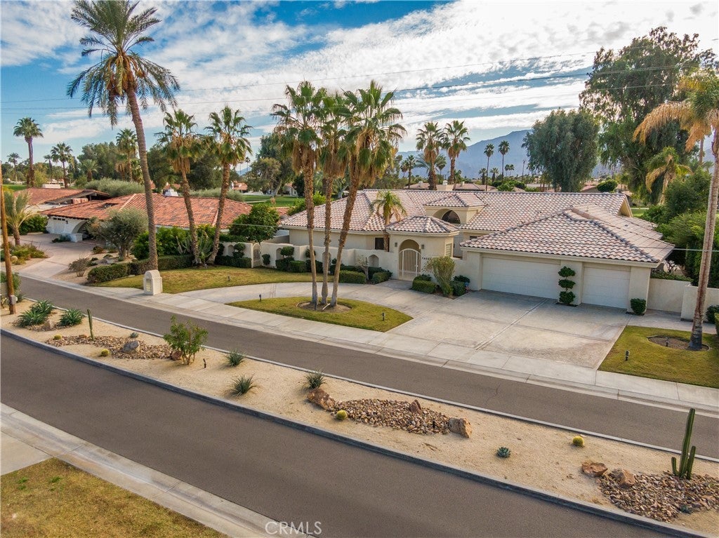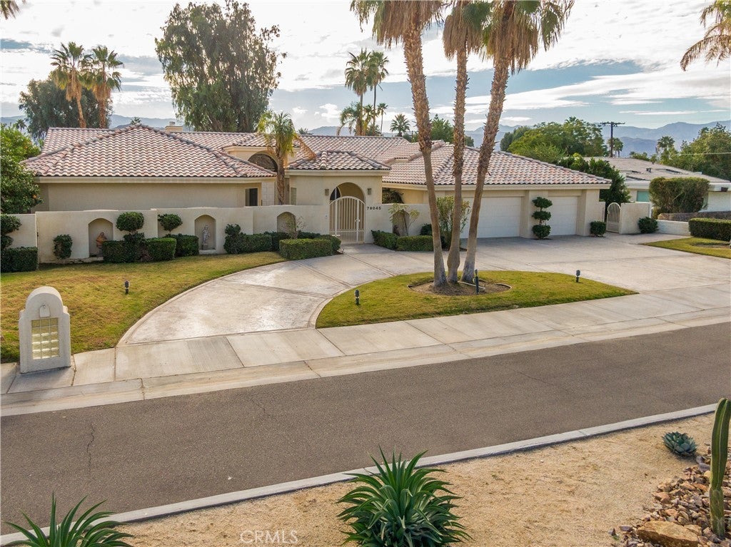 Welcome to 79045 Montego Bay Drive, a custom open-concept residence located within the guard-gated community of Bermuda Dunes Country Club. This south-facing home captures expansive views of the 14th fairway, green, private pool, and surrounding mountain backdrop, offering a seamless blend of luxury, comfort, and desert lifestyle living. A private gated courtyard and double-door entry lead into a light-filled great room designed for both everyday living and entertaining. The open floor plan is enhanced by a spacious sit-down wet bar that connects the living and dining areas while framing the golf course views. The remodeled kitchen is thoughtfully appointed with an eight-burner Viking gas range, dual electric ovens, Sub-Zero refrigerator, black quartz countertops, and an oversized island ideal for casual dining and gatherings. The expansive primary suite offers direct backyard access, a generous sitting area, two walk-in closets, and a well-appointed ensuite bath featuring a jetted soaking tub, large walk-in shower, dual vanities, and two private water closets. A secondary bedroom suite includes a full bath and walk-in closet, while a third bedroom is privately situated on the opposite side of the home with convenient access to an adjacent full bath. An upgraded powder room is located near the main living spaces. Additional highlights include 24" x 24" porcelain tile flooring throughout, newly installed ceiling fans, and a spacious laundry room with extended cabinetry and folding counter space. The three-car garage features its own dedicated air-conditioning unit and polished epoxy flooring. A circular driveway provides added parking and curb appeal. Low HOA dues include cable television, high-speed internet, and 24-hour security. This property presents a rare opportunity to enjoy panoramic golf course views and refined indoor-outdoor living in one of the desert’s most desirable country club communities.