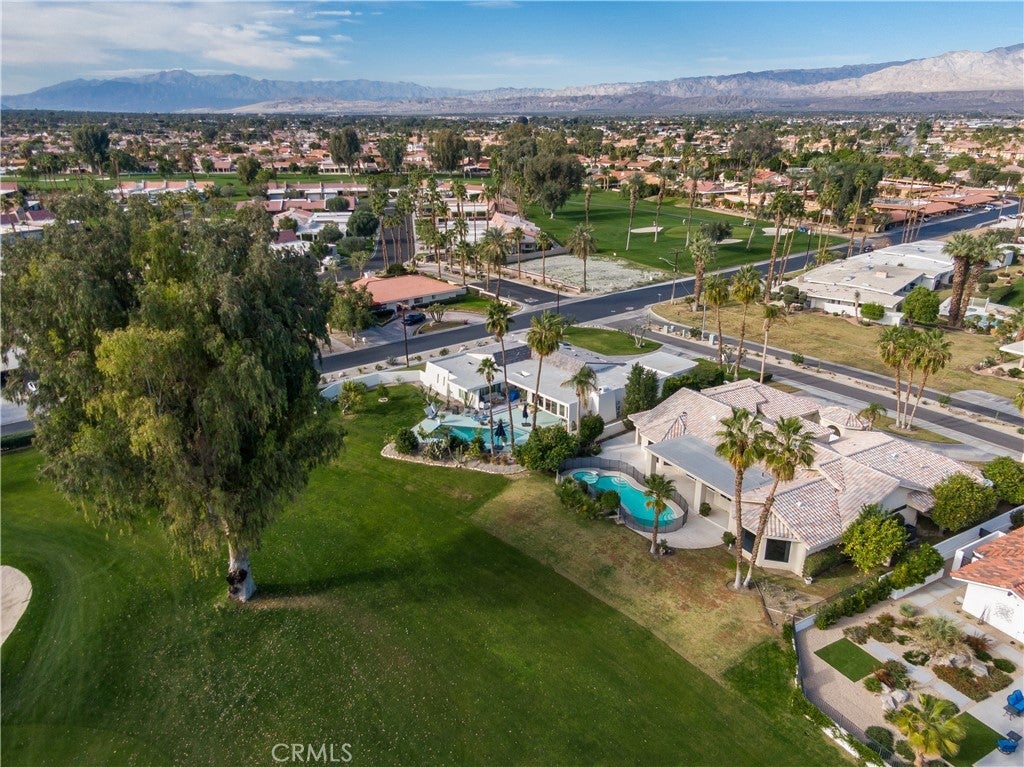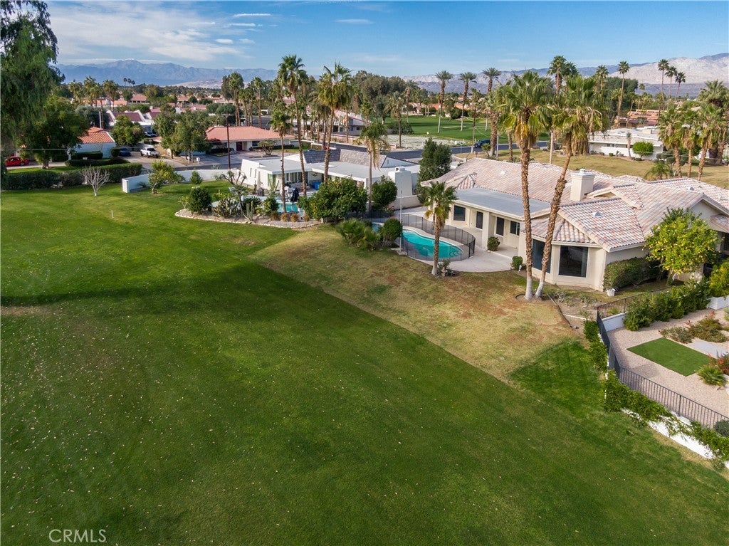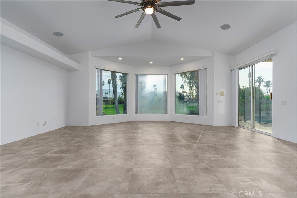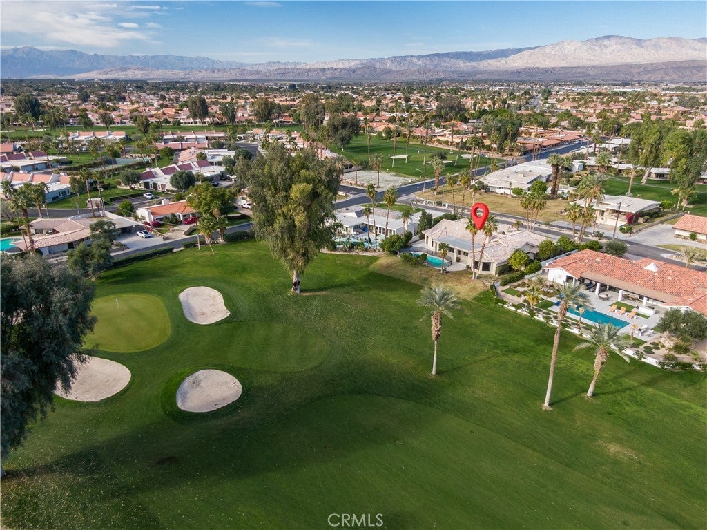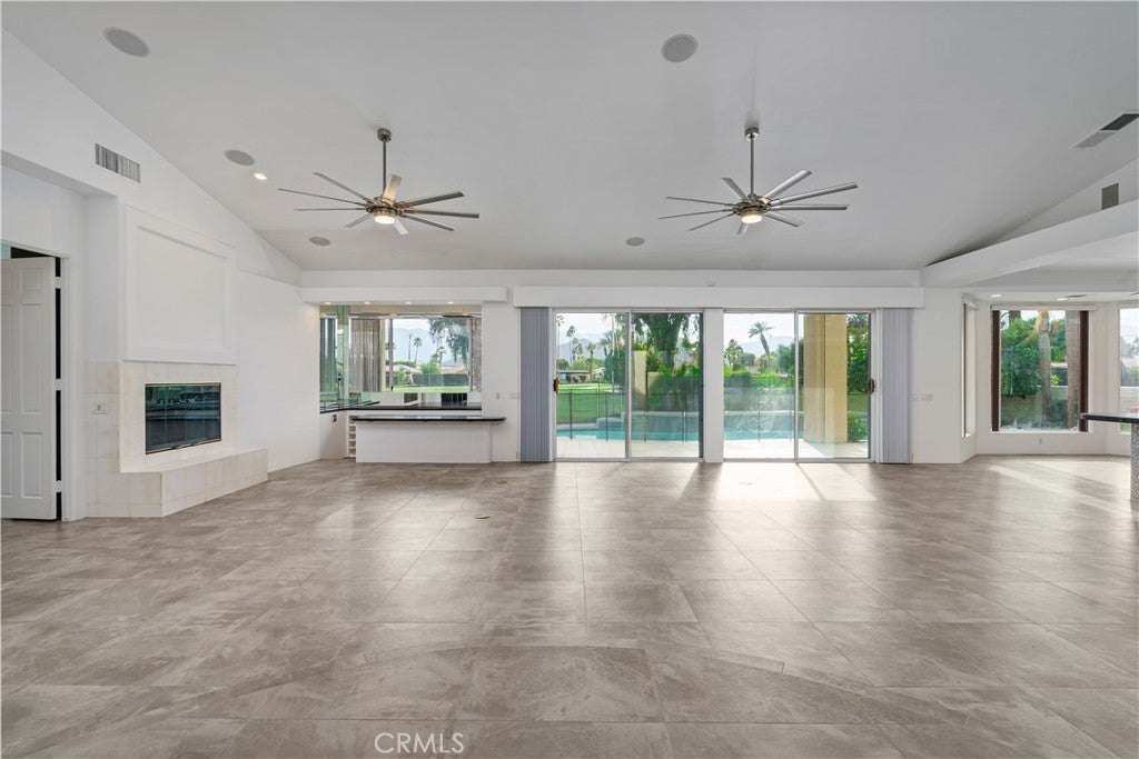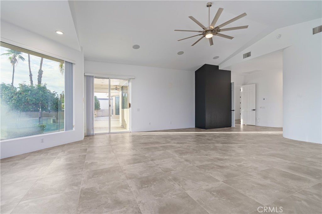 Welcome to 79045 Montego Bay Drive, a custom open-concept residence located within the guard-gated community of Bermuda Dunes Country Club. This south-facing home captures expansive views of the 14th fairway, green, private pool, and surrounding mountain backdrop, offering a seamless blend of luxury, comfort, and desert lifestyle living. A private gated courtyard and double-door entry lead into a light-filled great room designed for both everyday living and entertaining. The open floor plan is enhanced by a spacious sit-down wet bar that connects the living and dining areas while framing the golf course views. The remodeled kitchen is thoughtfully appointed with an eight-burner Viking gas range, dual electric ovens, Sub-Zero refrigerator, black quartz countertops, and an oversized island ideal for casual dining and gatherings. The expansive primary suite offers direct backyard access, a generous sitting area, two walk-in closets, and a well-appointed ensuite bath featuring a jetted soaking tub, large walk-in shower, dual vanities, and two private water closets. A secondary bedroom suite includes a full bath and walk-in closet, while a third bedroom is privately situated on the opposite side of the home with convenient access to an adjacent full bath. An upgraded powder room is located near the main living spaces. Additional highlights include 24" x 24" porcelain tile flooring throughout, newly installed ceiling fans, and a spacious laundry room with extended cabinetry and folding counter space. The three-car garage features its own dedicated air-conditioning unit and polished epoxy flooring. A circular driveway provides added parking and curb appeal. Low HOA dues include cable television, high-speed internet, and 24-hour security. This property presents a rare opportunity to enjoy panoramic golf course views and refined indoor-outdoor living in one of the desert’s most desirable country club communities.