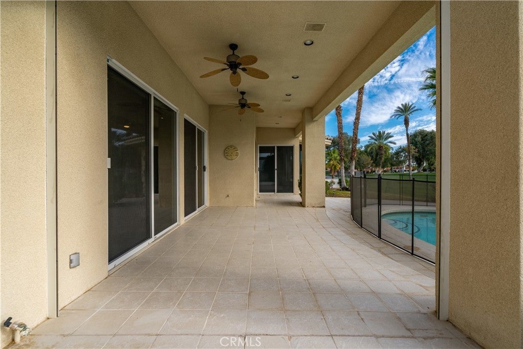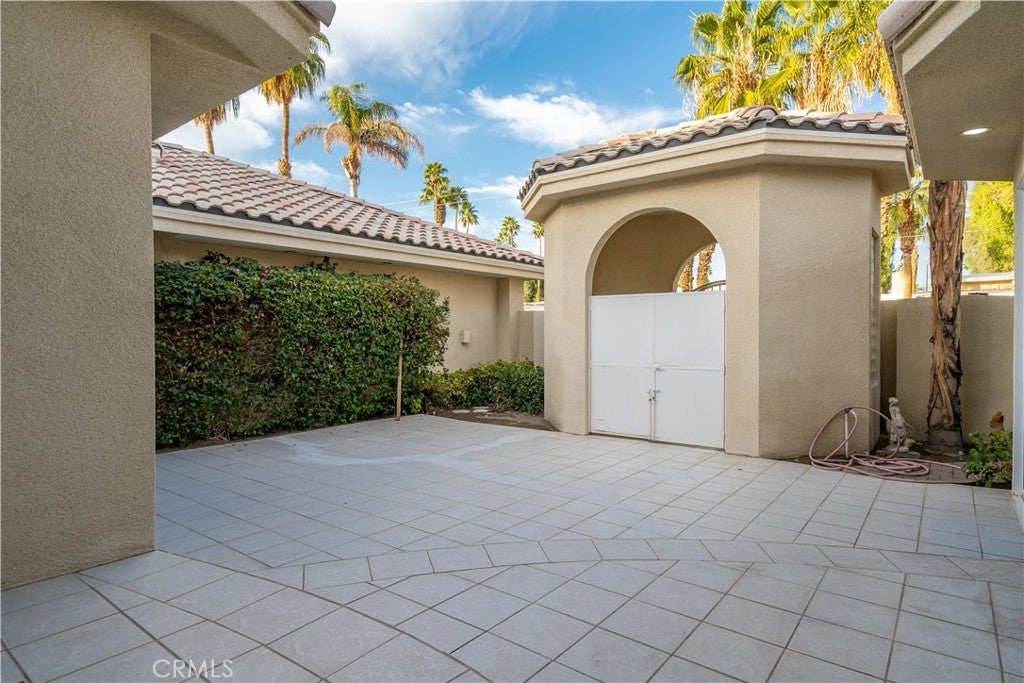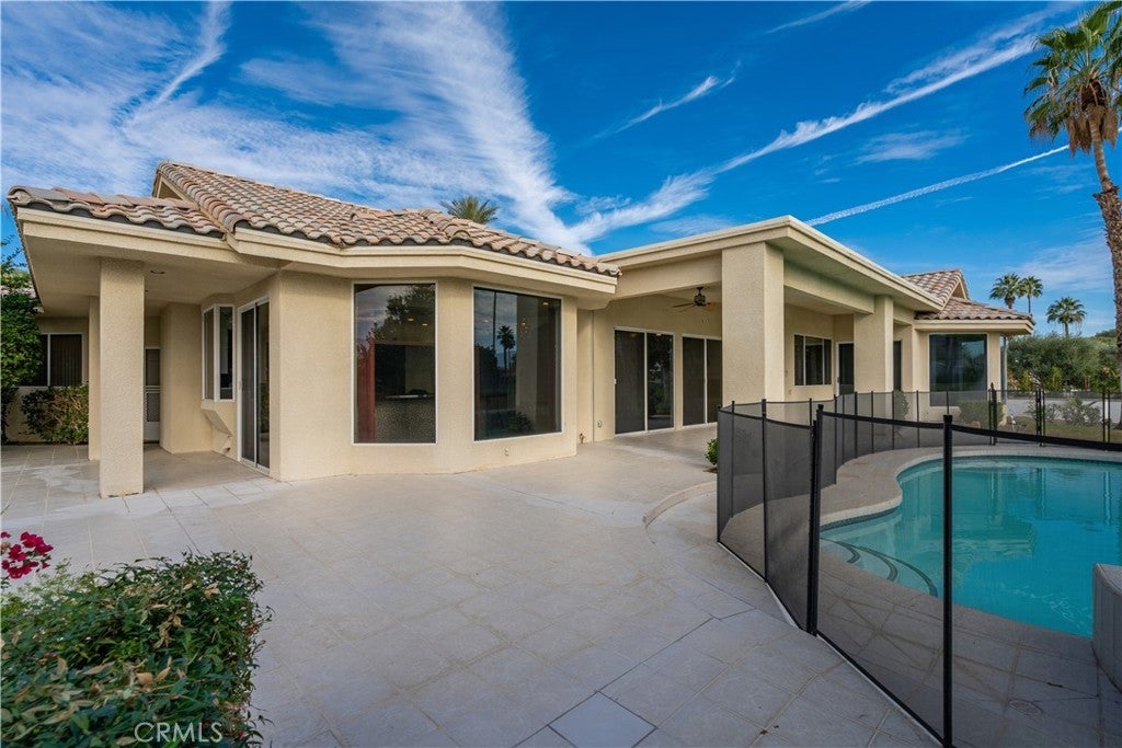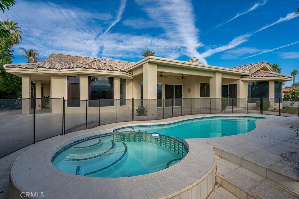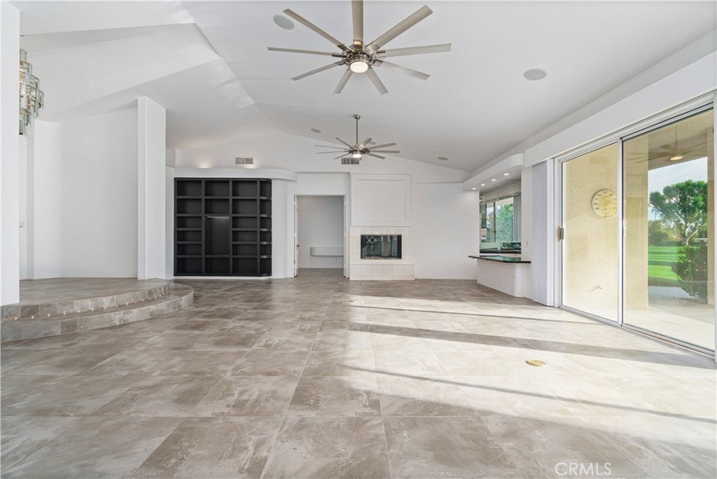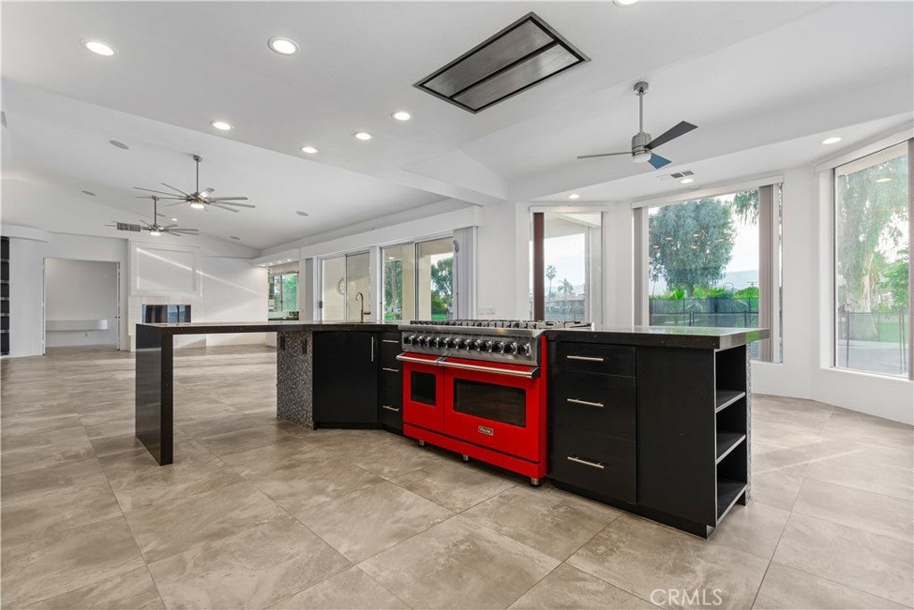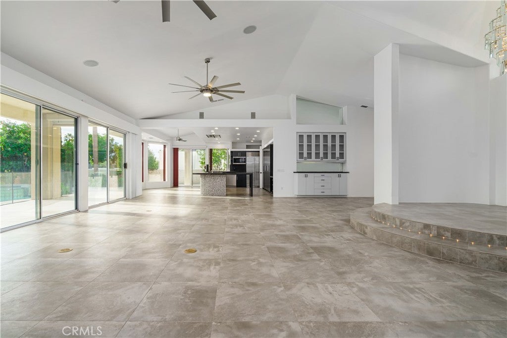 Welcome to 79045 Montego Bay Drive, a custom open-concept residence located within the guard-gated community of Bermuda Dunes Country Club. This south-facing home captures expansive views of the 14th fairway, green, private pool, and surrounding mountain backdrop, offering a seamless blend of luxury, comfort, and desert lifestyle living. A private gated courtyard and double-door entry lead into a light-filled great room designed for both everyday living and entertaining. The open floor plan is enhanced by a spacious sit-down wet bar that connects the living and dining areas while framing the golf course views. The remodeled kitchen is thoughtfully appointed with an eight-burner Viking gas range, dual electric ovens, Sub-Zero refrigerator, black quartz countertops, and an oversized island ideal for casual dining and gatherings. The expansive primary suite offers direct backyard access, a generous sitting area, two walk-in closets, and a well-appointed ensuite bath featuring a jetted soaking tub, large walk-in shower, dual vanities, and two private water closets. A secondary bedroom suite includes a full bath and walk-in closet, while a third bedroom is privately situated on the opposite side of the home with convenient access to an adjacent full bath. An upgraded powder room is located near the main living spaces. Additional highlights include 24" x 24" porcelain tile flooring throughout, newly installed ceiling fans, and a spacious laundry room with extended cabinetry and folding counter space. The three-car garage features its own dedicated air-conditioning unit and polished epoxy flooring. A circular driveway provides added parking and curb appeal. Low HOA dues include cable television, high-speed internet, and 24-hour security. This property presents a rare opportunity to enjoy panoramic golf course views and refined indoor-outdoor living in one of the desert’s most desirable country club communities.
