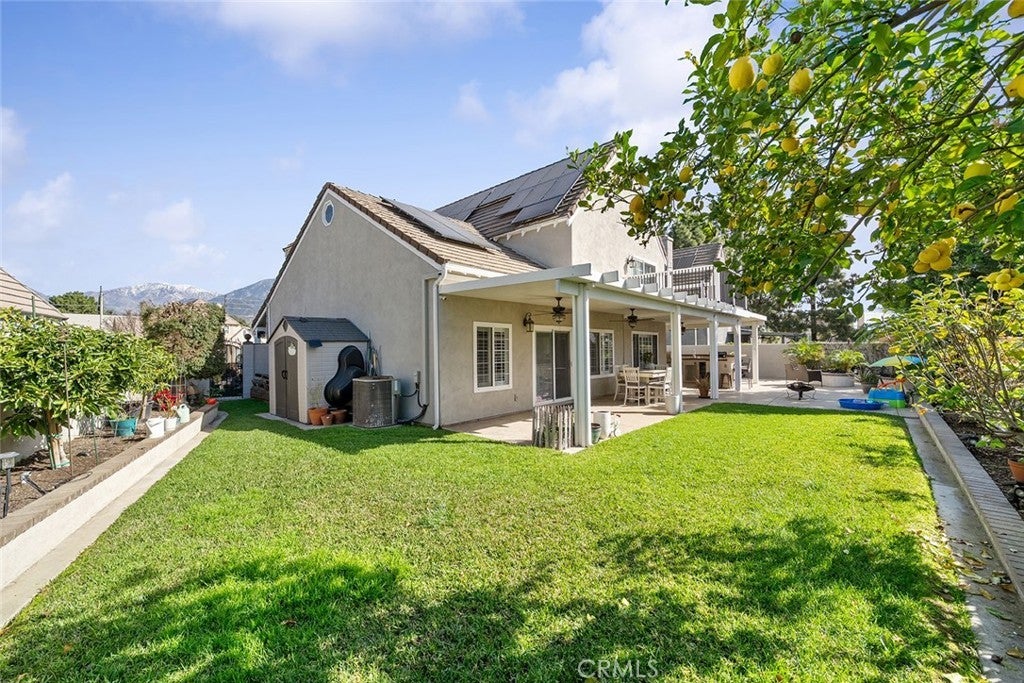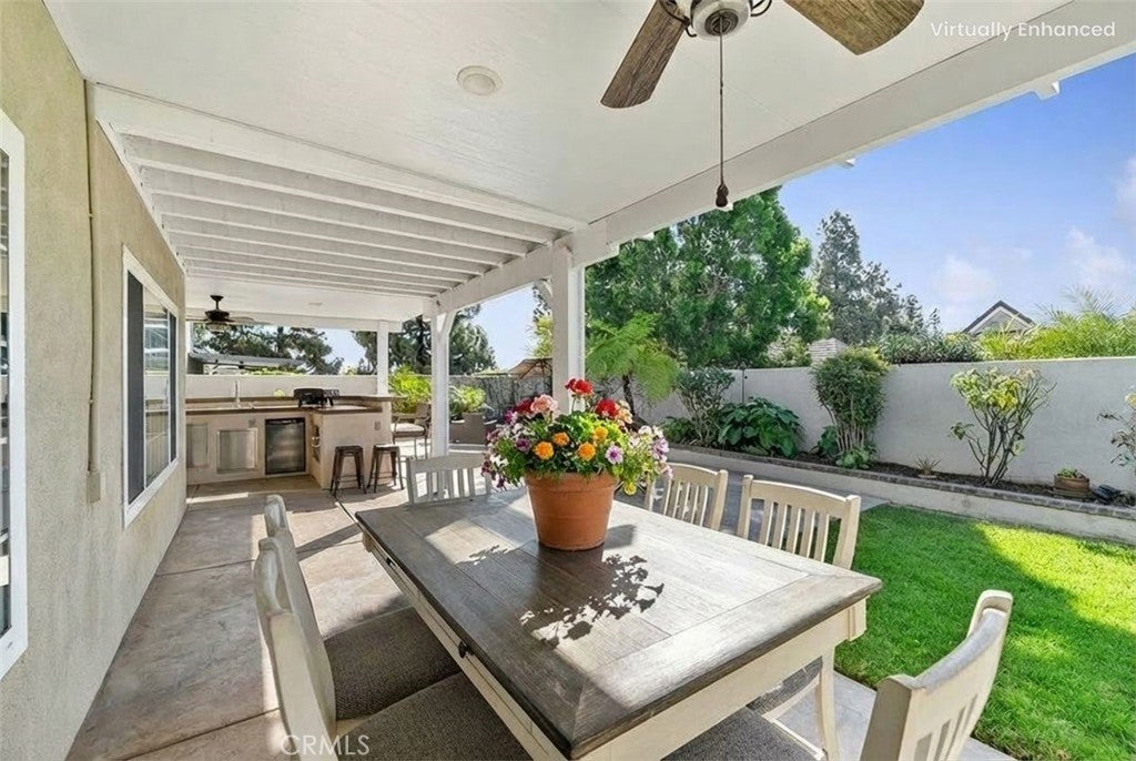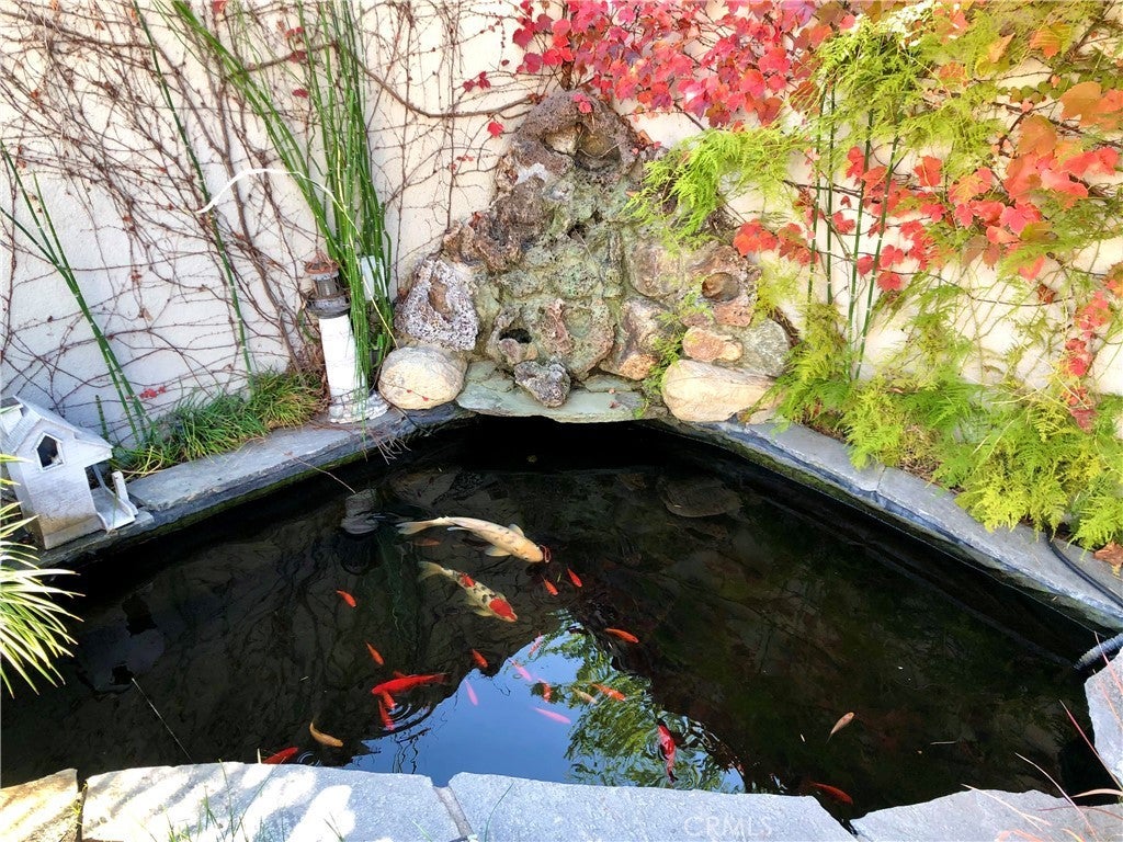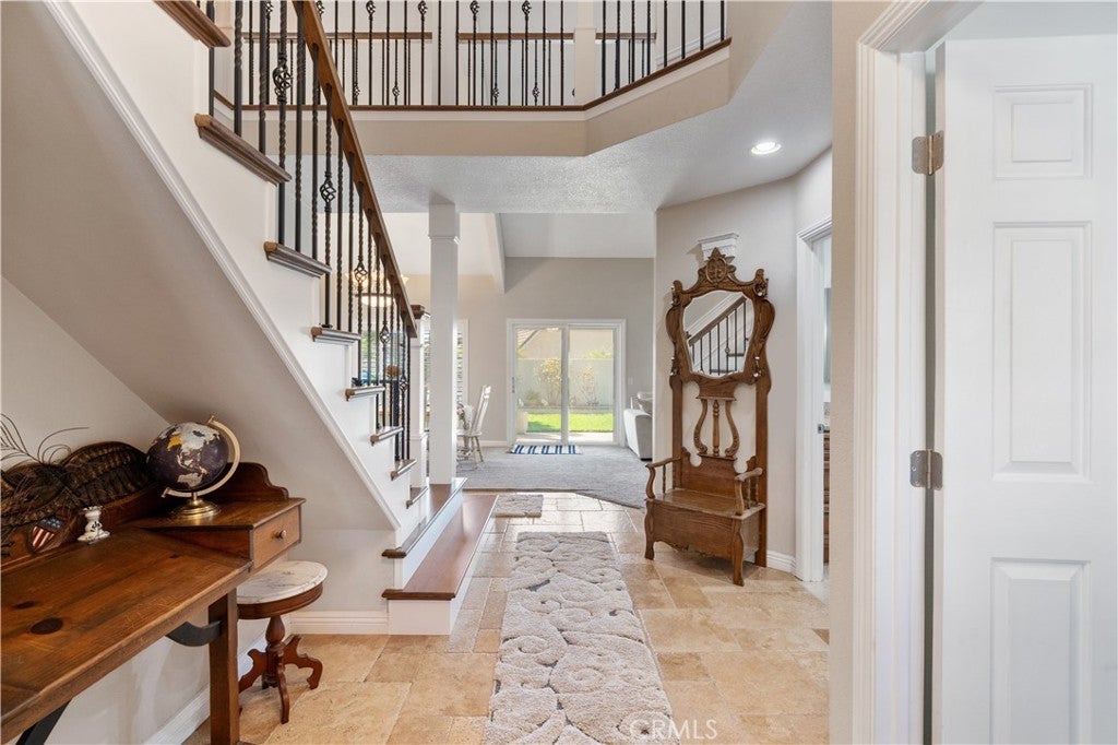Charming Storybook Home in the Upland Foothills set in a Quiet Cul-de-Sac Location. Beautifully maintained and thoughtfully upgraded, this stunning home sits on an expansive 9,000+ sq ft lot in a desirable Upland foothill neighborhood. Exceptional curb appeal and lush landscaping welcome you into a bright, open floor plan with cathedral ceilings, freshly painted interiors, and abundant natural light. The main level features a downstairs bedroom and full bathroom, a spacious living room with exposed ceiling beam, formal dining room, and dry bar. The remodeled kitchen offers granite countertops, under-cabinet lighting, self-closing cabinets, a large pantry with pull-out drawers, and an extended island ideal for dining and entertaining. Built-in cabinetry with wine refrigerator complements the adjacent family room with brick fireplace and plantation shutters. A new custom wood staircase with decorative paneling leads upstairs to four spacious bedrooms, including one with a large attached closet/playroom. The fully remodeled upstairs bathrooms feature elegant tile flooring and granite countertops, including a Jack-and-Jill bathroom. Several bedrooms include oversized closets with custom built-in shoe racks. The primary bedroom opens to a private walk-on patio with scenic views. Flooring includes travertine and plush carpet downstairs, wood flooring upstairs, and laminate flooring in select bedrooms. The outdoor space is a true retreat with meticulously landscaped front and back yards. Features include a newly redone primary bedroom balcony with Trex decking and solar lighting, RV parking, stamped concrete, and a custom outdoor kitchen with 5-burner BBQ, sink, refrigerator, and storage. Additional highlights include insulated patio covers with remote-controlled fans, a fire pit, tranquil pond with two waterfalls, mature fruit trees (lemon, apple, avocado, orange), and a separate dog kennel area. An exceptional blend of comfort, style, and outdoor living—this home is a must-see.