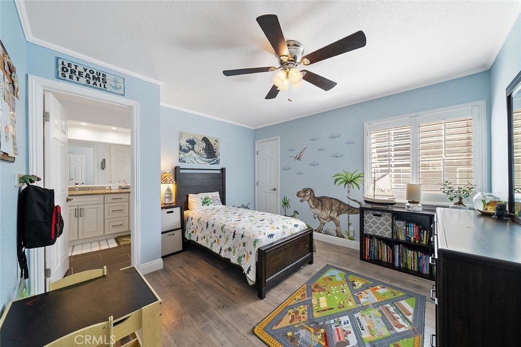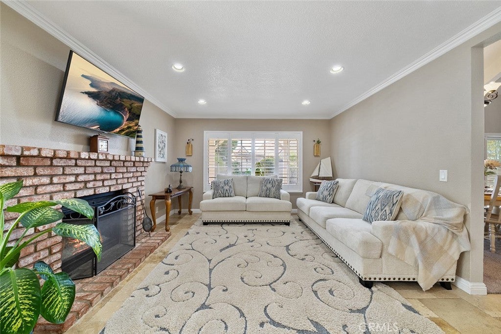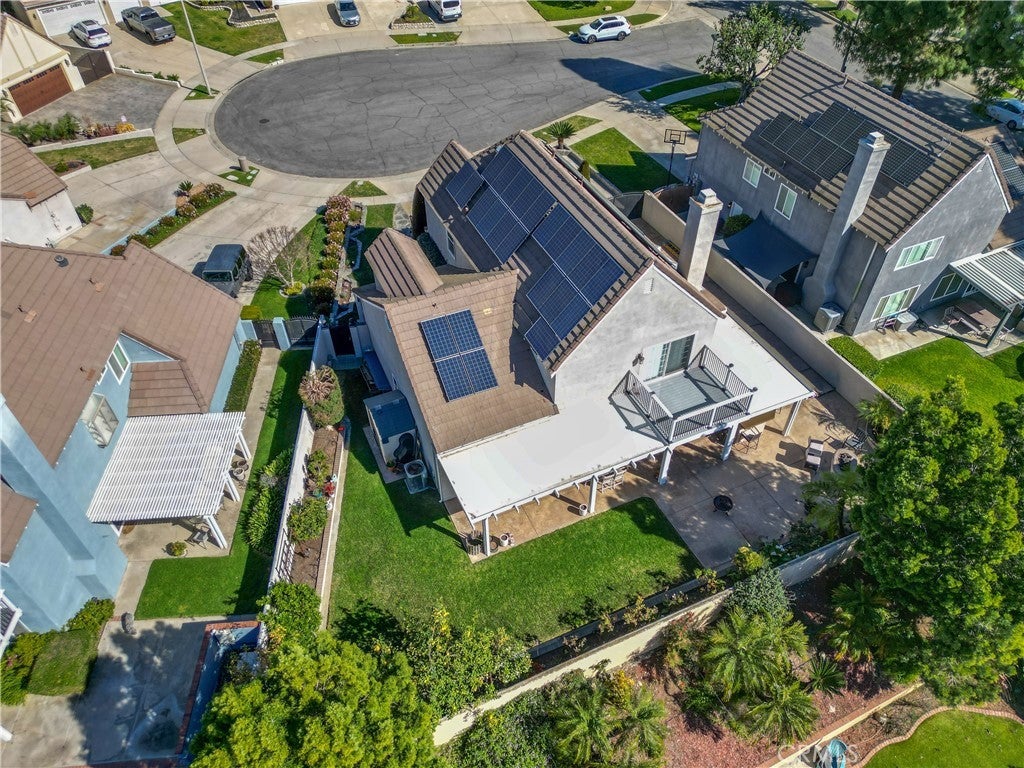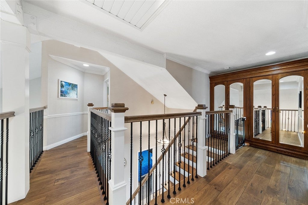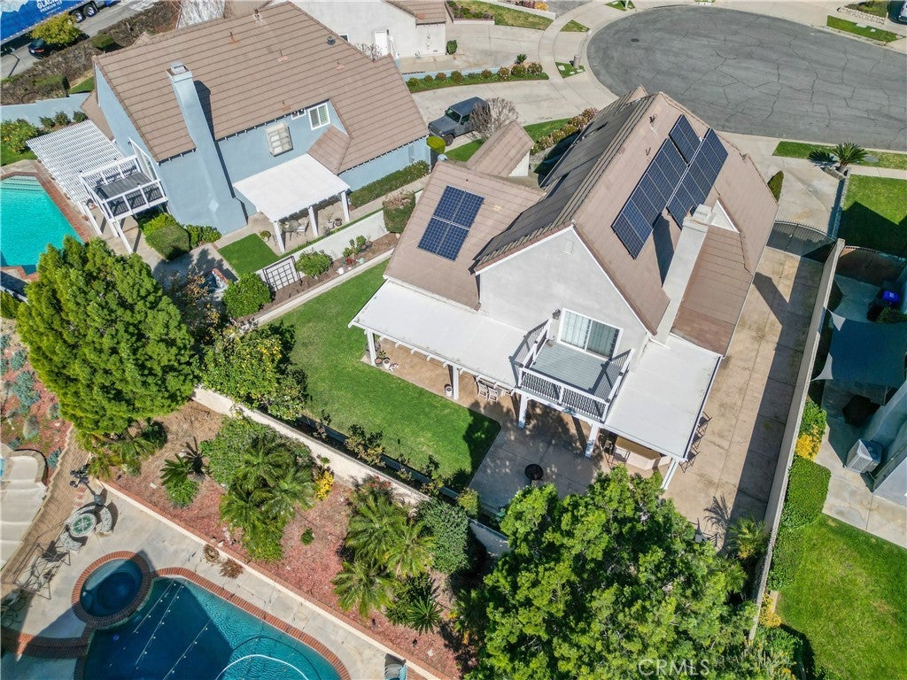 Charming Storybook Home in the Upland Foothills set in a Quiet Cul-de-Sac Location. Beautifully maintained and thoughtfully upgraded, this stunning home sits on an expansive 9,000+ sq ft lot in a desirable Upland foothill neighborhood. Exceptional curb appeal and lush landscaping welcome you into a bright, open floor plan with cathedral ceilings, freshly painted interiors, and abundant natural light. The main level features a downstairs bedroom and full bathroom, a spacious living room with exposed ceiling beam, formal dining room, and dry bar. The remodeled kitchen offers granite countertops, under-cabinet lighting, self-closing cabinets, a large pantry with pull-out drawers, and an extended island ideal for dining and entertaining. Built-in cabinetry with wine refrigerator complements the adjacent family room with brick fireplace and plantation shutters. A new custom wood staircase with decorative paneling leads upstairs to four spacious bedrooms, including one with a large attached closet/playroom. The fully remodeled upstairs bathrooms feature elegant tile flooring and granite countertops, including a Jack-and-Jill bathroom. Several bedrooms include oversized closets with custom built-in shoe racks. The primary bedroom opens to a private walk-on patio with scenic views. Flooring includes travertine and plush carpet downstairs, wood flooring upstairs, and laminate flooring in select bedrooms. The outdoor space is a true retreat with meticulously landscaped front and back yards. Features include a newly redone primary bedroom balcony with Trex decking and solar lighting, RV parking, stamped concrete, and a custom outdoor kitchen with 5-burner BBQ, sink, refrigerator, and storage. Additional highlights include insulated patio covers with remote-controlled fans, a fire pit, tranquil pond with two waterfalls, mature fruit trees (lemon, apple, avocado, orange), and a separate dog kennel area. An exceptional blend of comfort, style, and outdoor living—this home is a must-see.