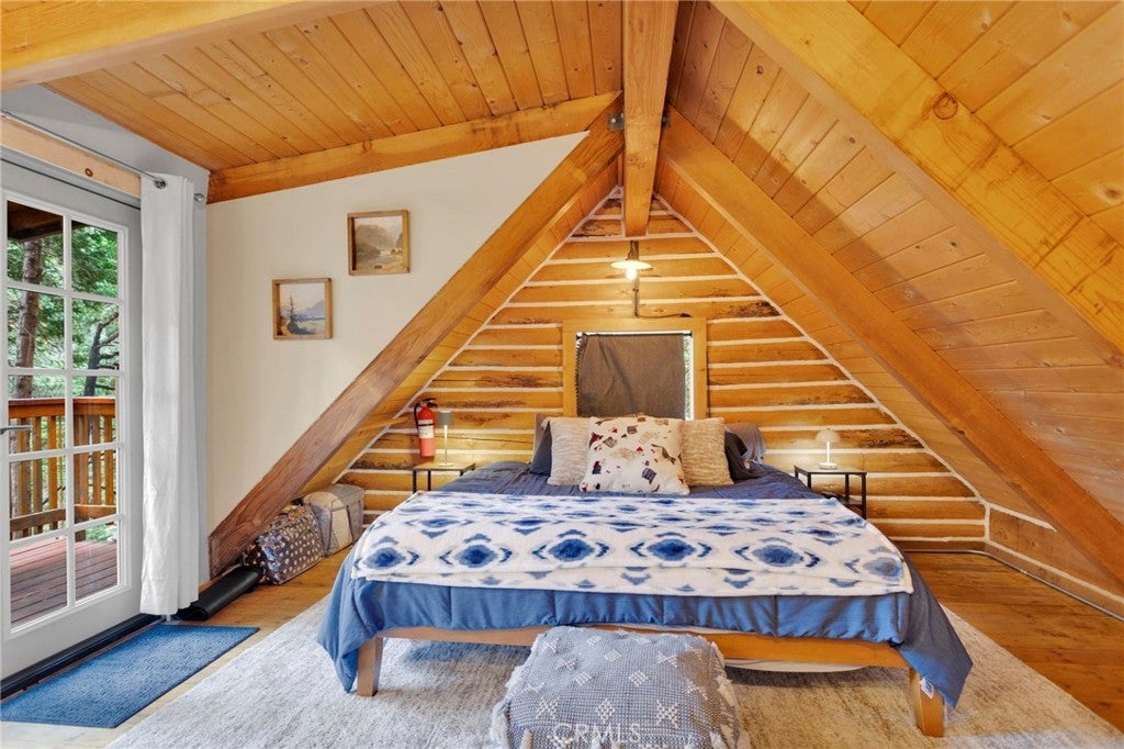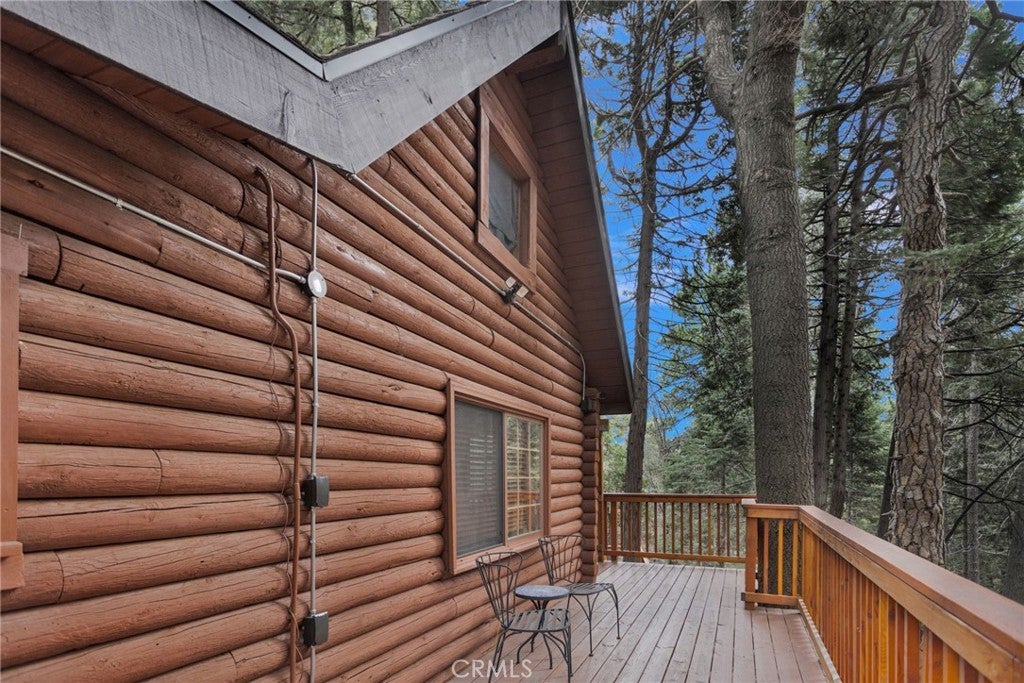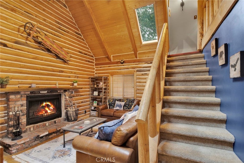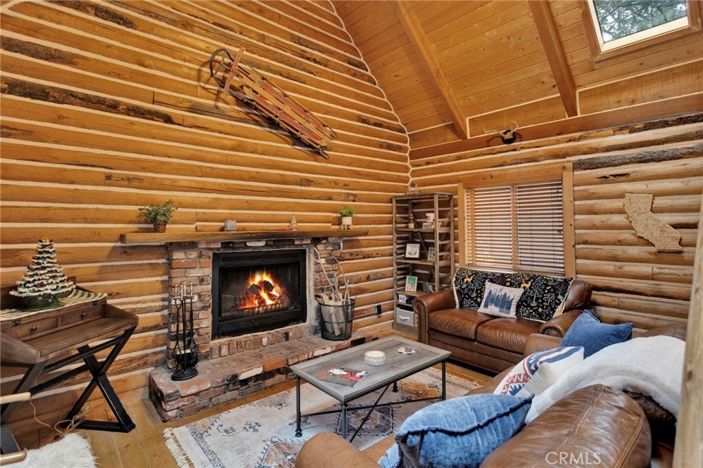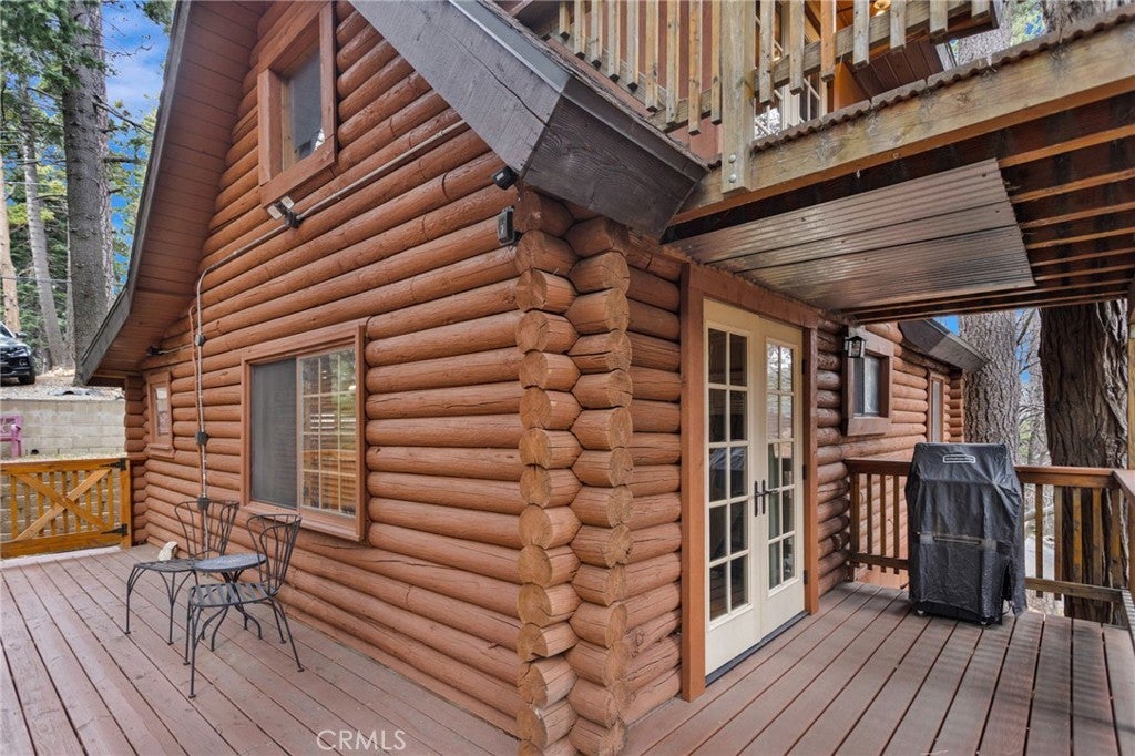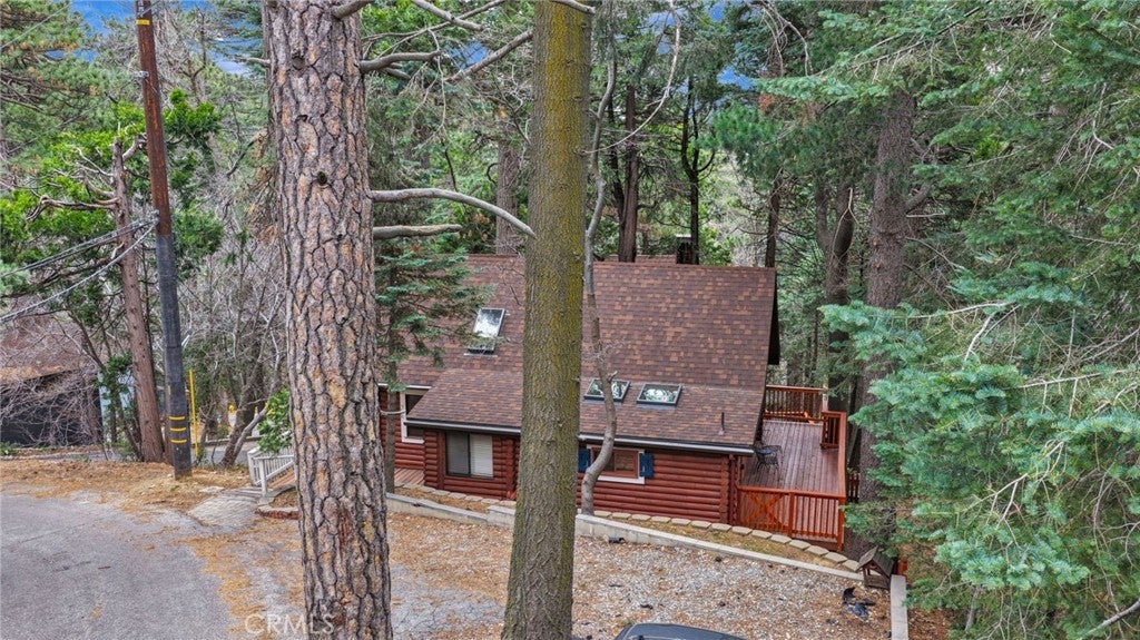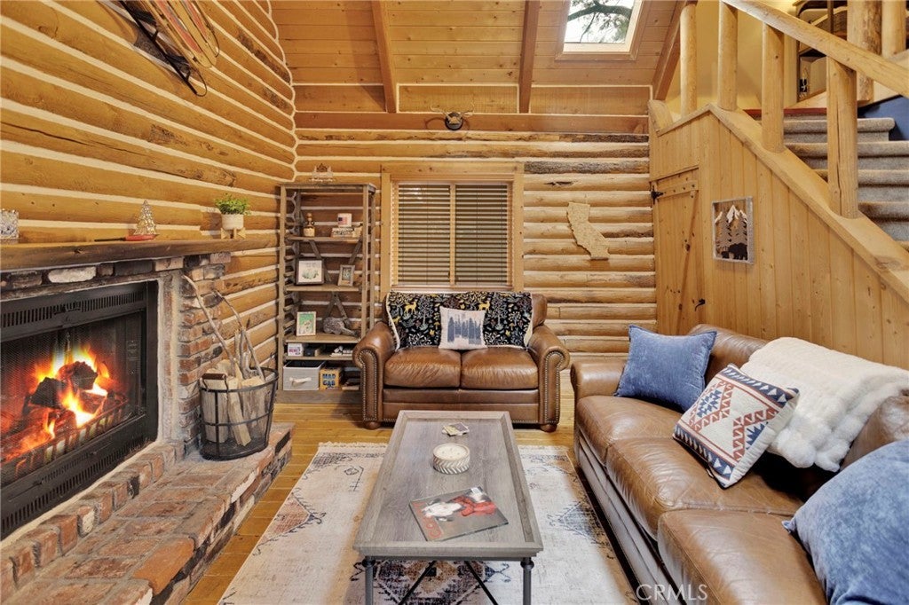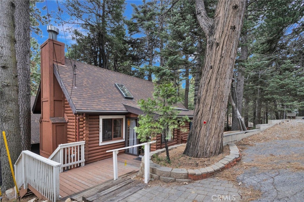 If you have been dreaming of a charming mountain escape filled with warmth and possibility, 788 Buckingham Square delivers a truly special opportunity. This charming log cabin tucked among the pines of Arrowhead Villas, offering more flexibility than a typical one-bedroom home. Just inside the entry is a practical mud room for removing shoes and outerwear before entering the main living space. The living room features vaulted ceilings, exposed wood beams, skylights, and a beautiful stone fireplace, creating a bright and comfortable gathering area. The kitchen sits next to a versatile bonus space that can function as a dining area, office, or additional sleeping area, and includes a newer refrigerator, new composite French doors, and washer and dryer in the closet. Upstairs, the loft-style primary suite offers privacy, its own balcony also with new composite French doors, and a treehouse feel. The home has been meticulously maintained with numerous upgrades including a roof installed in 2019, Nest thermostat, newer water shutoff, newer heater and HVAC ducting, fully insulated and foil-sealed buildup, Leaf Filter rain gutters with downspouts, and a 30-amp power connection with generator hookup. A wraparound deck provides outdoor space to relax. Also, there is a quarterly fee of $280 that covers water, trash, and snow removal. It is located just minutes from Lake Arrowhead Village, SkyPark, trails, dining, and Highway 18, this property offers both convenience and mountain charm. Come check out this amazing mountain cabin today!
