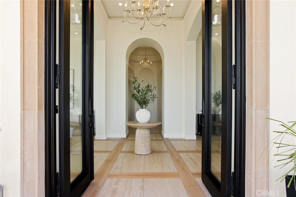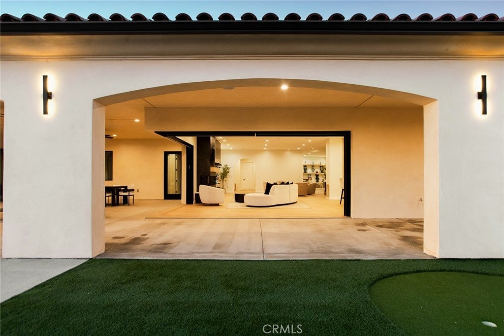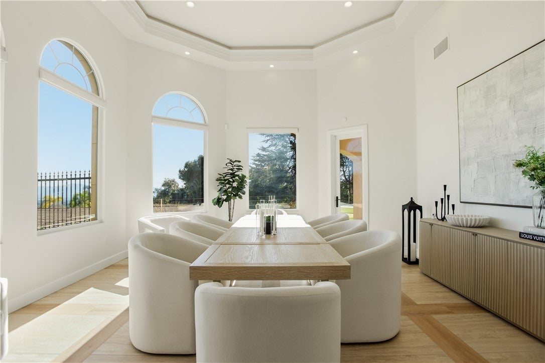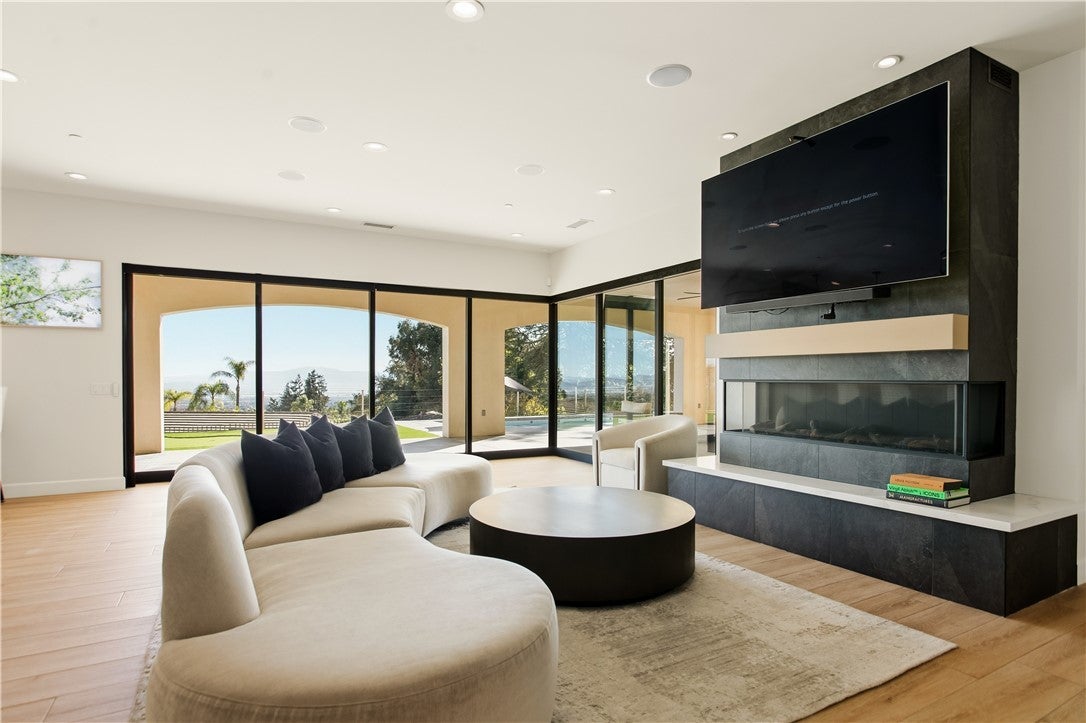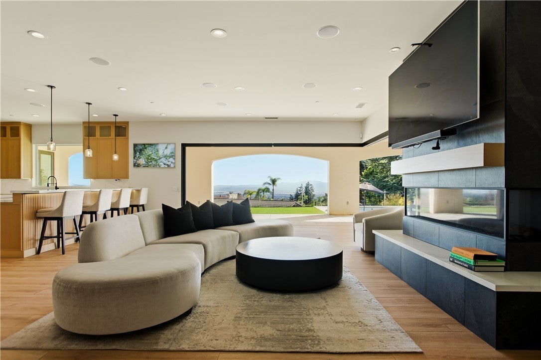 Custom-built single-story residence situated within a private gated setting in San Antonio Heights, positioned to capture sweeping valley and mountain views. This 5,200 sq ft, home features 4 ensuite bedrooms and 6 bathrooms, designed with a strong emphasis on scale, flow, and privacy. The residence showcases refined Mediterranean-inspired architecture paired with a sophisticated, modern interior. A striking entry with oversized double doors opens to expansive ceiling heights, arched windows, and a light-filled open floor plan. Elevated positioning enhances the sense of privacy while providing unobstructed views rarely found in single-level estates. Formal living and dining rooms provide elegant yet functional spaces for entertaining, while the central living area is designed for seamless indoor-outdoor living. The kitchen features Thermador professional appliances, extensive counter space, custom cabinetry, and a large breakfast bar, opening to a grand great room with fireplace. Retractable glass doors lead to approximately 1,730 sq ft of covered outdoor living, including a spacious loggia overlooking the pool, putting green, and expansive valley backdrop. The primary suite offers a serene retreat with panoramic views, fireplace, generous walk-in closet, and a spa-like bath featuring dual vanities, a freestanding soaking tub, and a separate walk-in shower. One bedroom has been configured as a private studio with kitchenette and bathroom, offering flexibility for guests, multigenerational living, or extended stays. The property also includes whole-house LED lighting, an integrated audio system, security cameras, solar panels, electric vehicle charging, and a gated drive with RV parking. The grounds provide ample space for recreation, entertaining, or pets, all within a secure and private setting. A rare opportunity to own a gated, single-level estate in San Antonio Heights with commanding views, architectural refinement, and modern amenities.