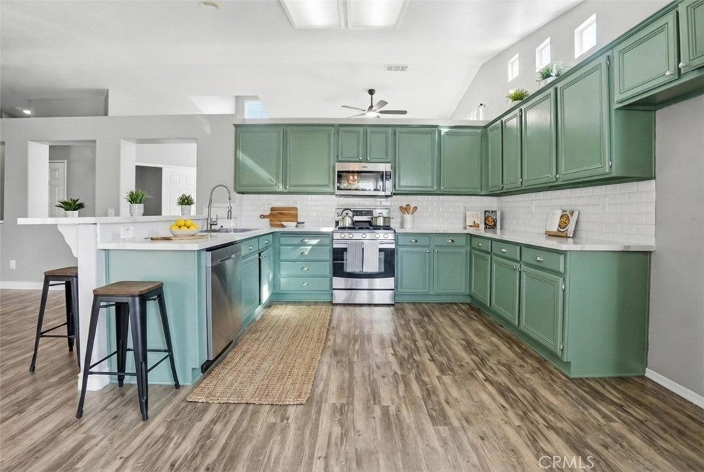 Breakfast Bar, Breakfast Area, Ceiling Fan(s), Cathedral Ceiling(s), Eat-in Kitchen, High Ceilings, Open Floorplan, Quartz Counters, All Bedrooms Down, Primary Suite, Walk-In Closet(s)