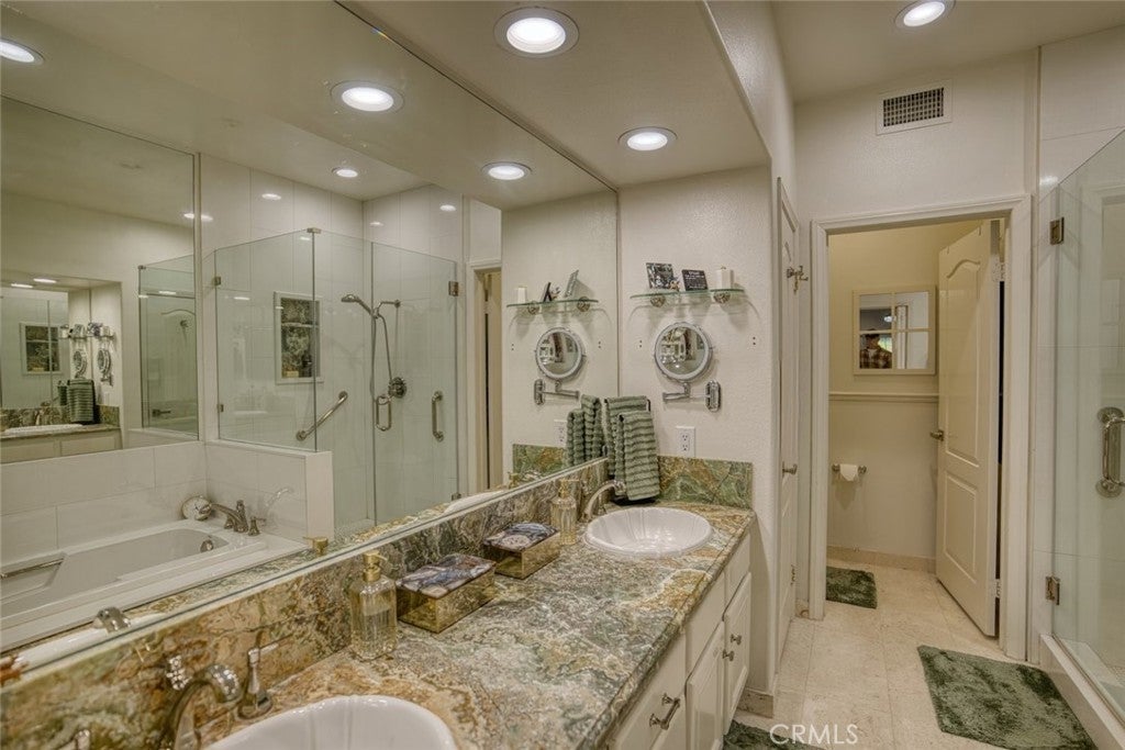 Discover one of the best golf course living in the highly sought-after gated Upland Hills community. This beautifully upgraded SINGLE story condo, shows like a model home with over $50,000 in upgrades .This 2-bedroom plus an office that is being used as a third bedroom is move-in ready. Enhancements include a new roof, new dual-pane windows and sliding doors, updated flooring throughout, recessed lighting, fresh interior paint, new ceiling fan light fixtures, expanded kitchen cabinetry for additional storage, and a beautifully updated bathroom vanity and mirror. The luxurious primary suite features a soaking tub, walk-in closet, and a spa-inspired ambiance perfect for relaxing. The oversized three-car garage offers ample parking and storage space, including room for a golf cart, adding to the convenience of living in this golf course community. Enjoy outdoor entertaining with a built-in BBQ and take advantage of the peaceful, well-maintained surroundings that make Upland Hills such a sought-after place to call home. This exceptional property blends style, comfort, and location into one impressive offering.