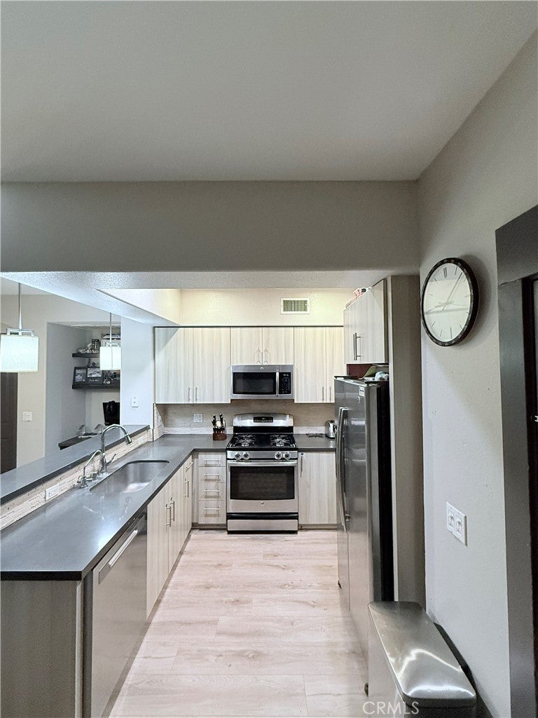 Discover modern comfort in this well-maintained ground-level 2-bedroom, 2-bath condo in the Madison Town Center. Featuring an open-concept layout with a modern kitchen offering stainless steel appliances, gray countertops and ample cabinetry flowing into a bright living area with a built-in desk and access to a covered patio. Luxury vinyl plank flooring enhances the main living spaces, while the primary suite includes generous closet space and a private bath with dual sinks. The secondary bedroom offers a walk-in closet, direct access to the full secondary bath, and its own patio entrance. A convenient laundry closet with side-by-side washer and dryer adds everyday ease. The location provides close proximity to Westfield Valencia Mall, shops, dining, scenic paseos, bike paths, nature trails, and nearby recreational destinations.