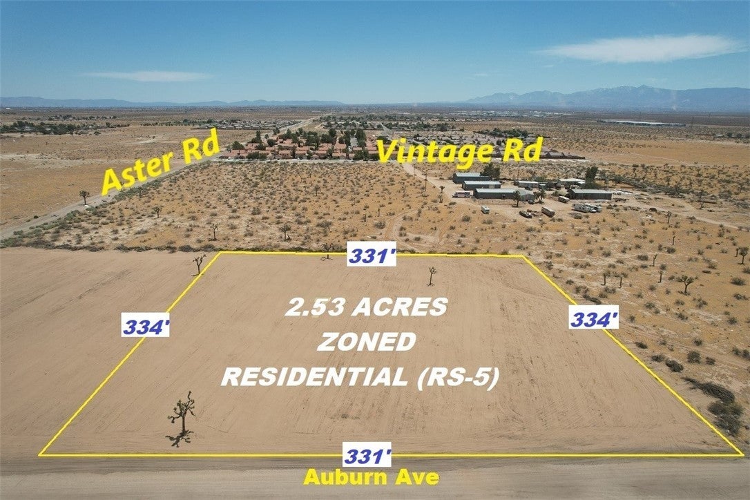 2.53 Acre Zoned Residential (RS-5) this lot will permit for up to 5 dwelling units per gross acre., a great clean and level lot, the perfect piece of land to build your dream home or provide ample space to build a community of homes, Water line on street on Auburn Ave, Electricity 400+,/- ft, paved Aster Rd is aproximately 1300ft from site, sewer line is about 1000 ft from site on Vintage Rd, Site is only 1.2 mile from US-395 Hwy for quick access to local amenities for future residents that include Adelanto Elementary School, Dollar General, City Hall, Richardson Park, US Post Office, and Adelanto Stadium and Event Center, Google maps coordinates to the location in the middle of the property are: 34.593722, -117.437583 this lot or lots represent an excellent investment opportunity. Don't miss out on this unique chance to own a piece of the desert.