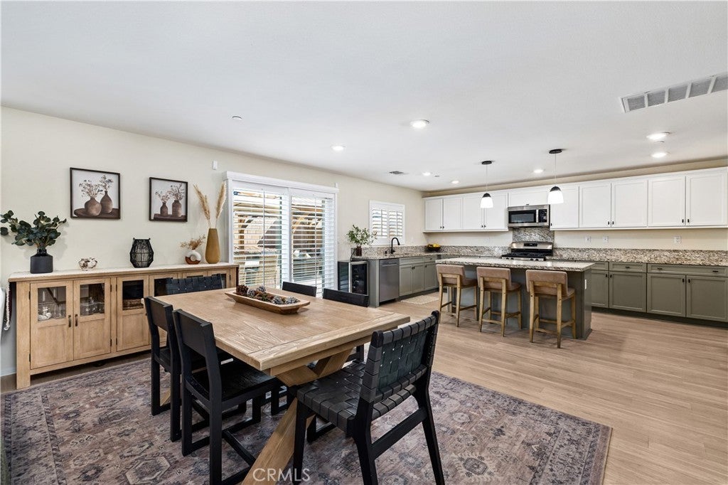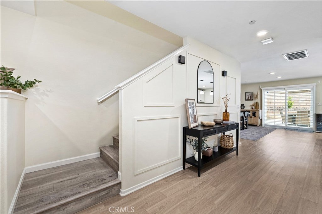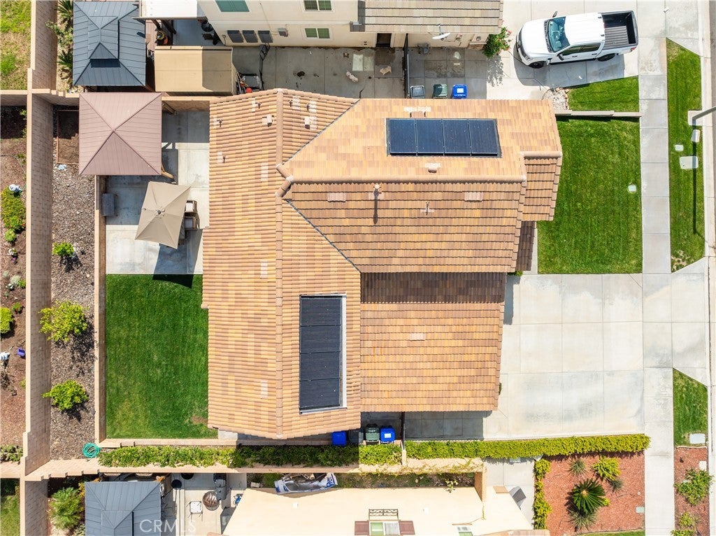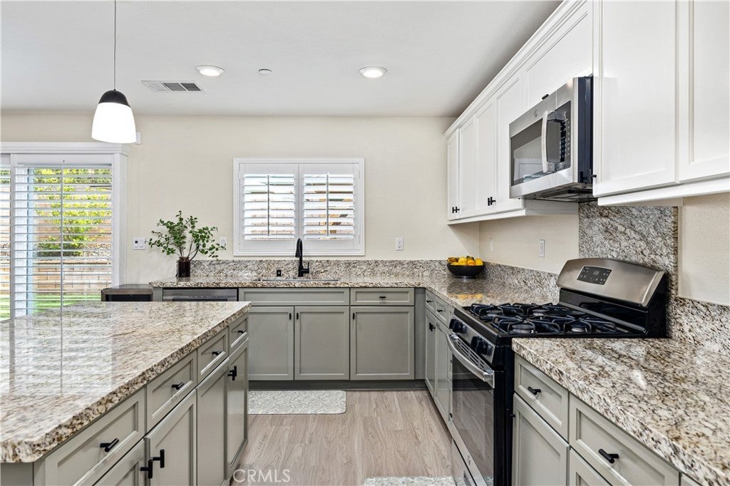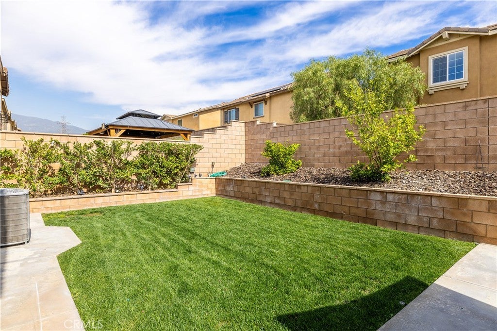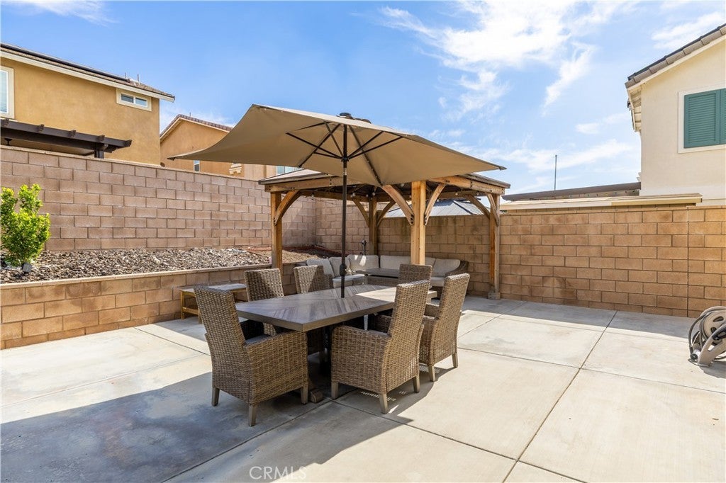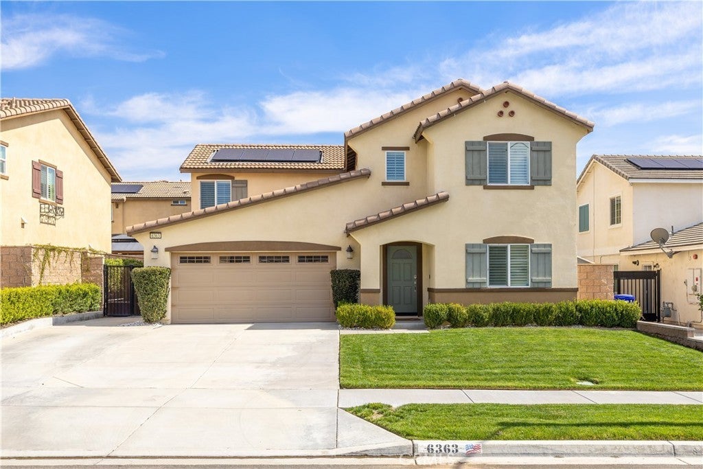 Beautifully upgraded North Fontana residence in the desirable Sierra Lakes area in the Etiwanda school district featuring a versatile floor plan, refined interior finishes, and a fully designed backyard built for outdoor enjoyment. Mediterranean-inspired architecture creates strong curb appeal with manicured landscaping, decorative shutters, a tile roof, and a covered arched entry leading to a wide driveway and two-car garage. Inside, the home opens to a bright entry featuring recessed lighting, wood-look flooring, and decorative wall molding. The layout expands into a spacious open-concept great room with recessed lighting and large windows with plantation shutters allowing abundant natural light. The kitchen is designed with both style and function in mind, offering a large center island with bar seating, granite countertops, shaker-style cabinetry with modern hardware, stainless steel appliances including gas range, microwave, dishwasher, and refrigerator, and a walk-in pantry. The kitchen flows seamlessly into the dining and living areas with sliding glass doors providing direct backyard access. A main-level bedroom provides flexibility for guests, office, or multi-generational living and is adjacent to a full bathroom with matte black fixtures, decorative wall paneling, and a glass-enclosed tiled shower. A dedicated laundry room offers countertop workspace and open shelving for storage. Upstairs, a spacious loft with wood-style flooring, ceiling fan, recessed lighting, and plantation shutters provides additional living space. The primary suite features wood-style flooring, ceiling fan, dual walk-in closets, and a sliding barn door entry to the en-suite bathroom with dual-sink vanity, quartz countertops, shaker cabinetry, matte black fixtures, framed mirrors, recessed lighting, and a glass-enclosed tiled shower. Additional bedrooms include plantation shutters and ceiling fans, with one offering a walk-in closet, while the upstairs hall bathroom features a quartz vanity, shaker cabinetry, matte fixtures, and a tub/shower. The backyard is designed for outdoor living with an extended concrete patio and a covered wood gazebo featuring a metal roof and string lighting creating defined lounge and dining areas. The yard also includes a grass lawn, raised planter beds with drought-tolerant landscaping, block wall fencing, and gated side-yard access with additional storage. The home is equipped with a leased solar system providing additional energy efficiency.