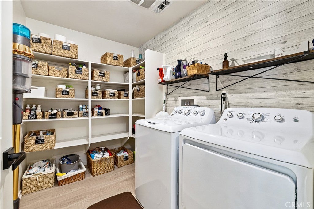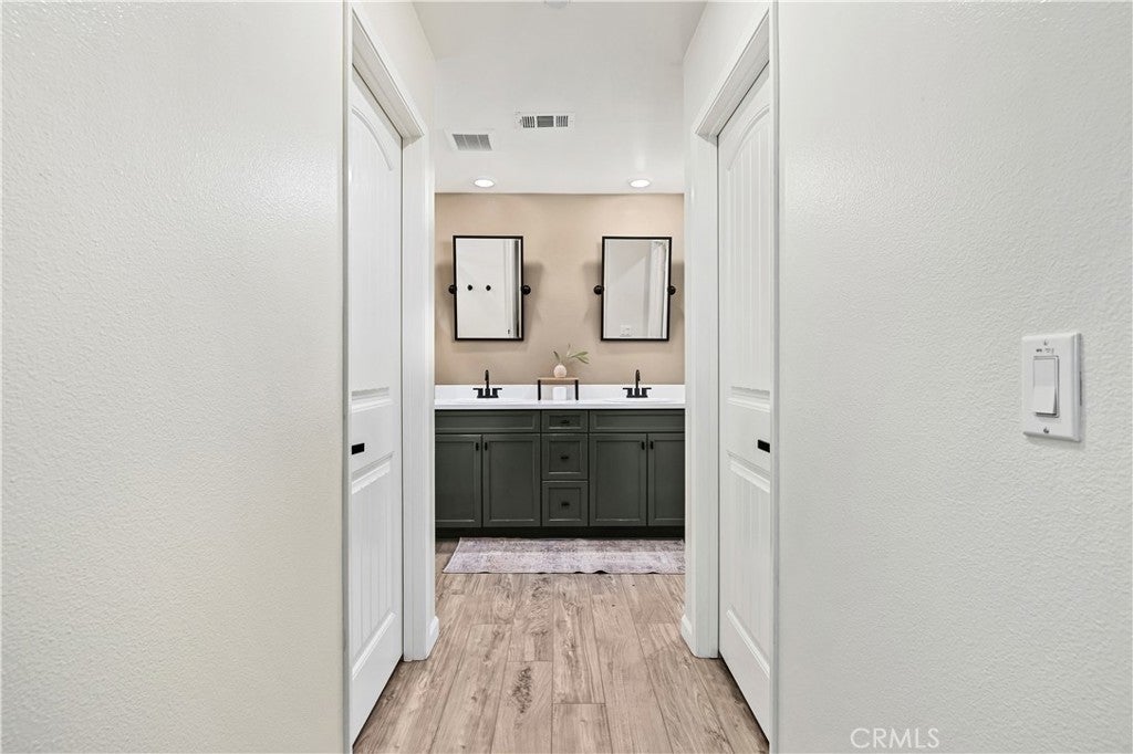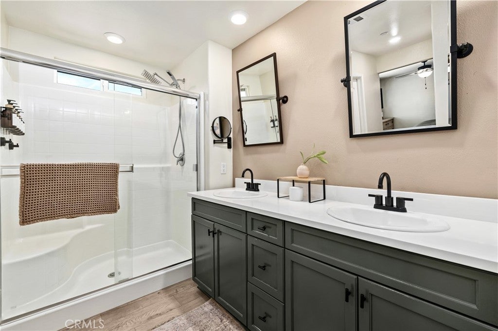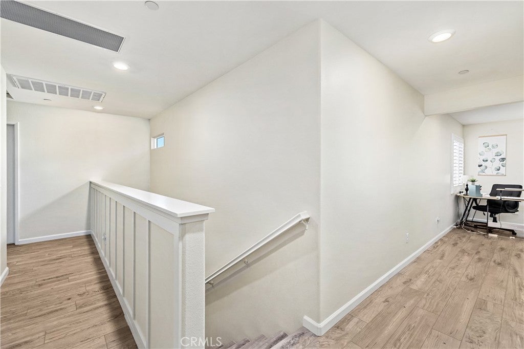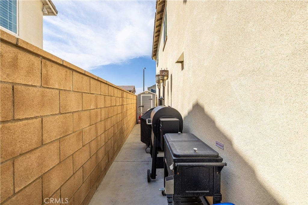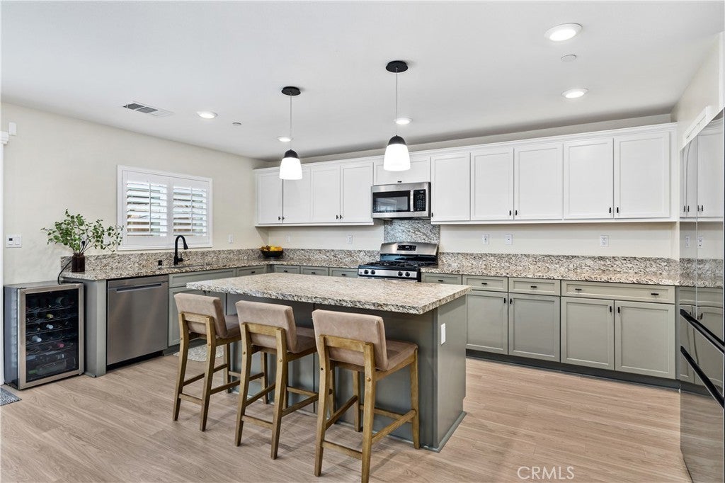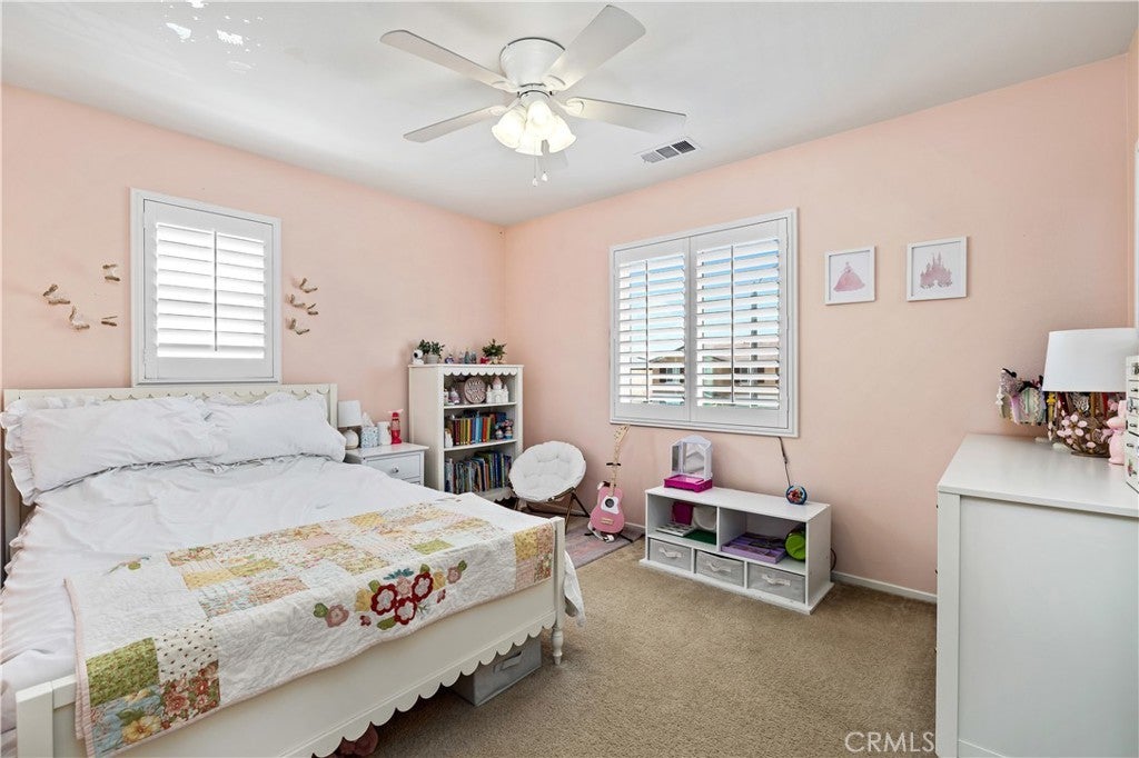 Beautifully upgraded North Fontana residence in the desirable Sierra Lakes area in the Etiwanda school district featuring a versatile floor plan, refined interior finishes, and a fully designed backyard built for outdoor enjoyment. Mediterranean-inspired architecture creates strong curb appeal with manicured landscaping, decorative shutters, a tile roof, and a covered arched entry leading to a wide driveway and two-car garage. Inside, the home opens to a bright entry featuring recessed lighting, wood-look flooring, and decorative wall molding. The layout expands into a spacious open-concept great room with recessed lighting and large windows with plantation shutters allowing abundant natural light. The kitchen is designed with both style and function in mind, offering a large center island with bar seating, granite countertops, shaker-style cabinetry with modern hardware, stainless steel appliances including gas range, microwave, dishwasher, and refrigerator, and a walk-in pantry. The kitchen flows seamlessly into the dining and living areas with sliding glass doors providing direct backyard access. A main-level bedroom provides flexibility for guests, office, or multi-generational living and is adjacent to a full bathroom with matte black fixtures, decorative wall paneling, and a glass-enclosed tiled shower. A dedicated laundry room offers countertop workspace and open shelving for storage. Upstairs, a spacious loft with wood-style flooring, ceiling fan, recessed lighting, and plantation shutters provides additional living space. The primary suite features wood-style flooring, ceiling fan, dual walk-in closets, and a sliding barn door entry to the en-suite bathroom with dual-sink vanity, quartz countertops, shaker cabinetry, matte black fixtures, framed mirrors, recessed lighting, and a glass-enclosed tiled shower. Additional bedrooms include plantation shutters and ceiling fans, with one offering a walk-in closet, while the upstairs hall bathroom features a quartz vanity, shaker cabinetry, matte fixtures, and a tub/shower. The backyard is designed for outdoor living with an extended concrete patio and a covered wood gazebo featuring a metal roof and string lighting creating defined lounge and dining areas. The yard also includes a grass lawn, raised planter beds with drought-tolerant landscaping, block wall fencing, and gated side-yard access with additional storage. The home is equipped with a leased solar system providing additional energy efficiency.