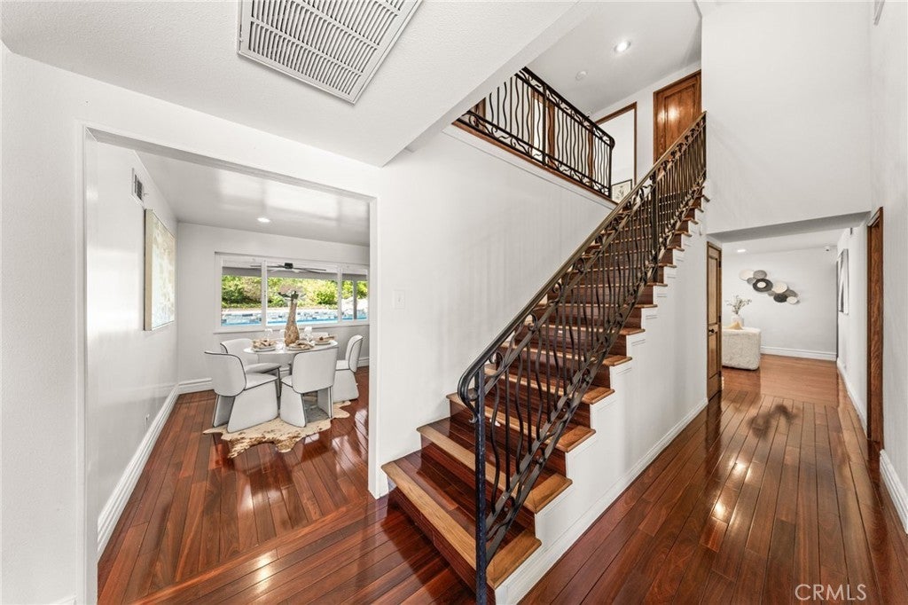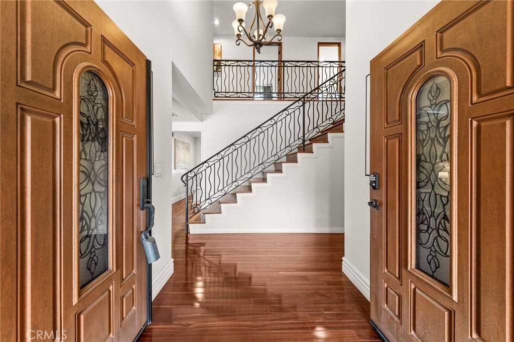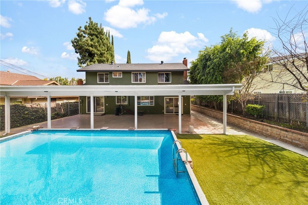 Welcome to this spacious two-story home located in a quiet neighborhood of Hacienda Heights. Situated on an approximately 8,308 sq ft lot, this property offers 4 bedrooms, 2.5 bathrooms (1 bedroom and 1.5 bathrooms downstairs), and about 2,085 sq ft of comfortable living space, designed for both everyday living and entertaining. Enter through the private wrought iron gate to the front courtyard. Step through the front entrance and you are welcomed by high ceilings that create a bright and airy atmosphere. The living room features a fireplace framed with marble tiles. The upgraded kitchen includes granite countertops and stainless-steel appliances, including a KitchenAid 5-burner cooktop, kitchen hood, and GE double ovens. Large newer double-pane vinyl windows allow natural light to fill the living spaces, enhancing the openness of the expansive living room and family room. The home features a primary suite conveniently located downstairs. The primary bathroom is upgraded with a large shower and a new vanity. Three bedrooms are upstairs. The house has many upgrades, including a newer Carrier air conditioning system for year-round comfort, newer vinyl windows and sliding doors, remodeled bathrooms, wood flooring throughout, a newer roof, and a newer water heater. The large backyard offers excellent space for relaxation and entertaining, featuring an extra-large patio perfect for outdoor dining and gatherings. An above-ground pool, which can easily be converted into a decorative koi pond or water feature, and the yard is surrounded by multiple fruit trees, creating a private, garden-like setting. Located on a small, quiet, and peaceful cul-de-sac, this home is conveniently close to the 60 Freeway, shopping, dining, and daily conveniences, while still offering a peaceful residential environment.